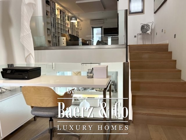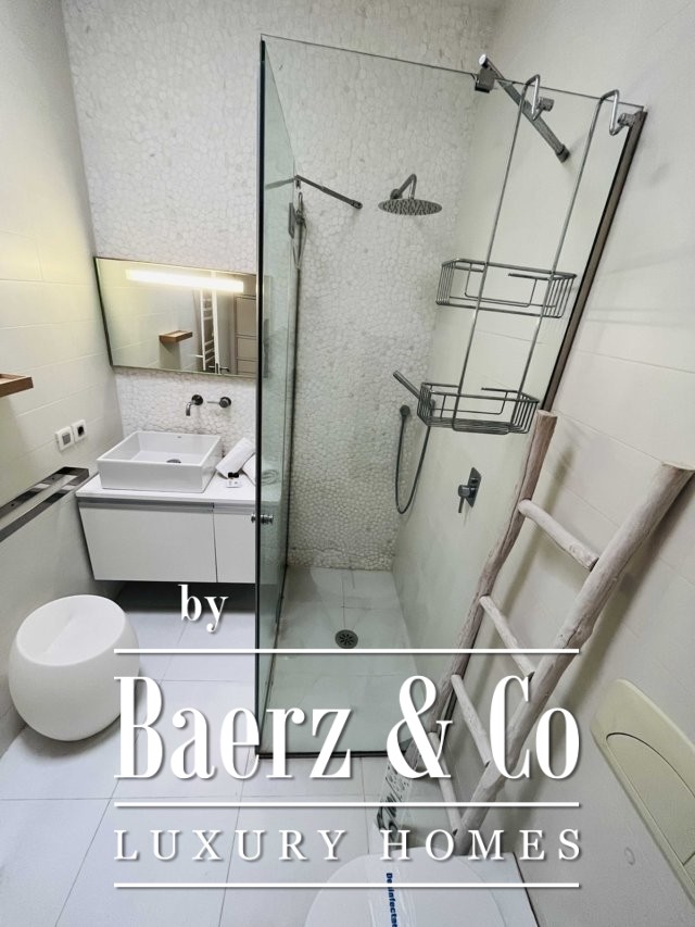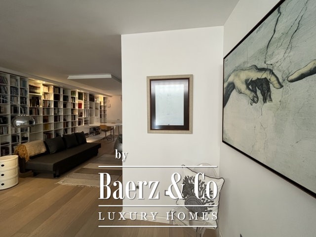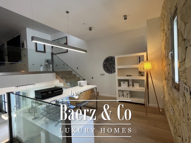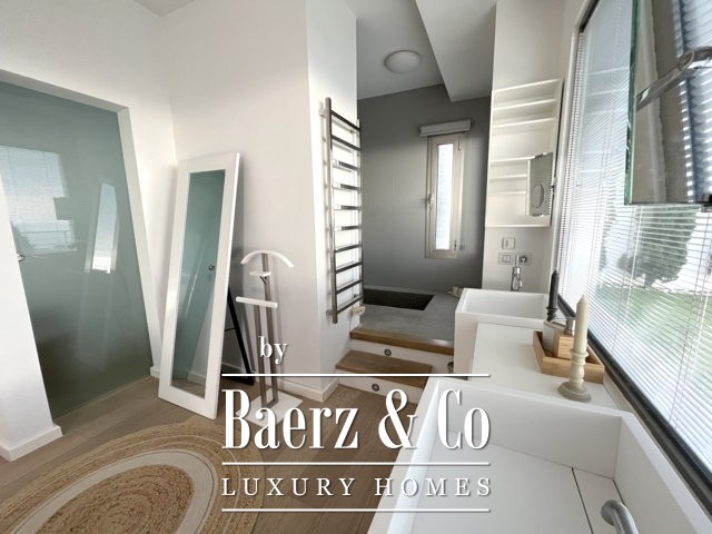 في الأعلى، يطفو مكتب الميزانين فوق المساحات المعيشية، بينما يضم الطابق العلوي مكتبة هادئة أو غرفة إبداعية، وغرفة نوم مزدوجة مع حمام داخلي، وتراسًا بمساحة 50 مترًا مربعًا يفتح على مناظر بحرية غير منقطعة. يوجد في الطابق السفلي صالة رياضية وغرفة موسيقى وصالة معيشة بإضاءة طبيعية ومساحات تخزين واسعة وجناح ضيافة خاص بمدخل خاص وتراس مشمس.