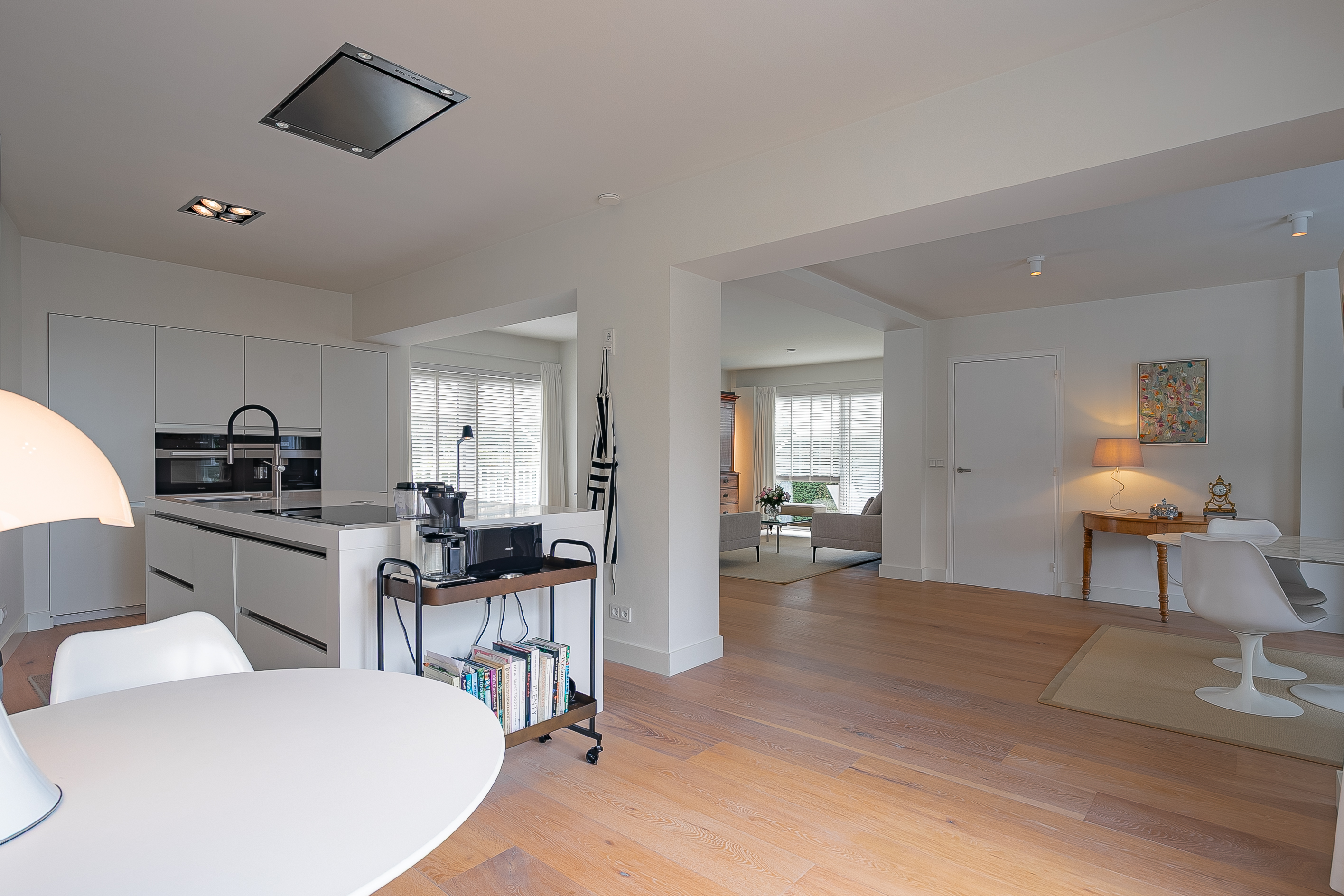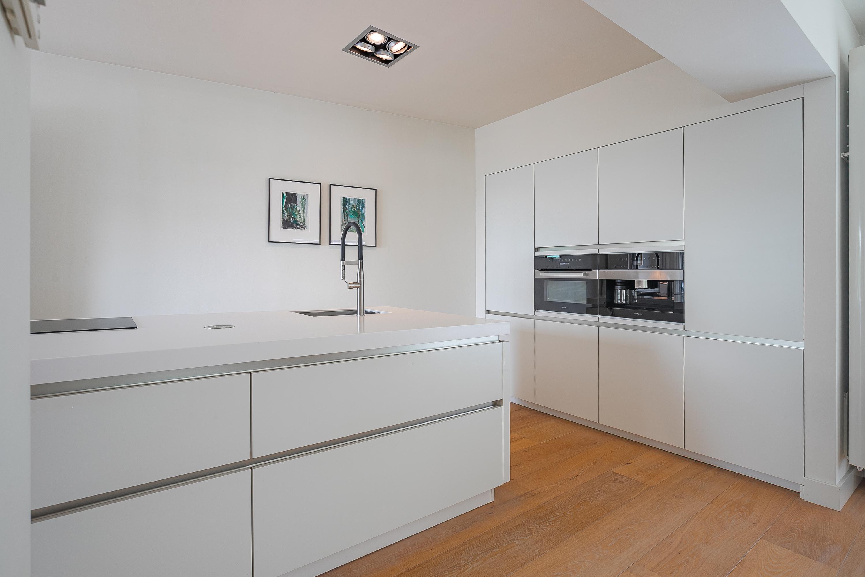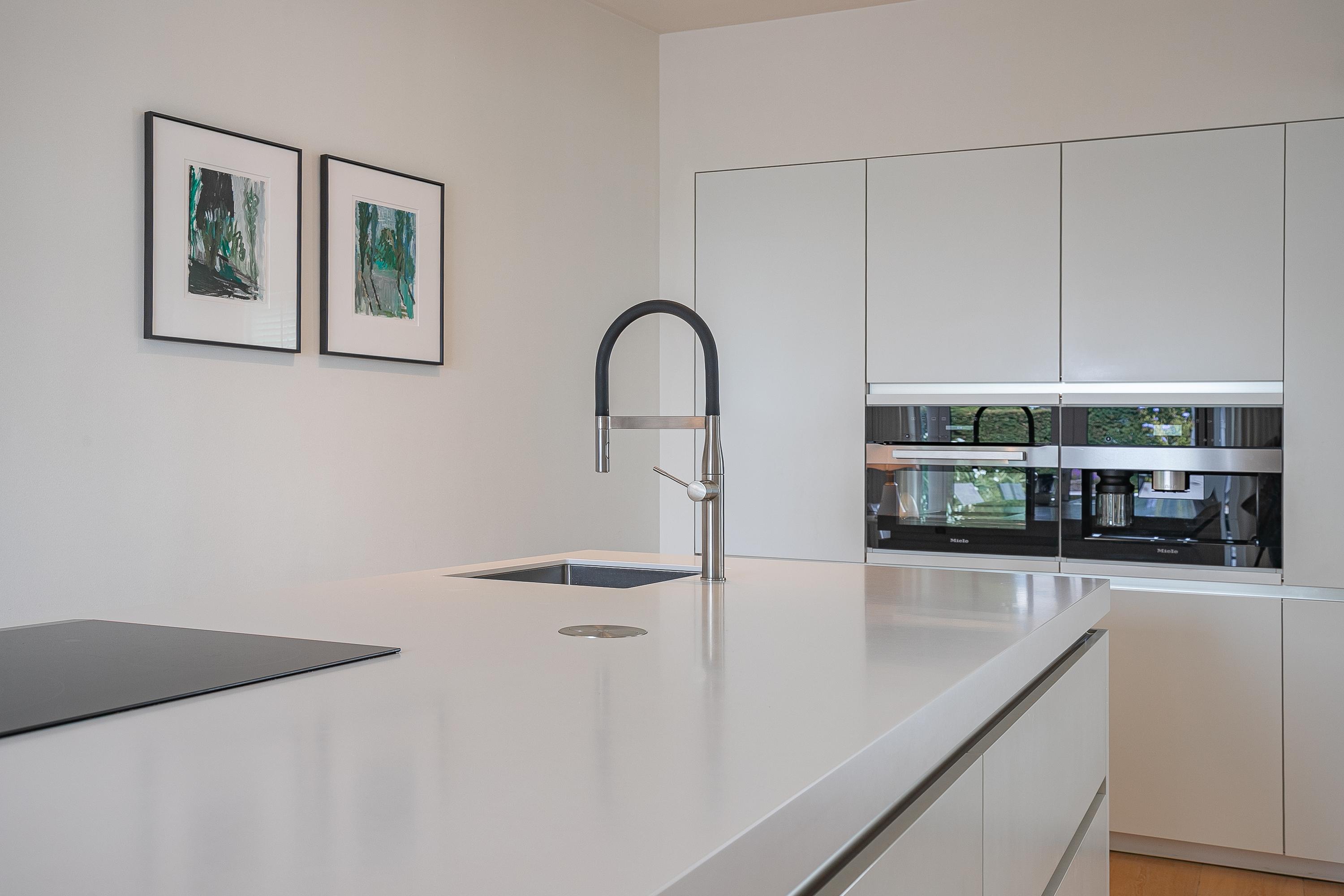 تركز الطابق الأرضي المفتوح على مساحة معيشة واسعة تبلغ حوالي 68م²، يميزها أرضية باركيه من خشب البلوط، ومدفأة غاز مخصصة من Faber، ومشعات مصممة خصيصاً. تضم المطبخ بدون مقابض سطح طهي اندكشن بخمس مناطق، وفرن حراري، وماكينة قهوة مدمجة، وأبواب منزلقة تطل على الحديقة، ما يمنح سهولة في الحياة اليومية والاستضافة. تنتقل منطقة المعيشة إلى حديقة حضرية خاصة مواجهة للشمال الشرقي وساحة أمامية خضراء تستقبل أشعة الشمس المسائية.