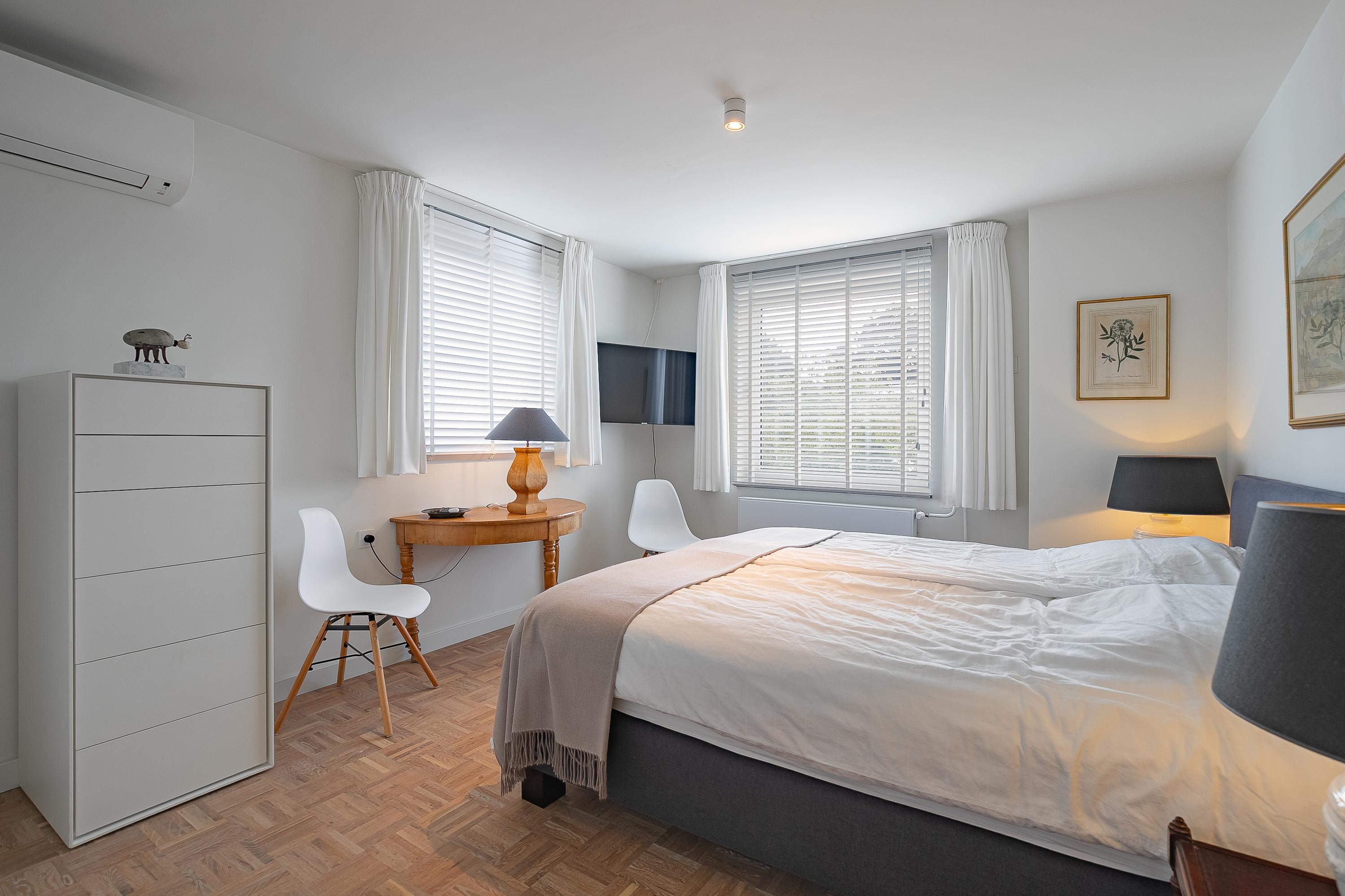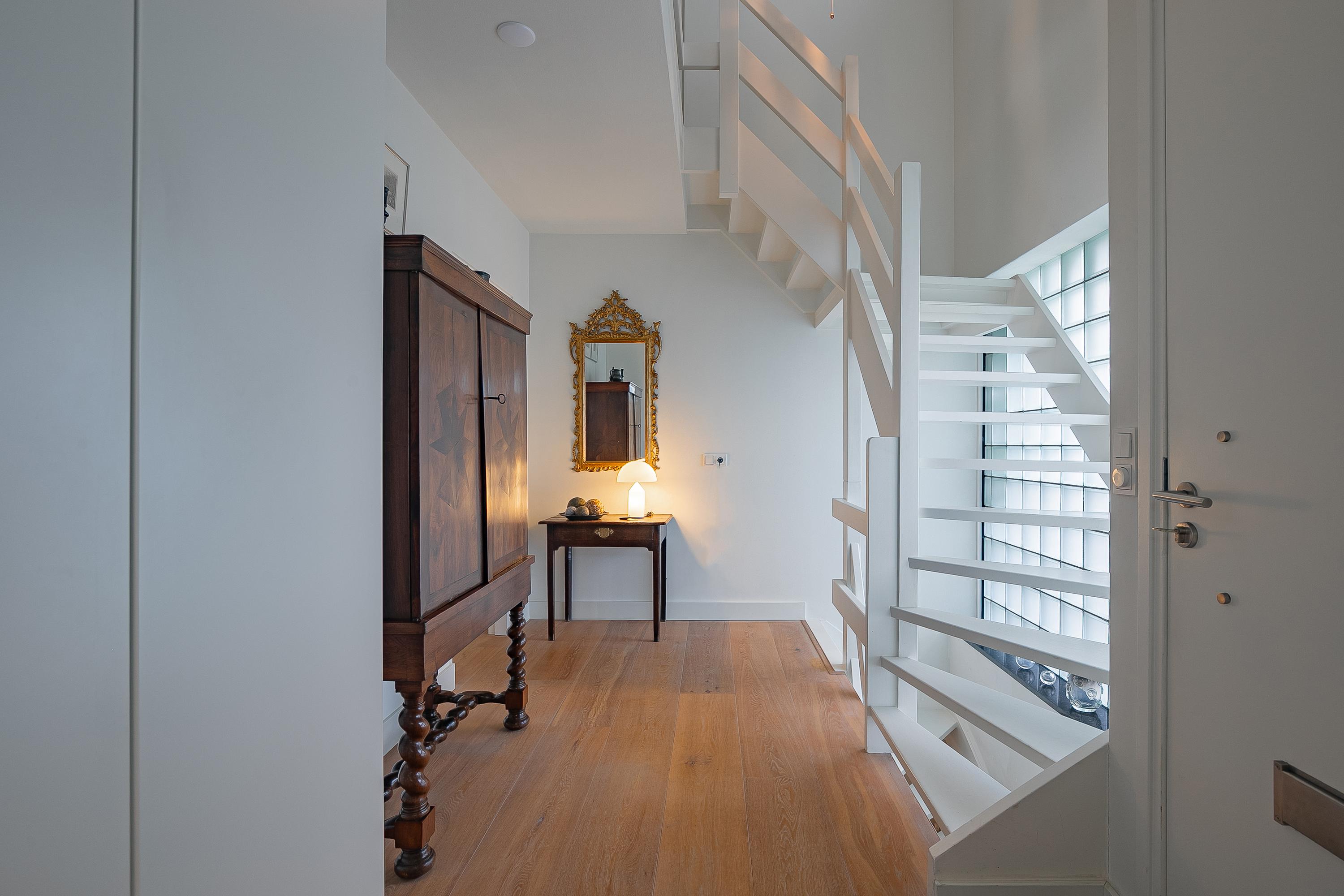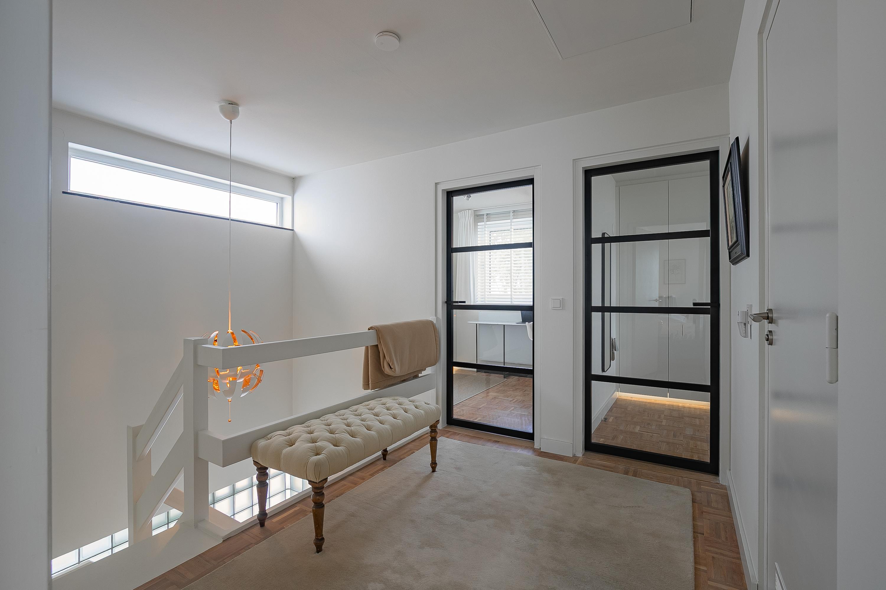 في الطابق العلوي، تكمل أربع غرف نوم خزائن مصممة خصيصاً من Slangen Interieurbouw وأرضية باركيه بنمط الفسيفساء. يحتوي الحمام على دش مشي وحوض استحمام، وتهوية ميكانيكية، وتدفئة أرضية. تستفيد غرفة النوم الرئيسية من مكيف هواء؛ وتتوفر حلول تخزين واسعة مع قبو كبير يضم جراجاً بمساحة 33م² وغرف خدمات، إضافة إلى مساحة تخزين في السطح.