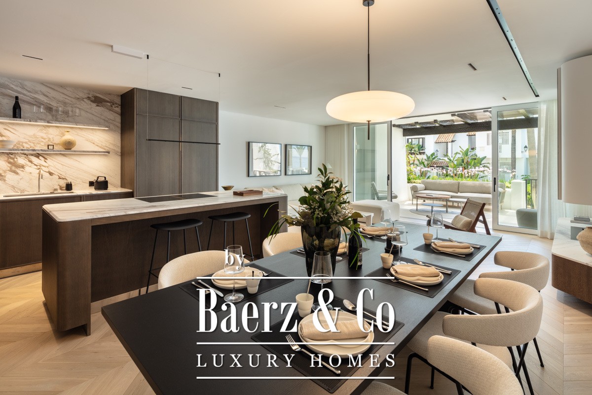 تقع شقة Marbella Golden Mile داخل منتجع Puente Romano حيث يشكل الضوء وهواء البحر بيئة راقية تتميز بالهدوء. تقدم هذه الشقة البالغة مساحتها 138 م² مساحة معيشة مفتوحة ومضيئة، وترتكز على أبواب زجاجية تمتد من الأرض حتى السقف، لتسمح للتراس وحدائق المجتمع والإطلالات الساحلية بالاندماج بسلاسة مع الداخل. يعكس تداخل الدرجات الحيادية والخشب الطبيعي الأرضية الطابع المتوسطي المحيط، ما يضفي أجواء من الهدوء في جميع الأنحاء الخاصة والعامة.