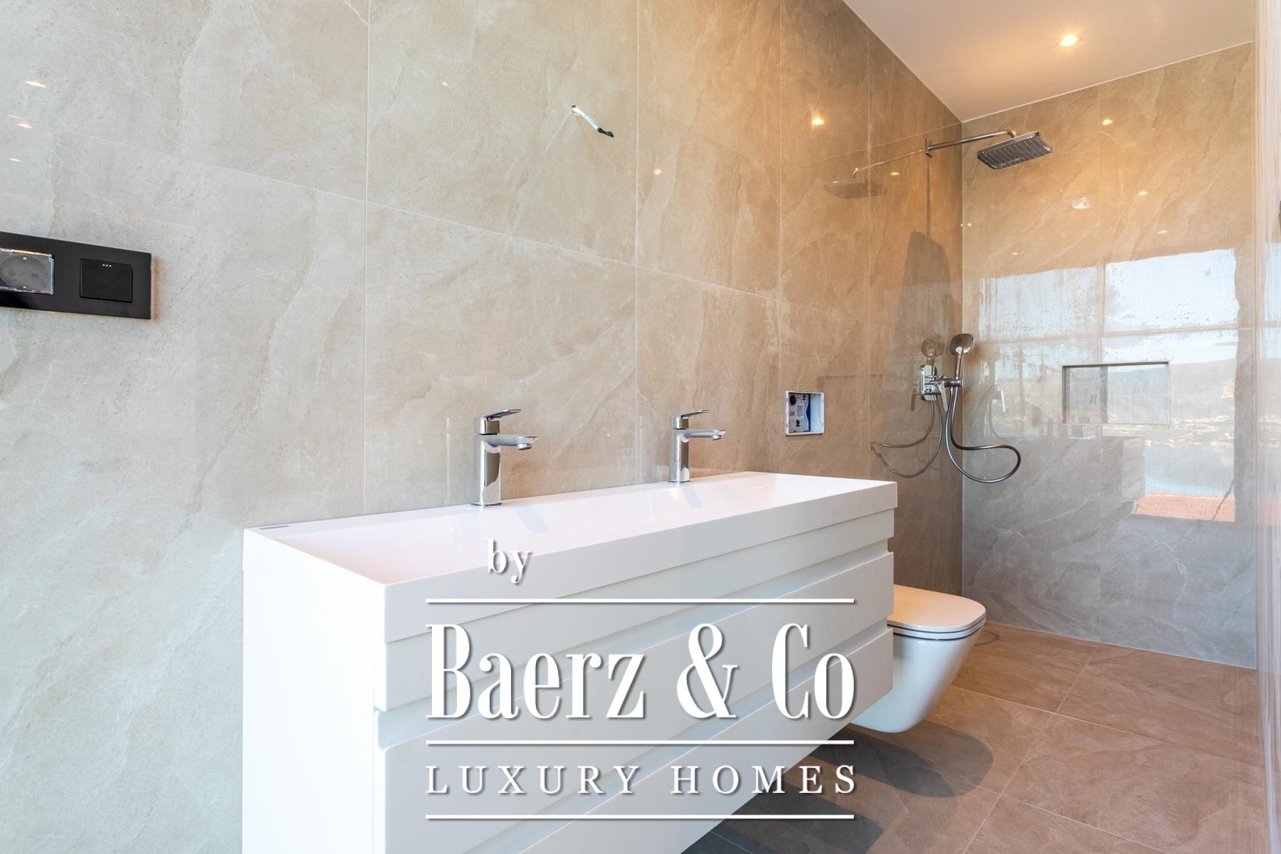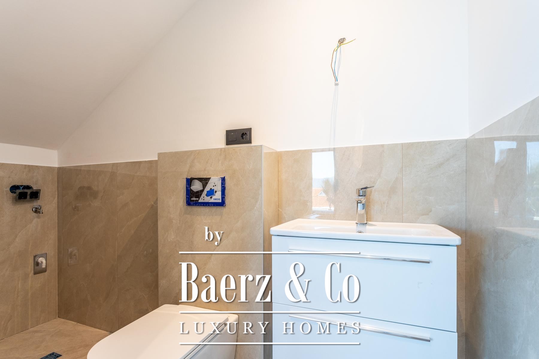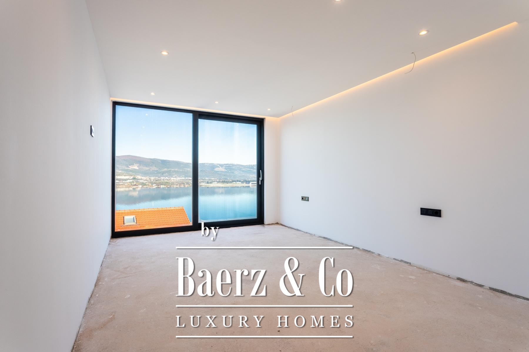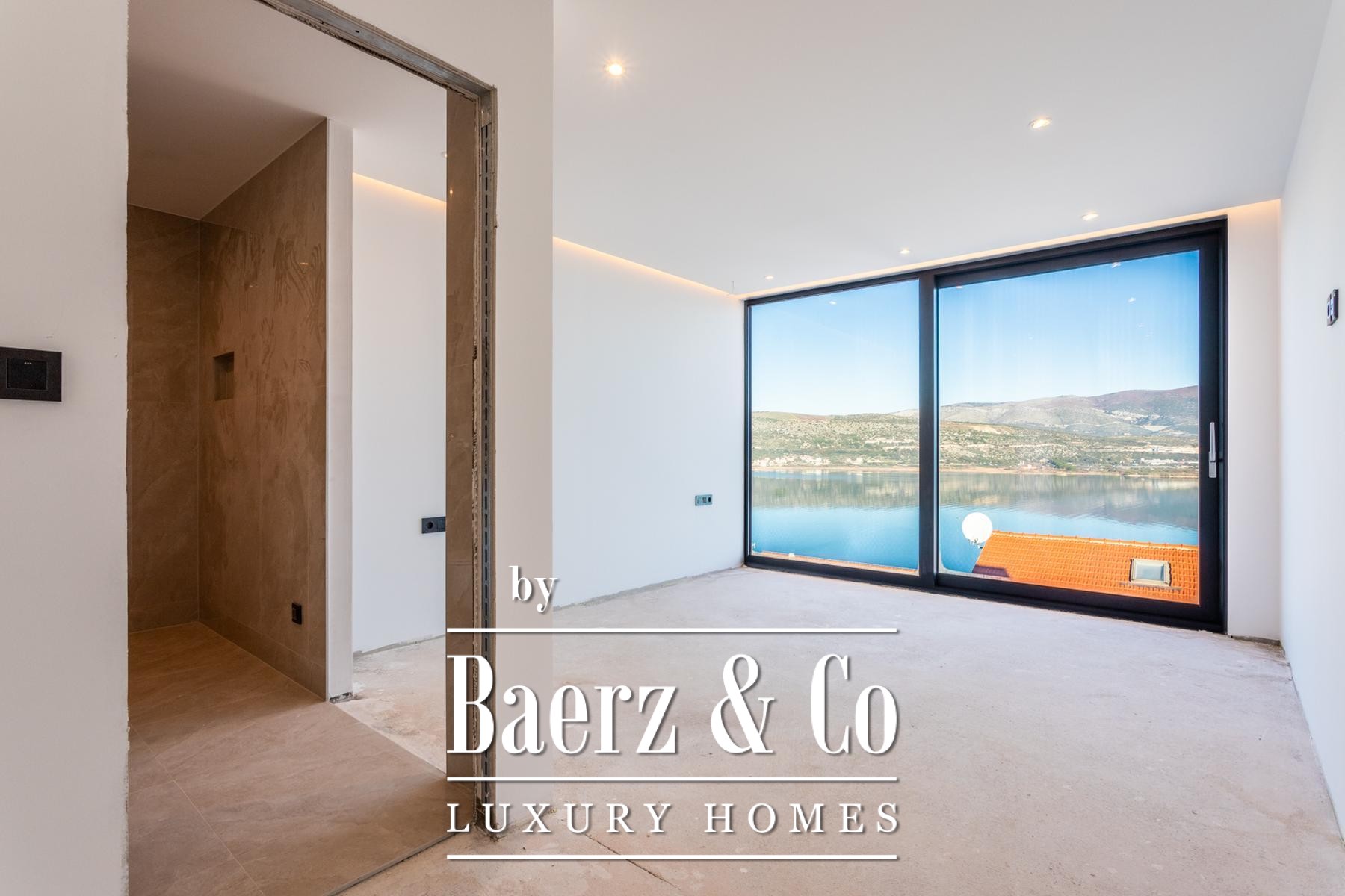يضفي ممر داخلي ومرحاض ضيوف مجهز بمرافق غسيل وغرفة متعددة الاستخدامات—مناسبة كمكتب أو صالة ألعاب رياضية أو غرفة ألعاب—لمسة من التوجيه المدروس على تخطيط هذا المستوى الرئيسي. في الأعلى، تتمتع ثلاث غرف نوم بحمامات داخلية ونوافذ زجاجية كاملة، تقدم إطلالات بانورامية على الأدرياتيكي في كل اتجاه.