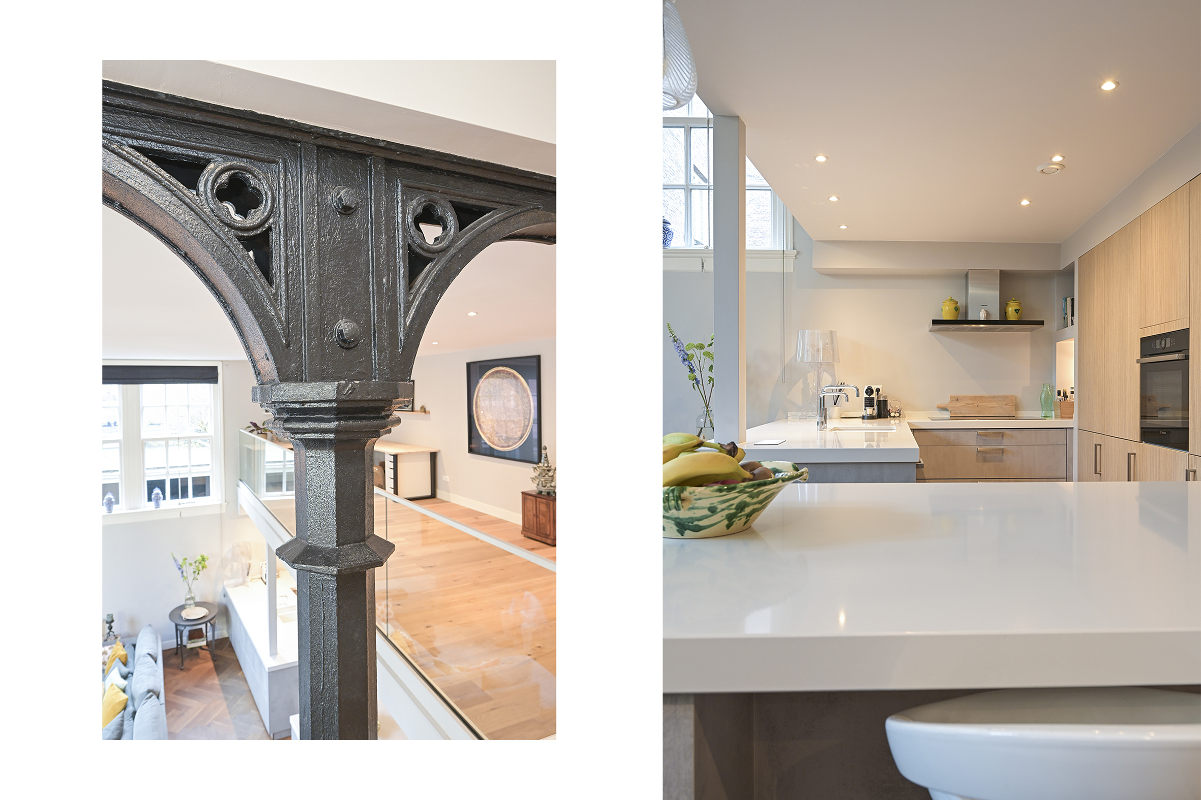 Achter de historische gevel bevindt zich deze royale en lichte woning welke beschikt over drie ruime slaapkamers, twee moderne badkamers en een indrukwekkende living van ca. 70 m². De hoge plafonds en de open vide versterken het gevoel van ruimte. Openslaande deuren naar de binnenplaats met eigen terras op het zuiden geven veel vrijheid en privacy. Heel veel privacy mede omdat ‘s avonds en in het weekend het toegangshek gesloten is.