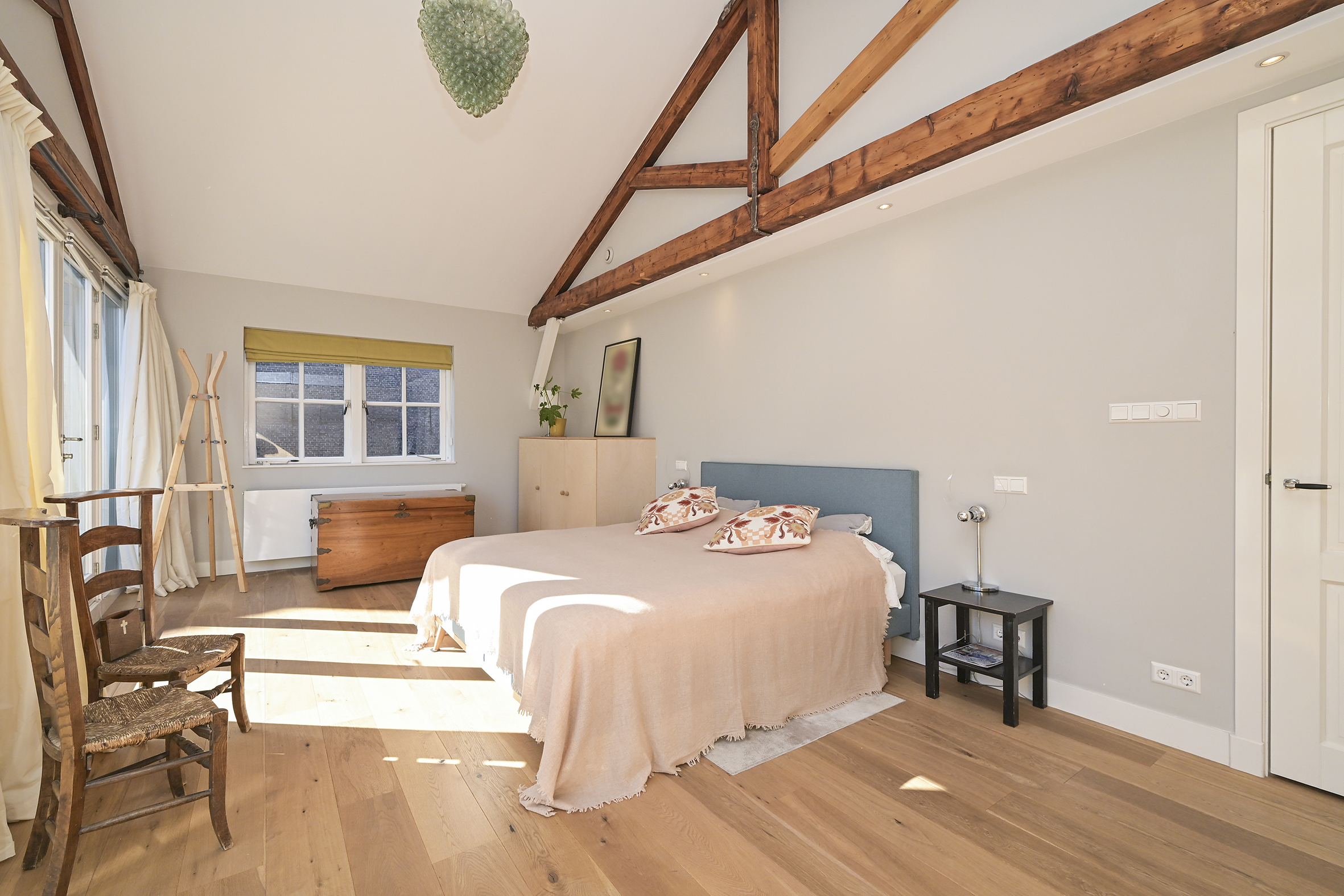 Behind the historic facade lies this spacious and bright home, which features three large bedrooms, two modern bathrooms, and an impressive living room of approximately 70 m². The high ceilings and open loft enhance the feeling of space. French doors leading to the courtyard with its own south-facing terrace offer a sense of freedom and privacy. This privacy is particularly high, partly because the entrance gate is closed in the evenings and on weekends.