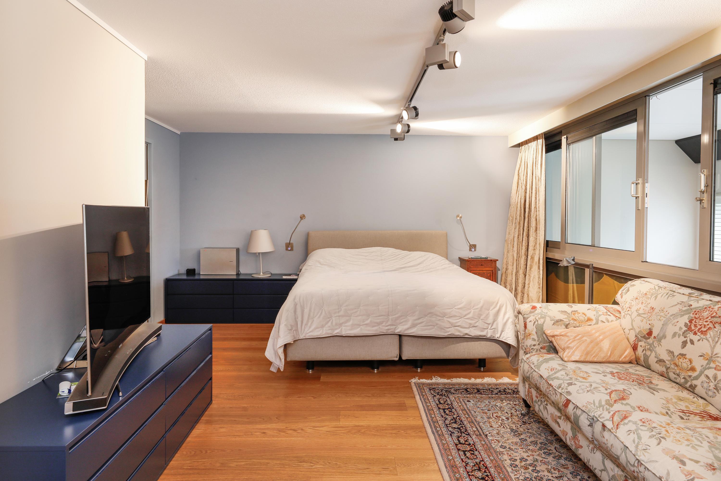 The easy-access staircase leads to the sleeping area. This staircase could easily be fitted with a lift if desired for those with reduced mobility. The mezzanine is so large that the seller has installed a comfortable, functional reading chair. There's also a sofa bed for guests or a helper (which will remain). The wall of cabinets provides ample storage space and good privacy from the stairs. If necessary, a door to the dressing room could be made for an extra bedroom.