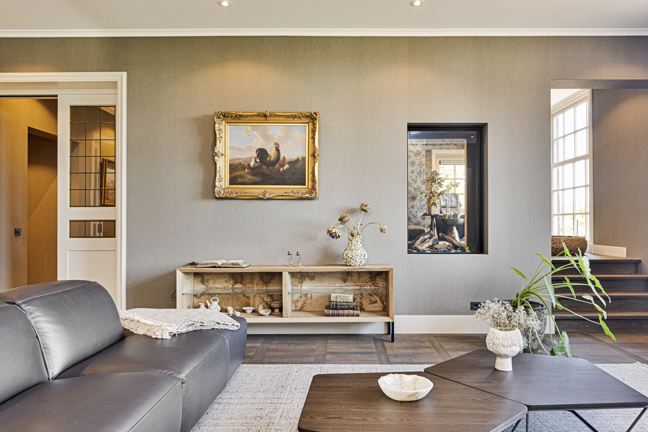 The living room has a magnificent floor; it is an old castle floor from the French chateau of the previous owners. The current residents had it beautifully sanded and coated with a refined gray floor oil, blending seamlessly into the contemporary interior. The music room is a room en-suite, separated from the living room by sliding doors, and now has the role of an old-fashioned art cabinet, but one whose indoor climate can be adjusted entirely as desired. If you do not have a Steinway or art collection to display here, then this is a wonderful study, library, cinema or dining room. To the left, overlooking the garden and side terrace, is the upstairs room, which shares a gas fireplace with the living room. A lovely corner to crawl away with a good book.