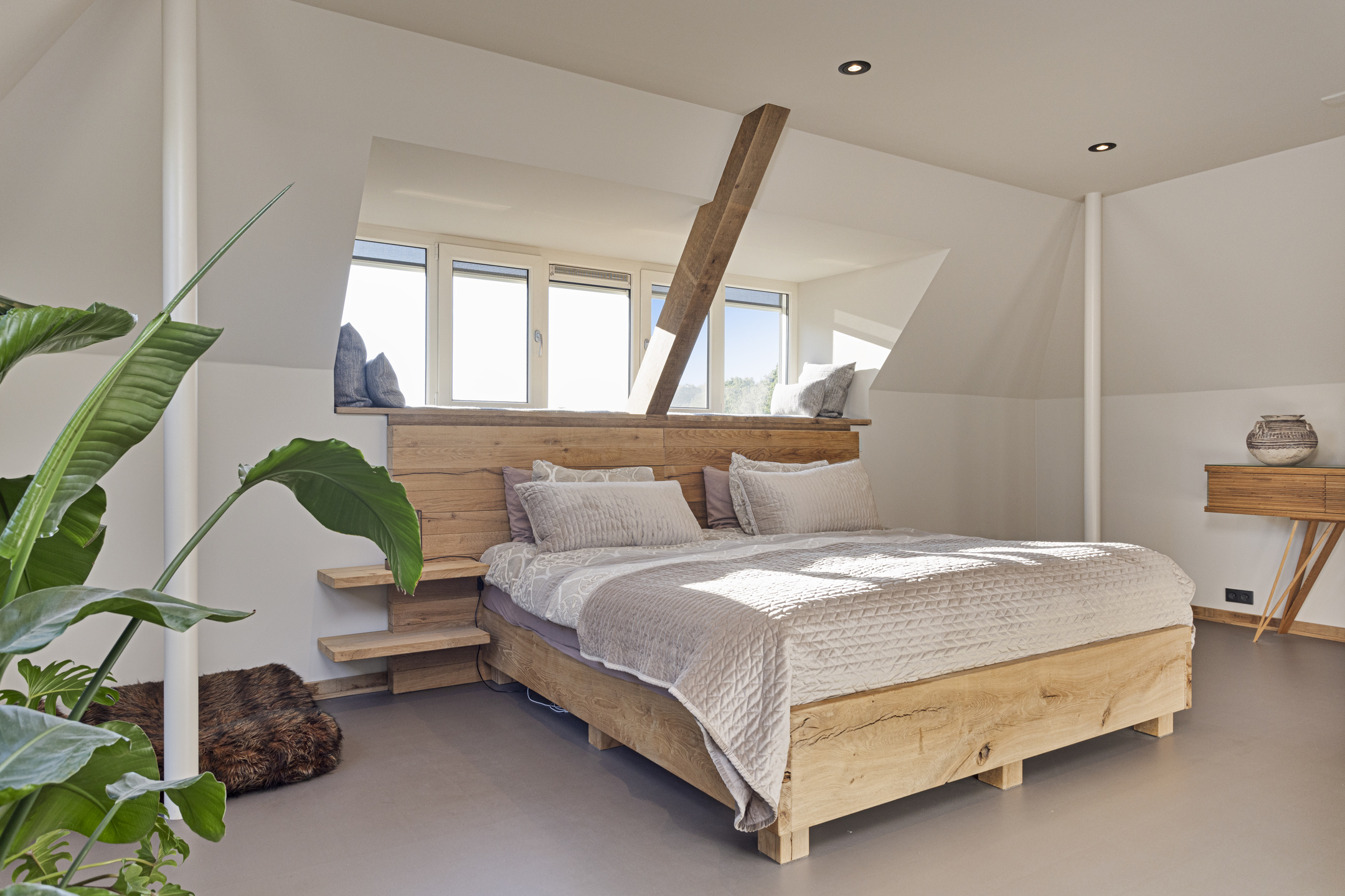 The walk-in closet has flamed wooden sliding doors and the bedroom is bright due to the large windows. The sleek design gives this room a particularly serene feel.
