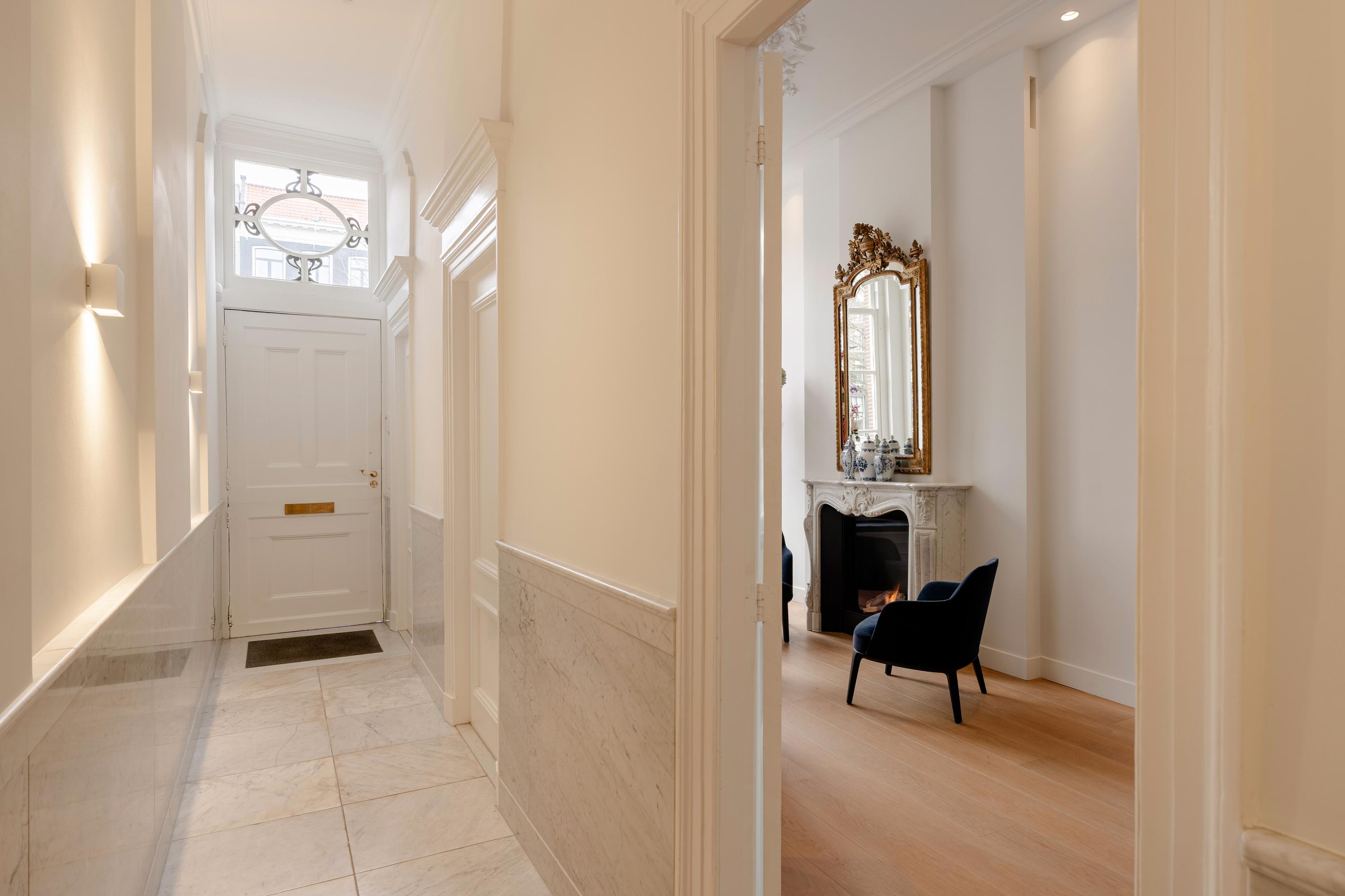Via de bel-etage betreedt u de woning, waar het uitzonderlijke oog voor detail direct voelbaar is. De ontvangsthal is volledig uitgevoerd in marmer en voorzien van originele marmeren vloertegels, wat zorgt voor een indrukwekkende entree. In de gehele woonkamer zijn verfijnde plafondornamenten zichtbaar die de klassieke allure van het pand benadrukken.
