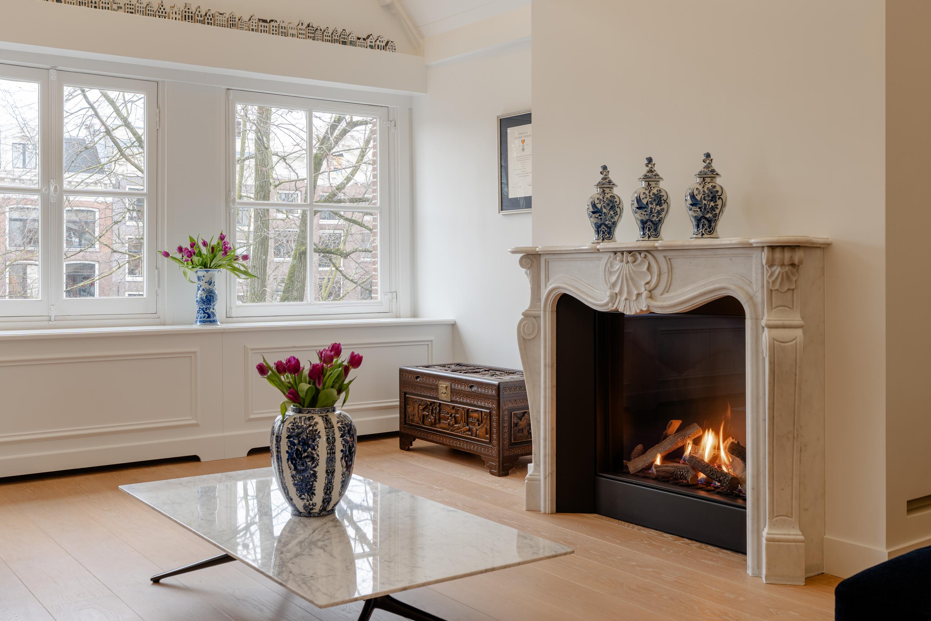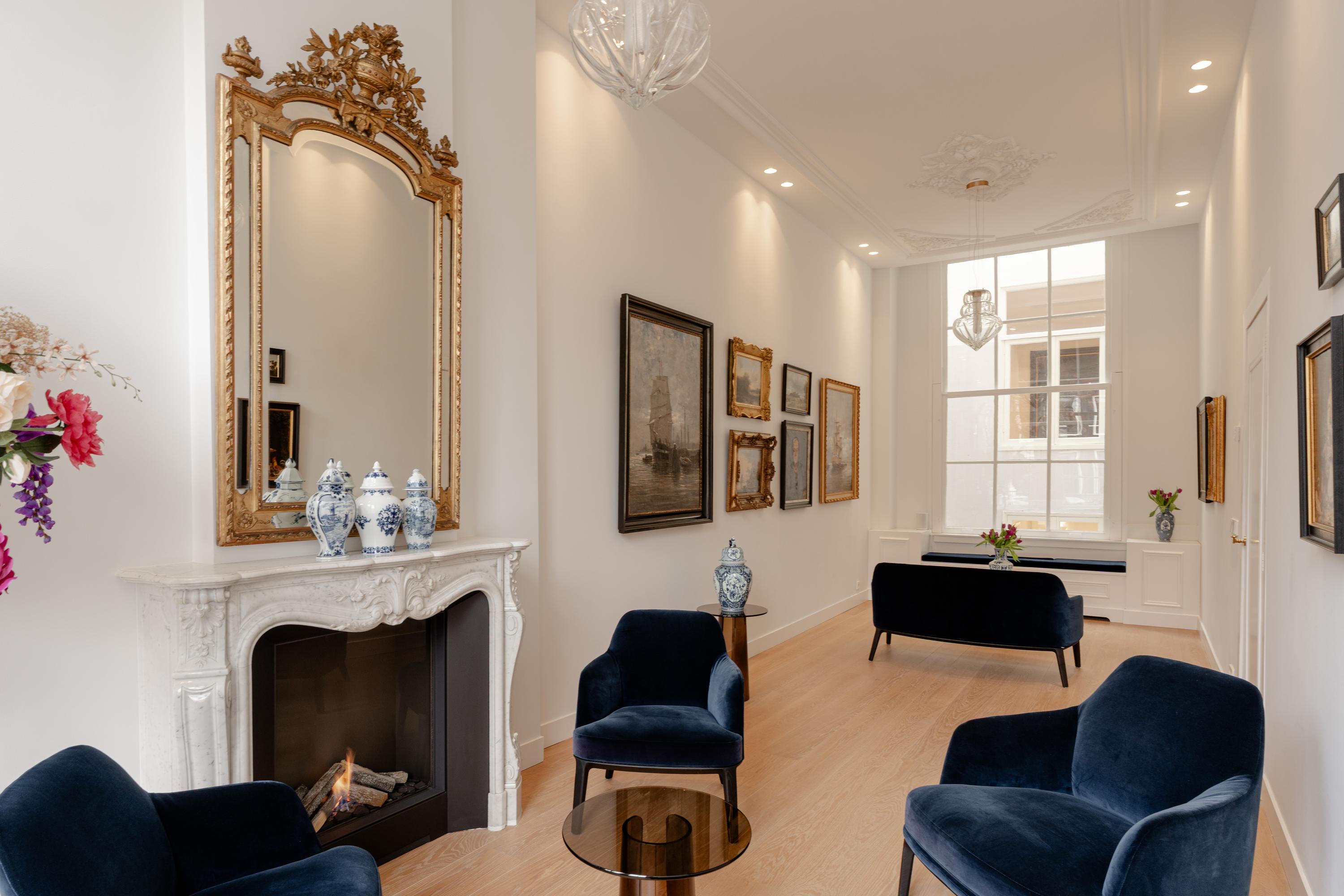 Aan de voorzijde bevindt zich de representatieve woonkamer, ingericht als stijlvolle ontvangstruimte. Blikvanger is de 19e-eeuwse marmeren schouw van Piet Jonker, die prachtig contrasteert met de lichte afwerking en het maatwerk interieur.