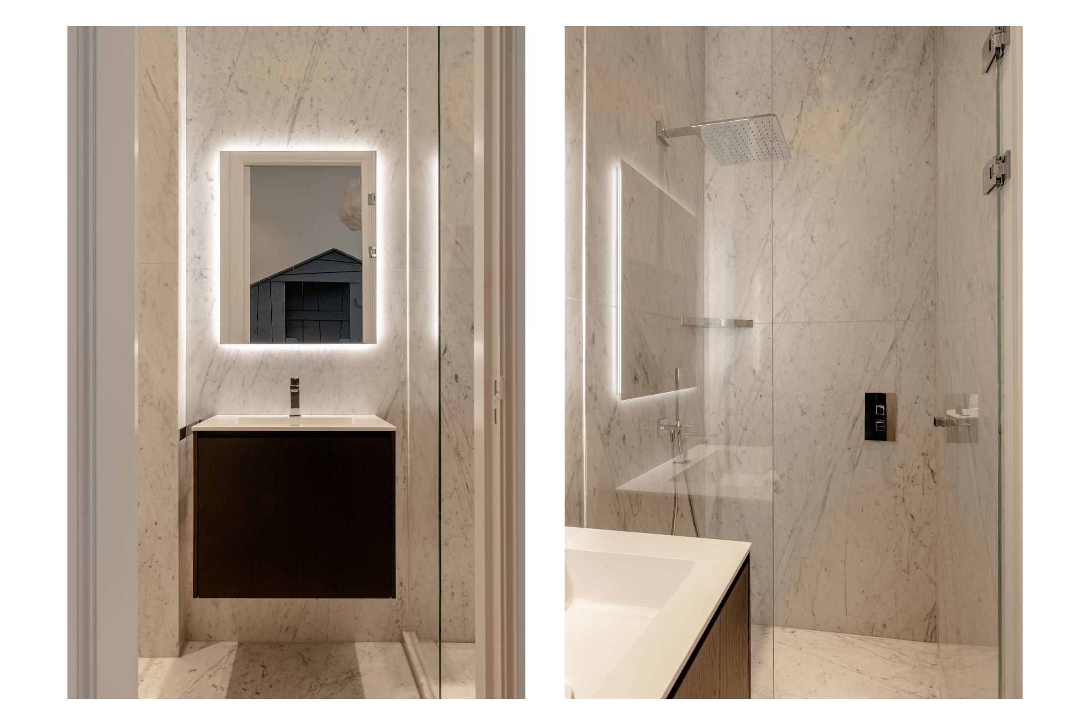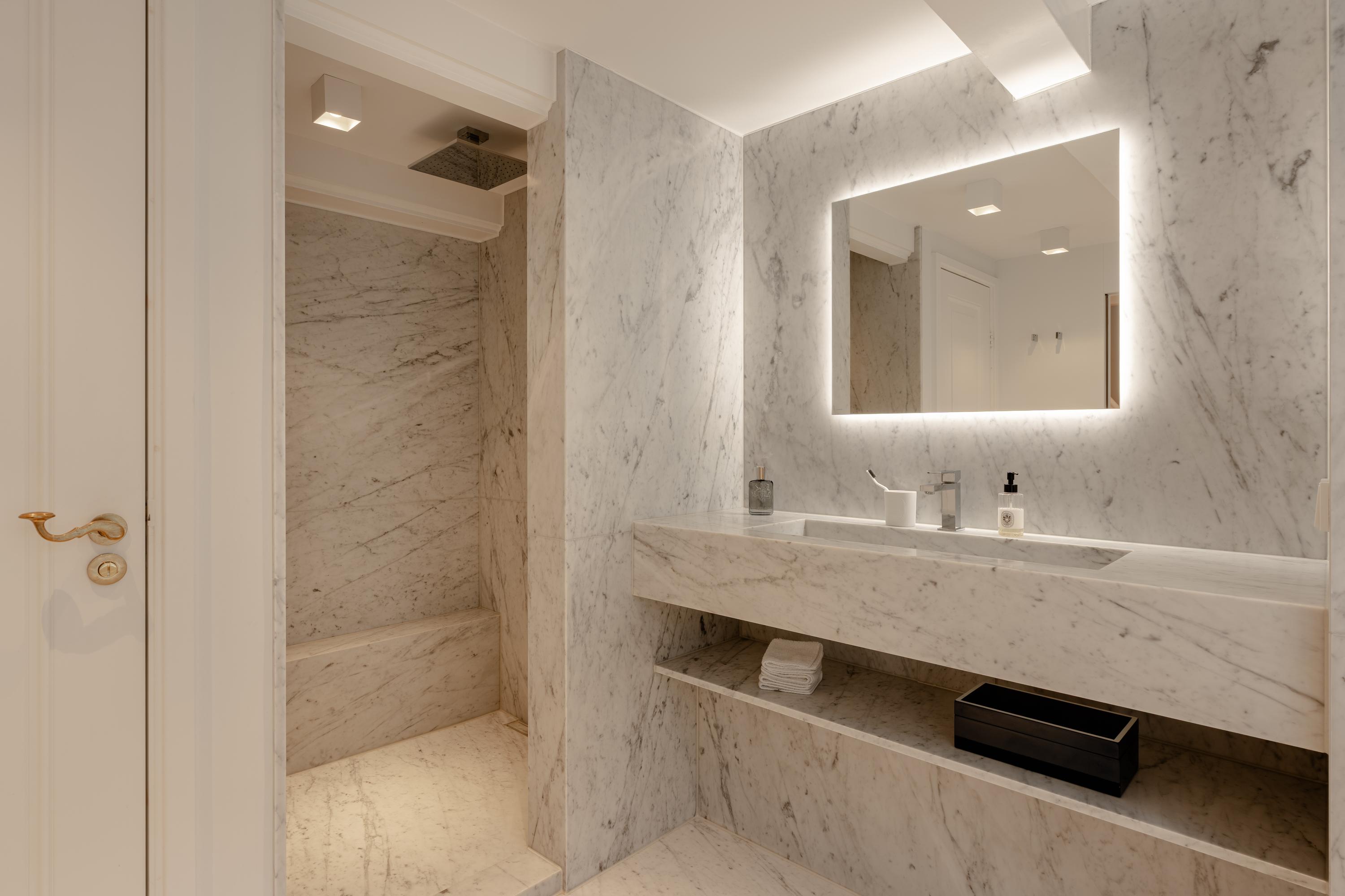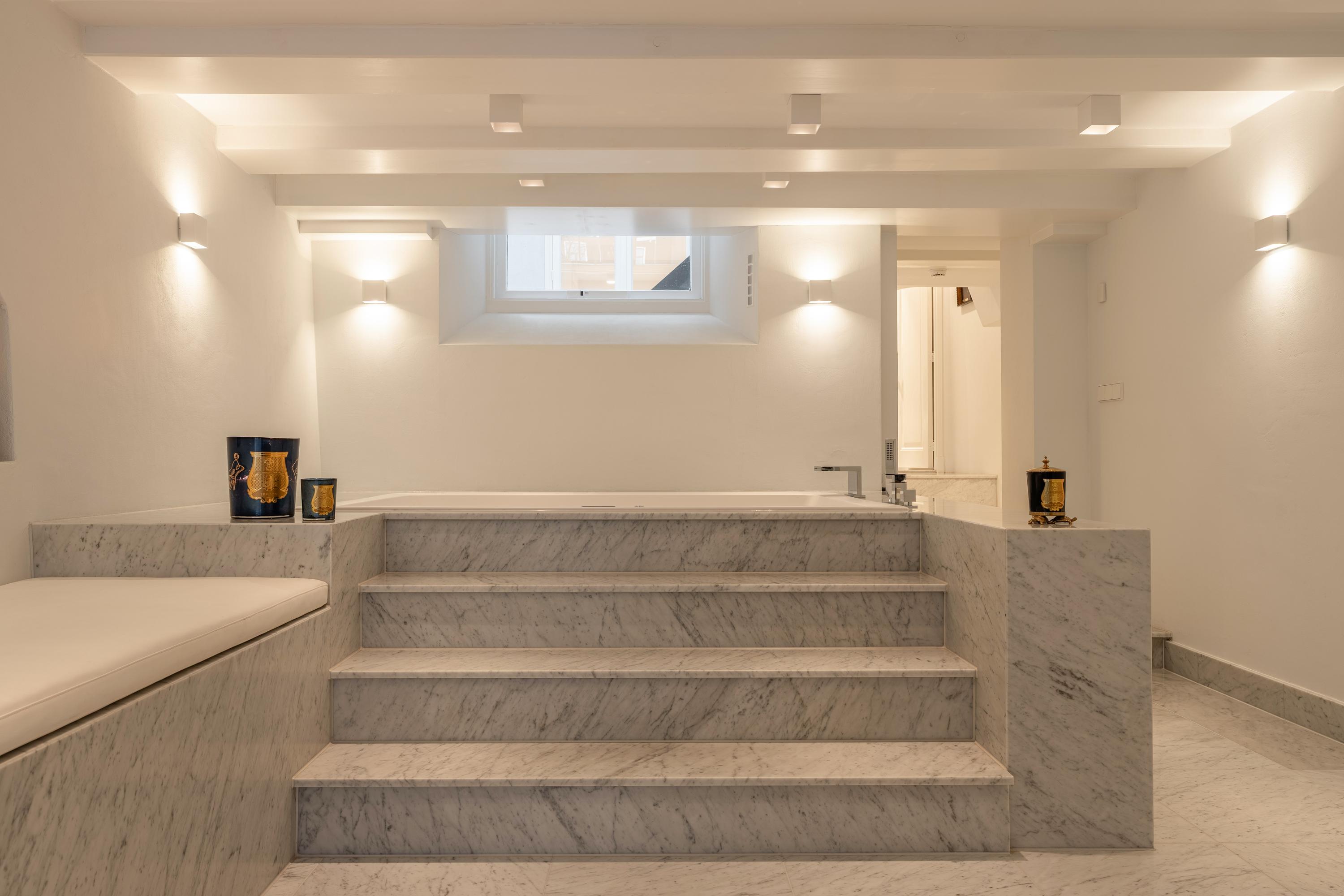 Het souterrain vormt een volwaardige woonlaag waarin luxe, comfort en ontspanning centraal staan. Een zeldzame wellnesservaring in het hart van de Amsterdamse grachtengordel. Deze verdieping is afgewerkt met Carrara marmer van Jan Reek (Italië), toegepast in alle badkamers en de wellnessruimte, en straalt rust en exclusiviteit uit.
