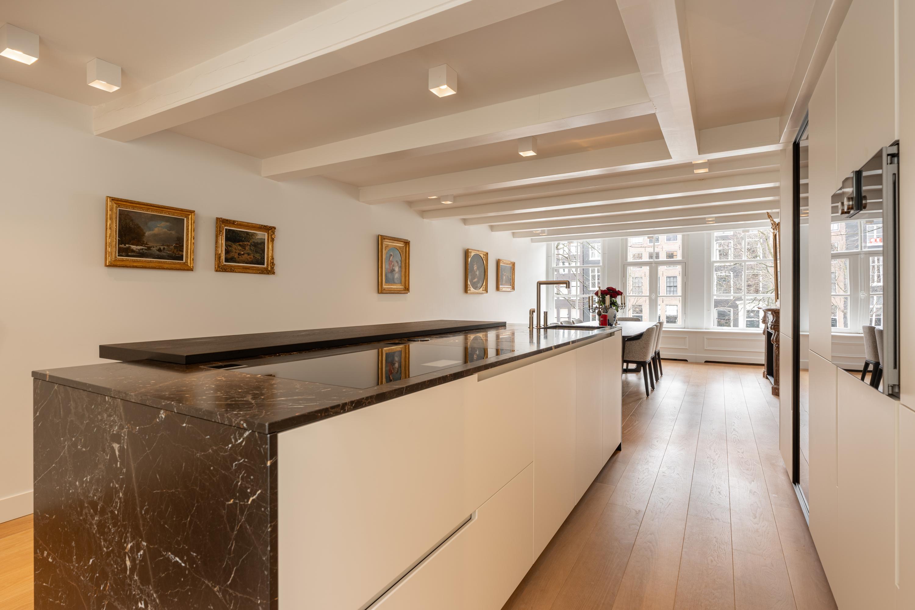 Op de eerste verdieping bevindt zich de woonkeuken met aangrenzend de eetruimte, met prachtig uitzicht over de gracht. De op maat gemaakte keuken van Poliform is uitgevoerd met een exclusief werkblad van Saint Laurent-marmer en heeft een luxe, donkere uitstraling.