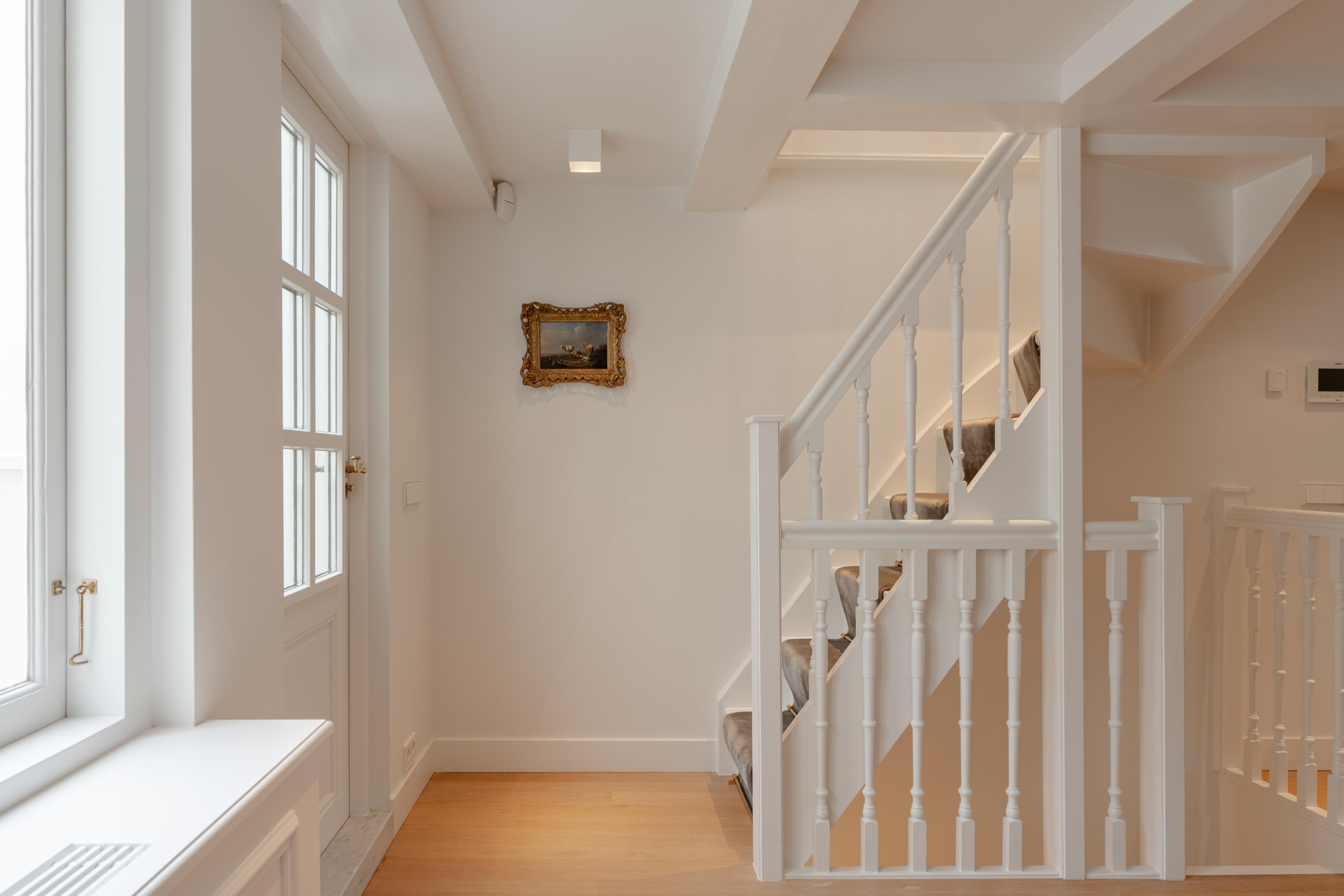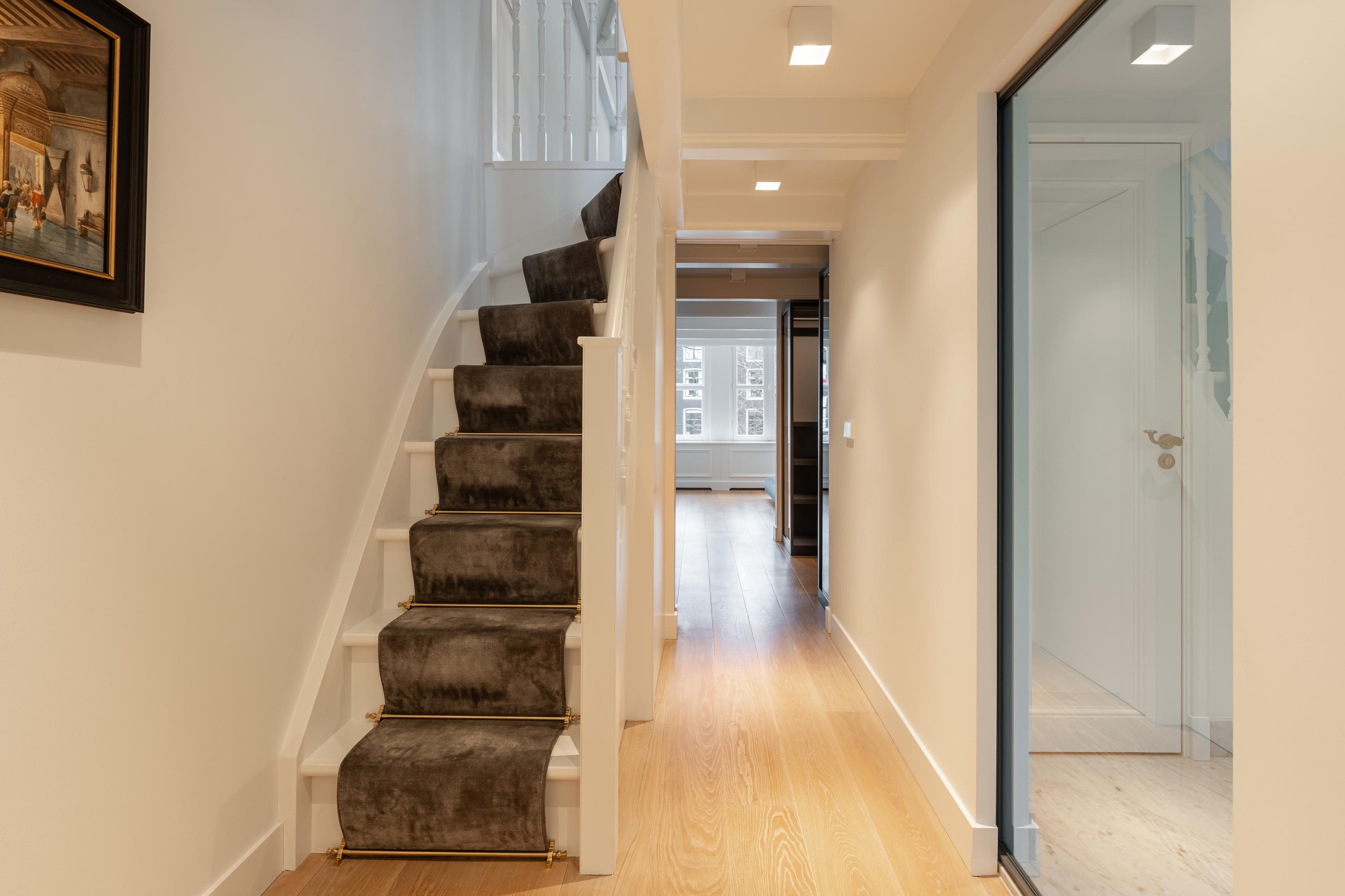 De klassiek vormgegeven trap is bekleed en afgewerkt met goudkleurige traproedes, wat de elegante uitstraling verder versterkt. Aan de achterzijde bevindt zich een tweede kamer, ideaal als werk- of studeerkamer, met een rustige ligging en veel privacy.