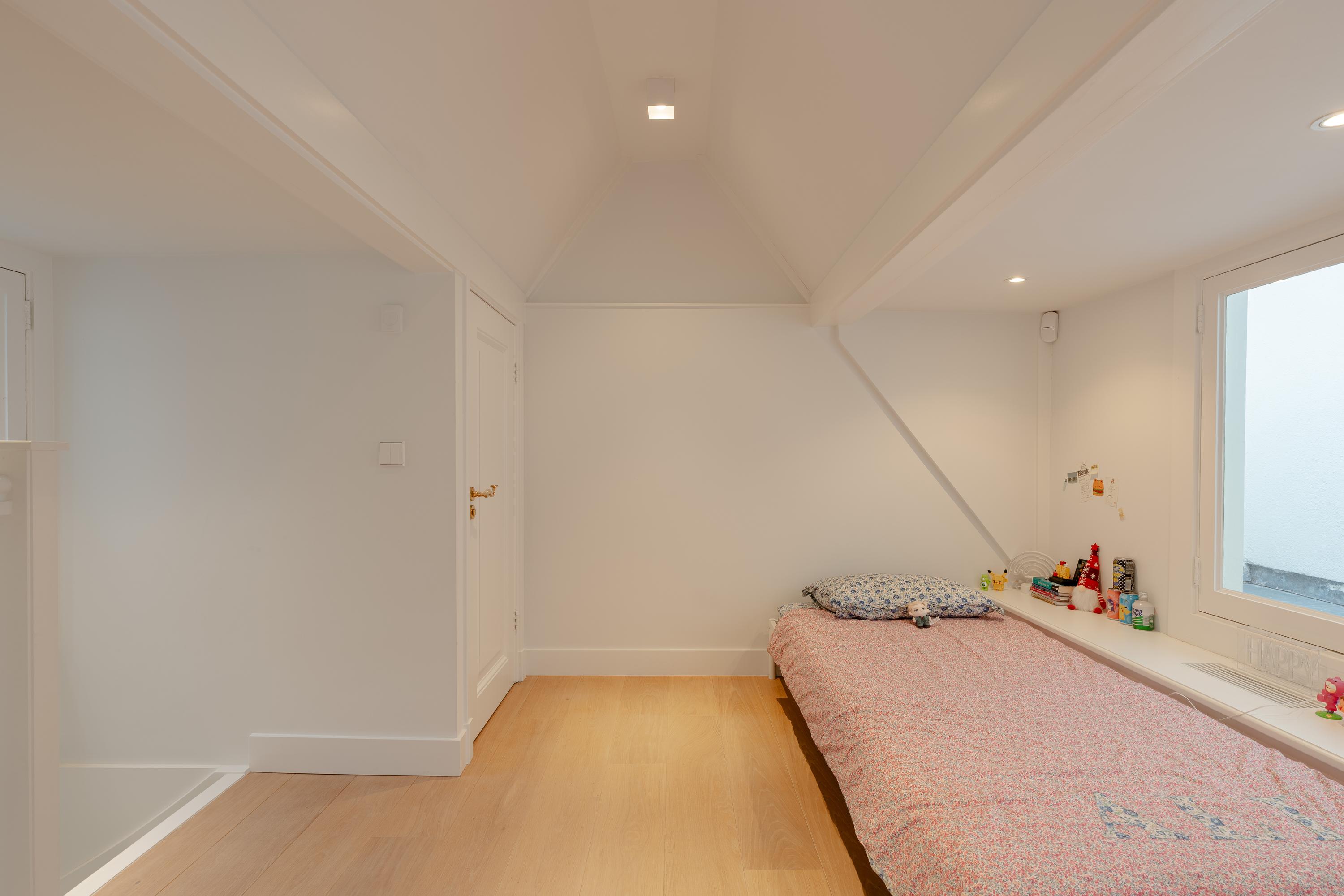 De vierde verdieping is momenteel ingericht als slaapkamer en beschikt over een eigen toilet en praktische bergruimte. Dankzij de kapconstructie en de zichtbare balken heeft deze ruimte een intieme en karaktervolle uitstraling, met een prettige nokhoogte van circa 2,82 meter.