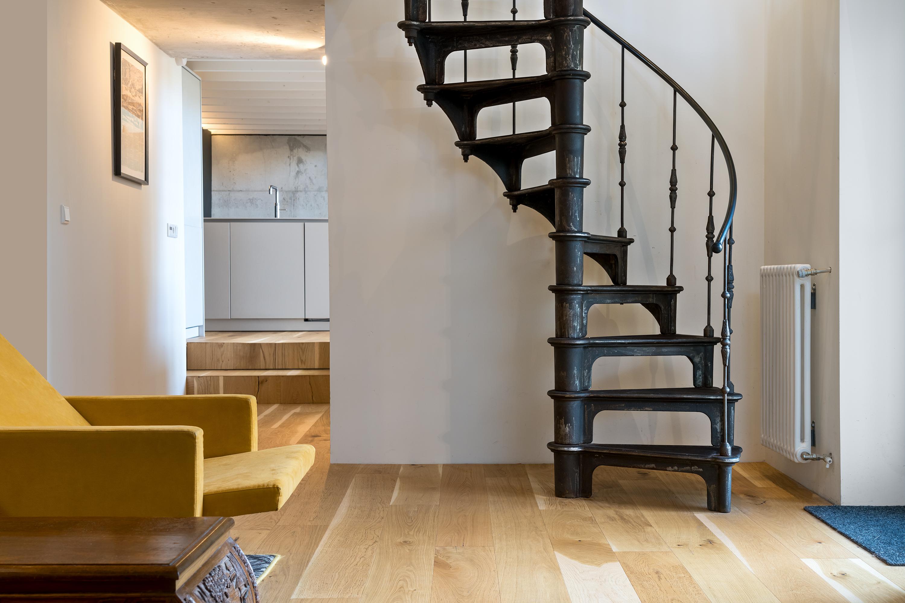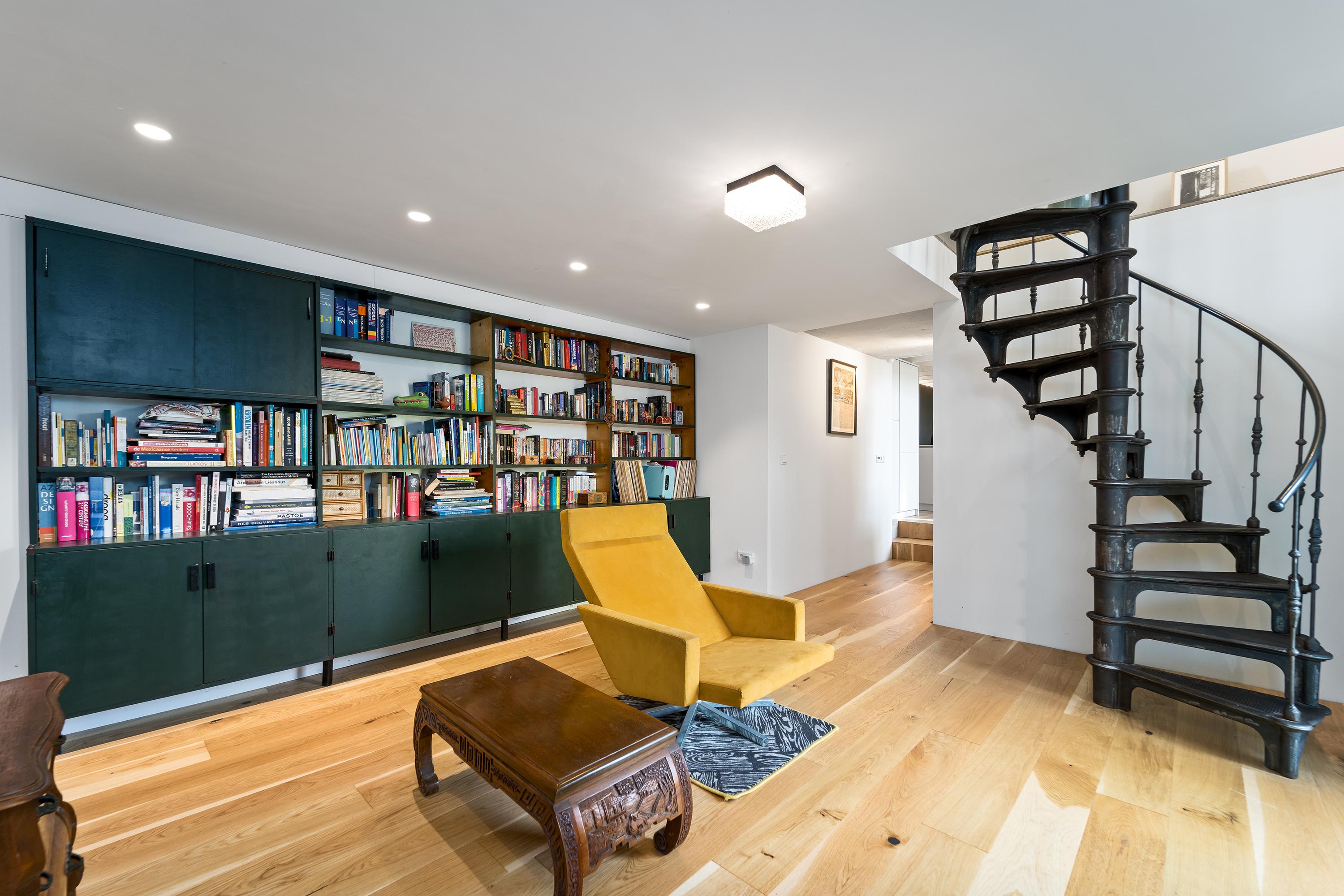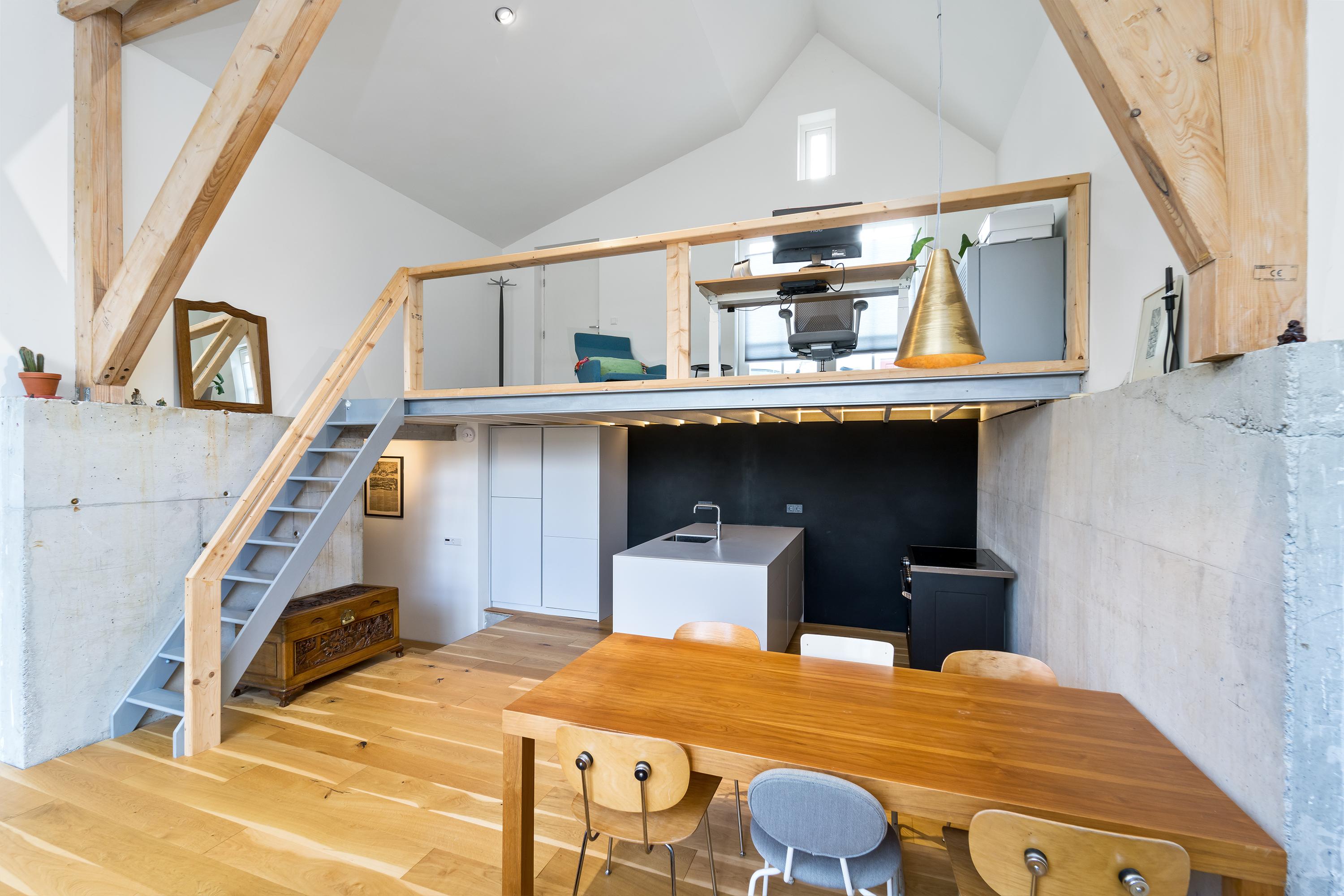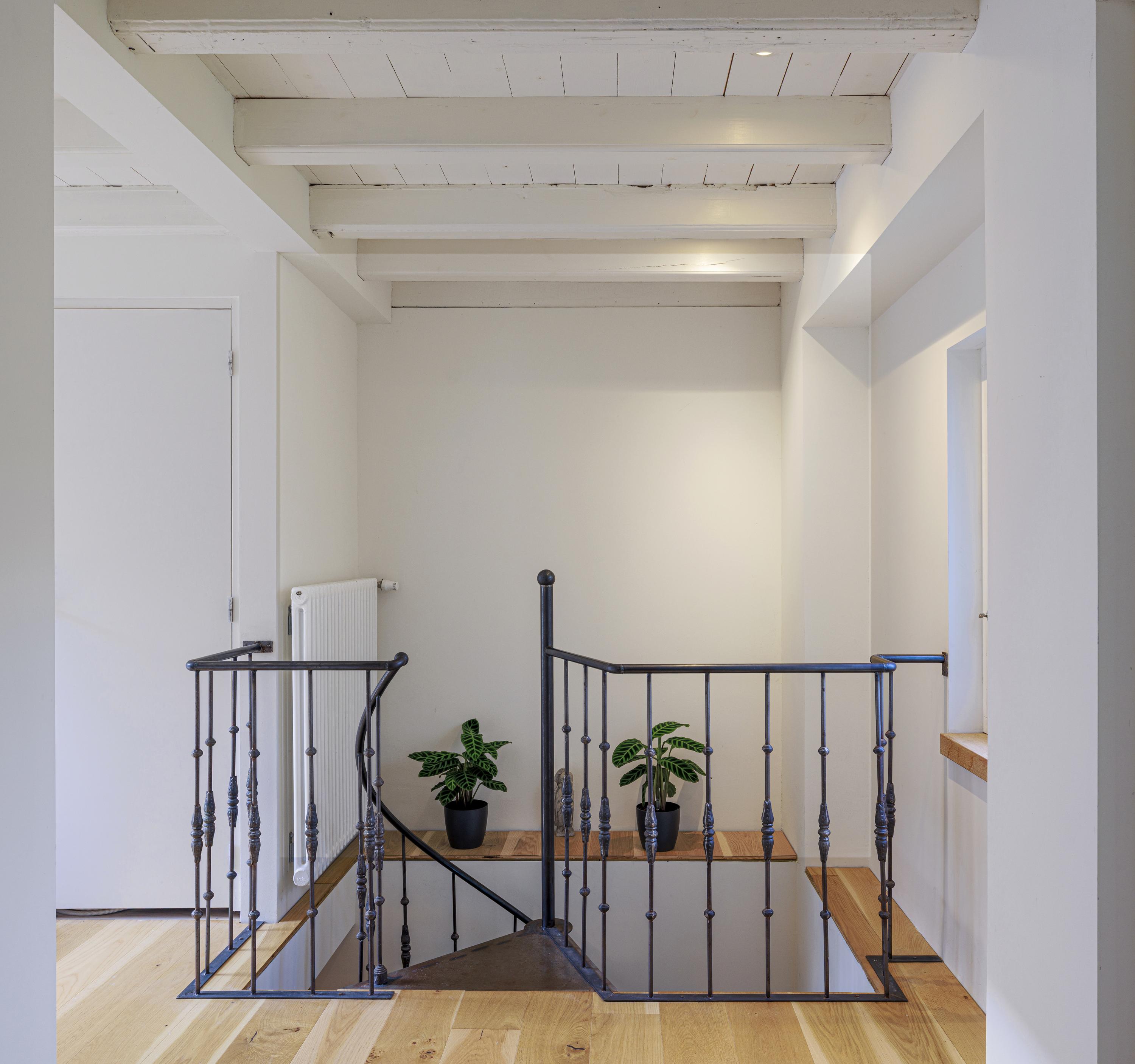 The interior is just as impressive. The new-build and renovation combine old and modern materials in an exciting and harmonious way. Think robust wooden structural beams, raw concrete, oak flooring, classic column radiators, and a striking steel spiral staircase. The finish is of high quality and executed with great attention to detail.