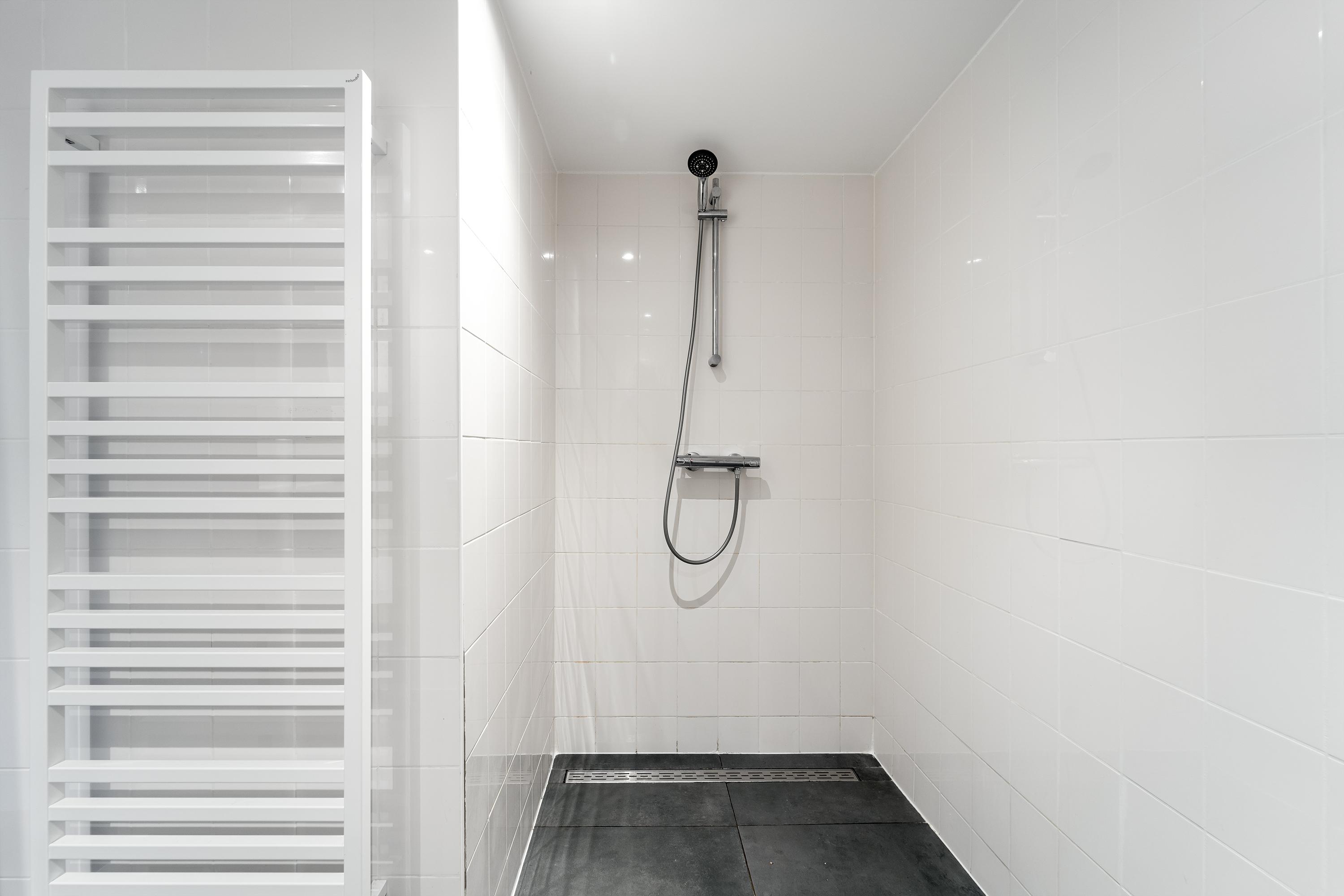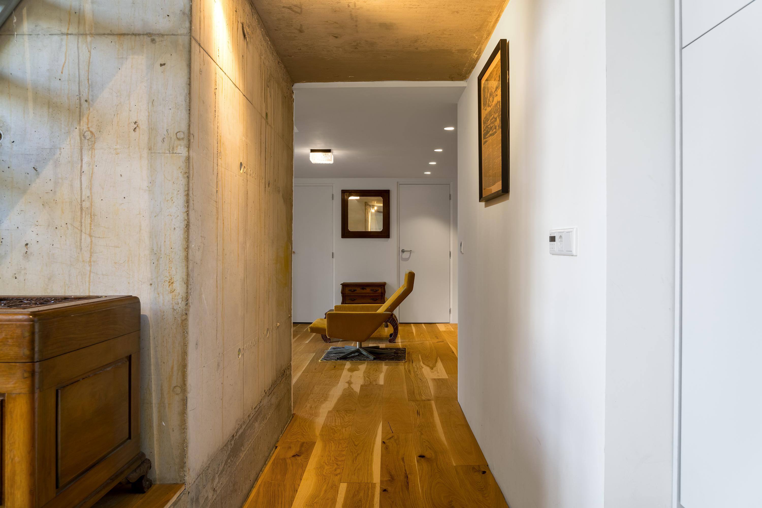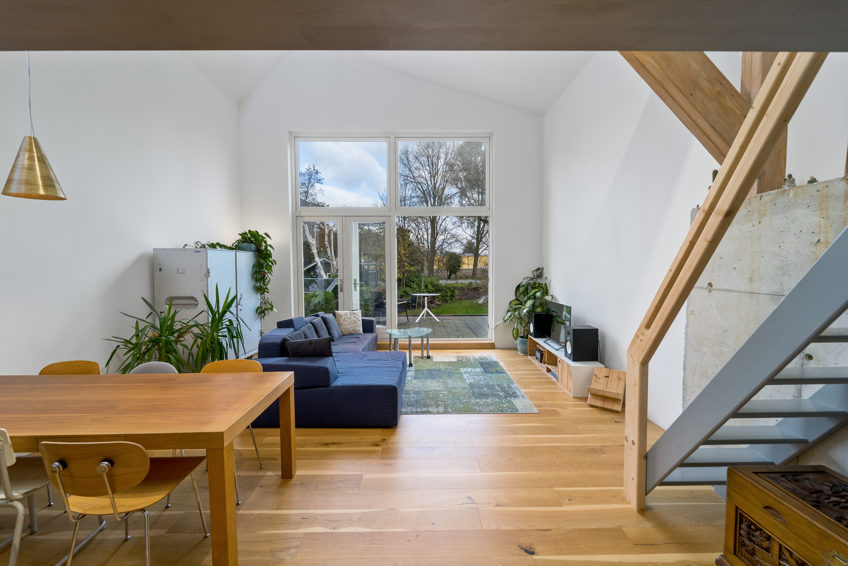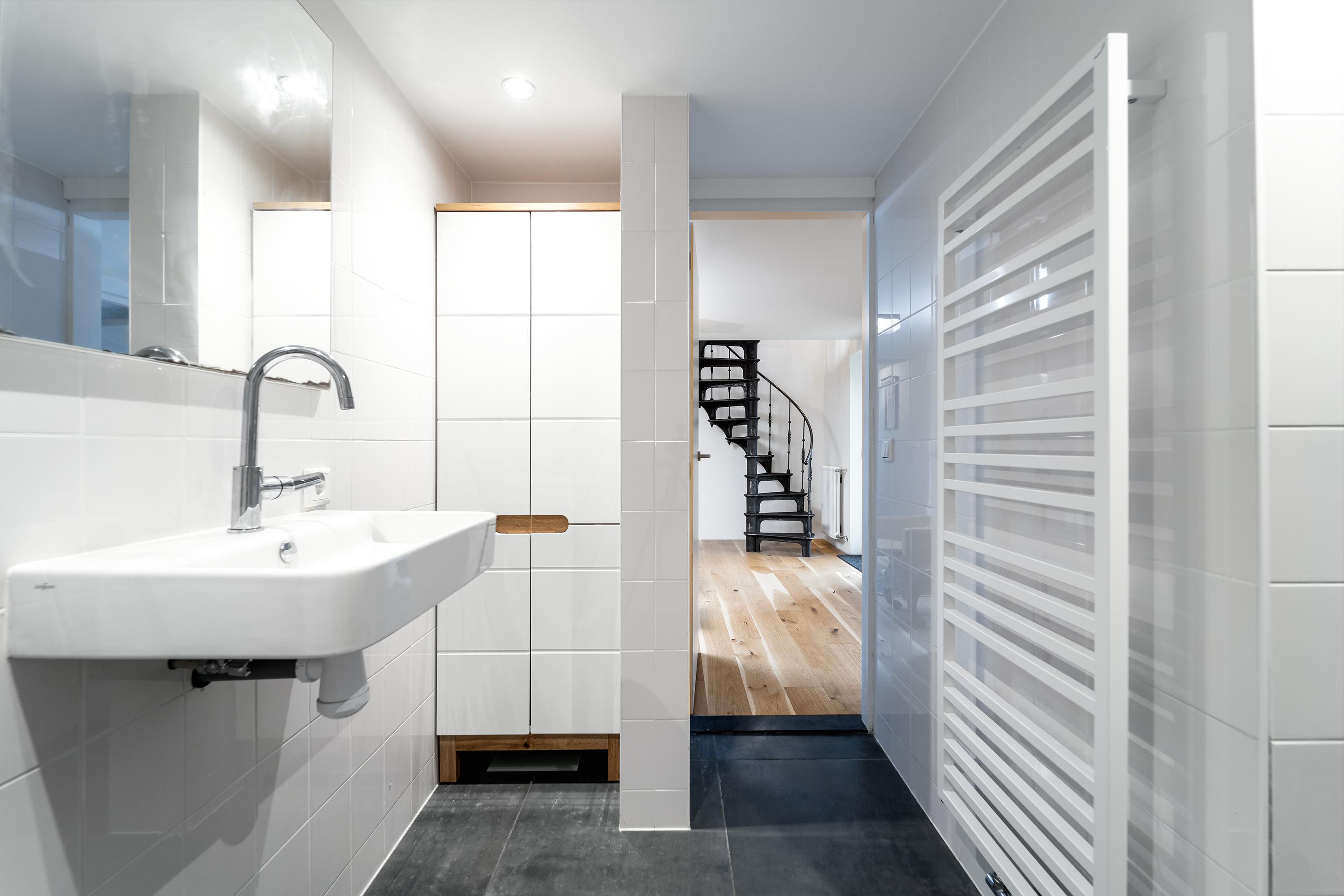 The interior is just as impressive. The new-build and renovation combine old and modern materials in an exciting and harmonious way. Think robust wooden structural beams, raw concrete, oak flooring, classic column radiators, and a striking steel spiral staircase. The finish is of high quality and executed with great attention to detail.