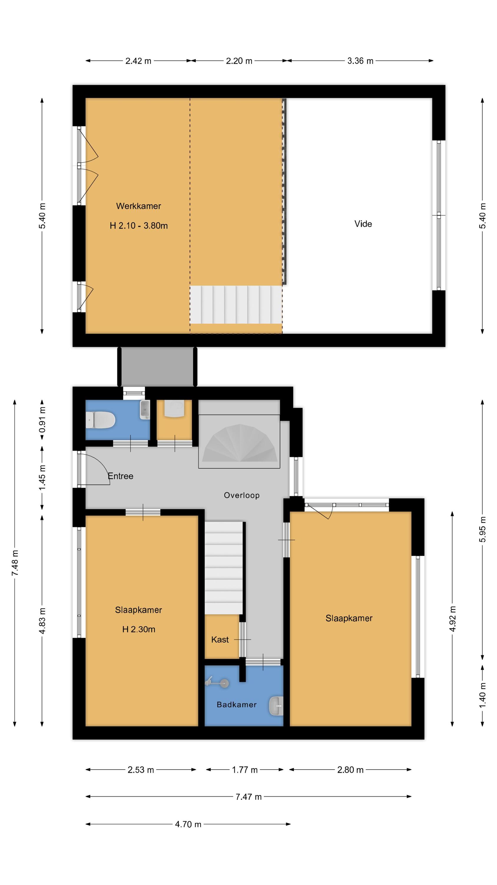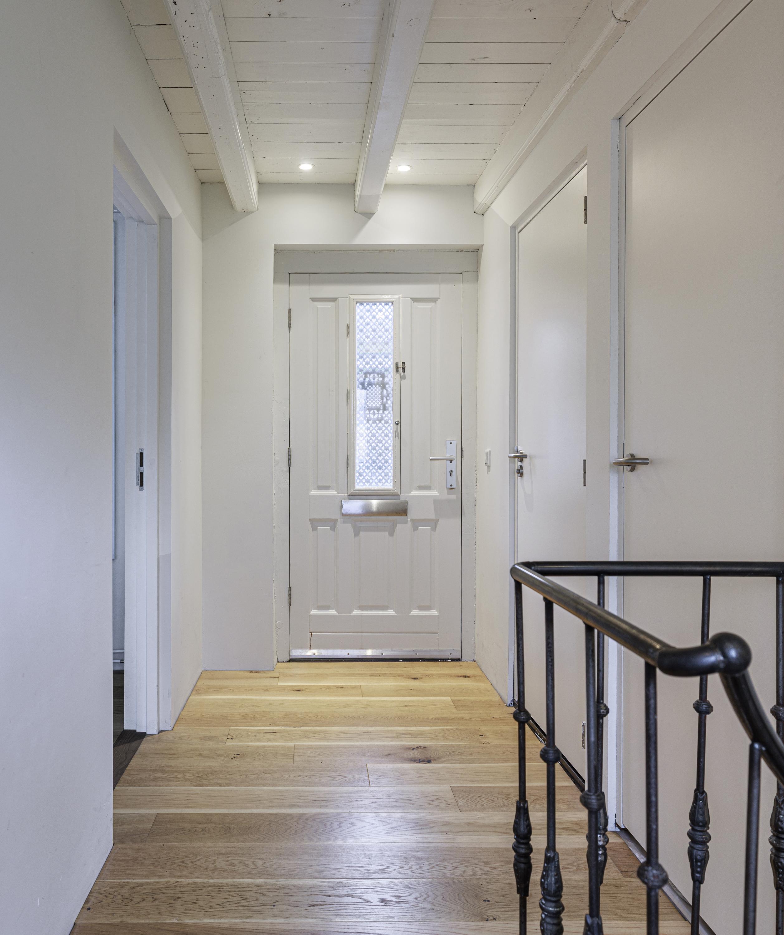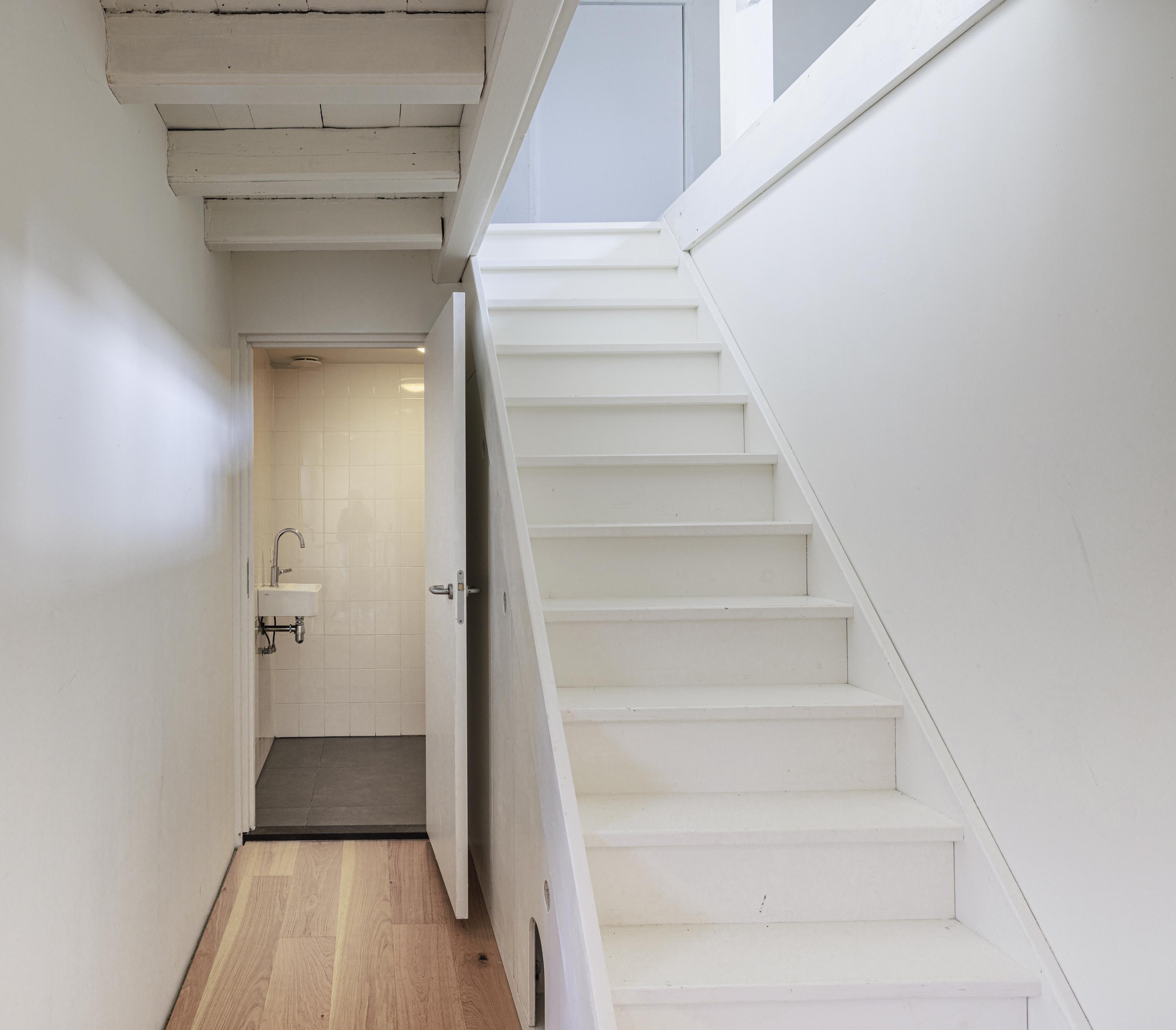 Brick dike house: entrance, hallway, toilet, staircase with storage cupboard to the first floor, spiral staircase to the garden level, two bedrooms, and second bathroom (walk-in shower and washbasin).