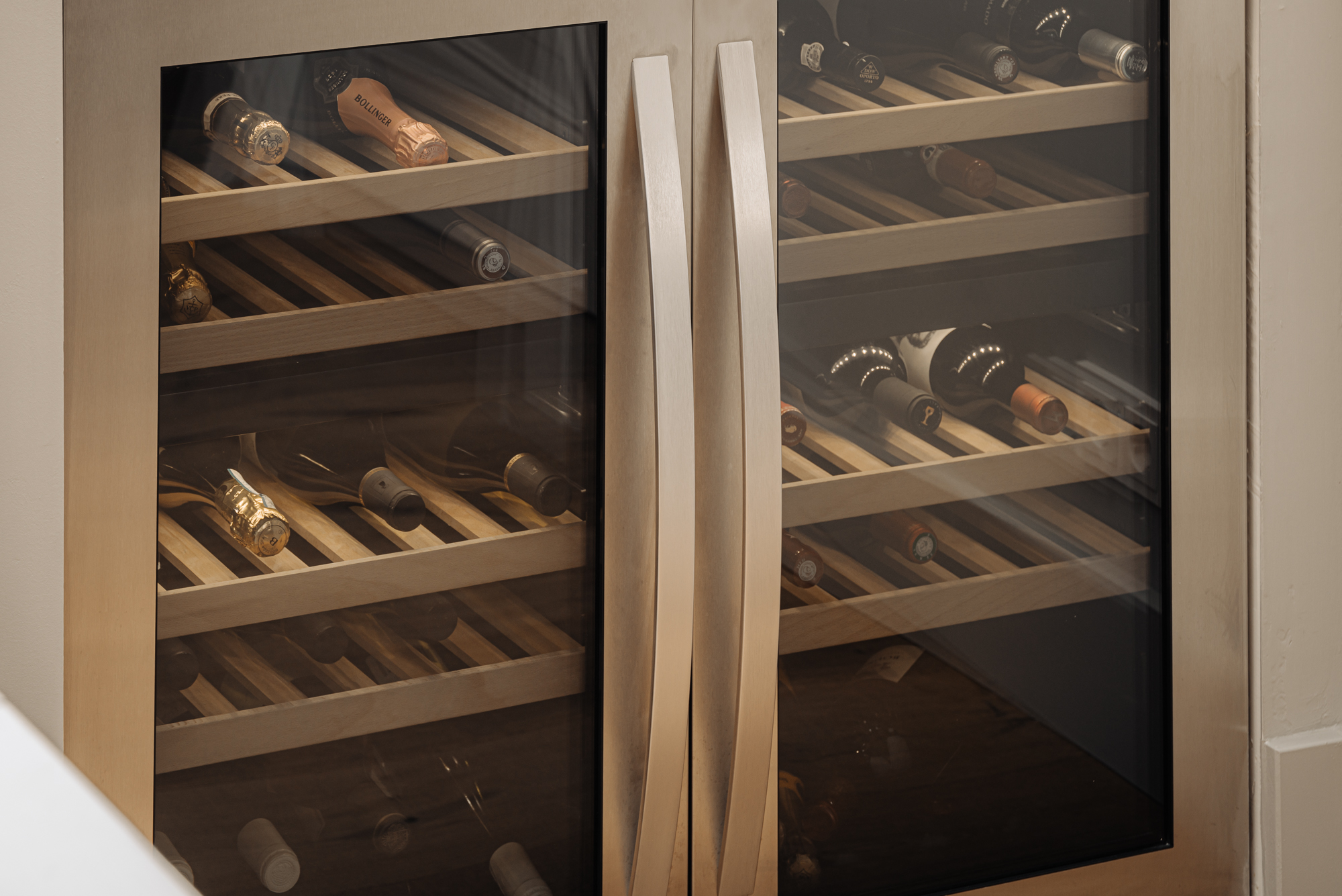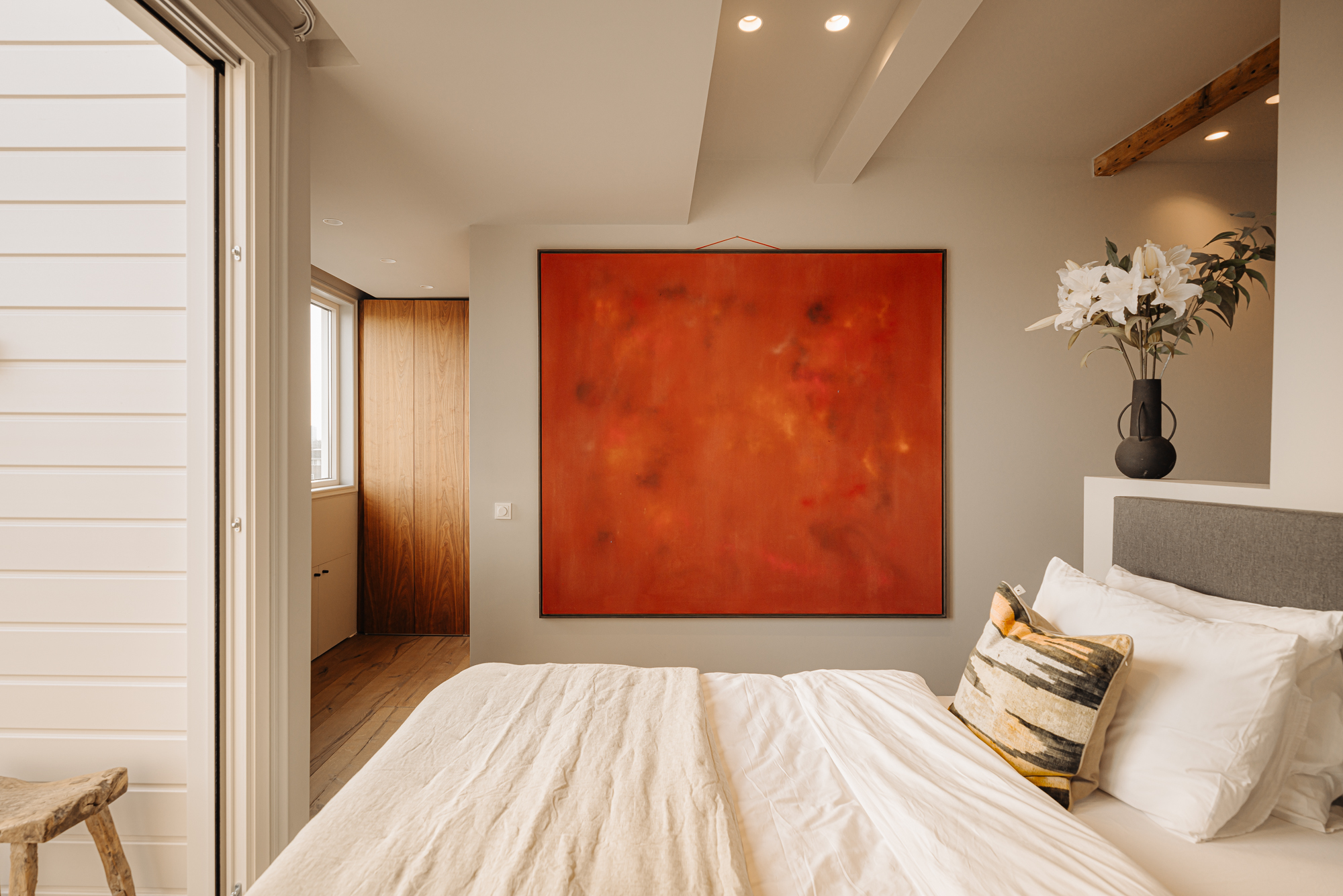 Upon entering, you immediately notice the spacious and light-filled design of the apartment. The living room features a charming south-facing balcony and large windows on both sides, allowing plenty of natural light and offering a panoramic view of the city. The visible wooden beams add character, while the elevated seating area creates a cosy space to relax. An air conditioning unit is installed above the kitchen, which boasts a large cooking island with a natural stone worktop and high-end built-in appliances, including a four-burner induction hob with extractor, a dishwasher, a fridge-freezer combination, a Quooker, and a built-in wine climate cabinet. A stylish raised bar area is integrated into the kitchen island. The dining area comfortably accommodates a large table, benefiting from ample natural daylight through the expansive windows.