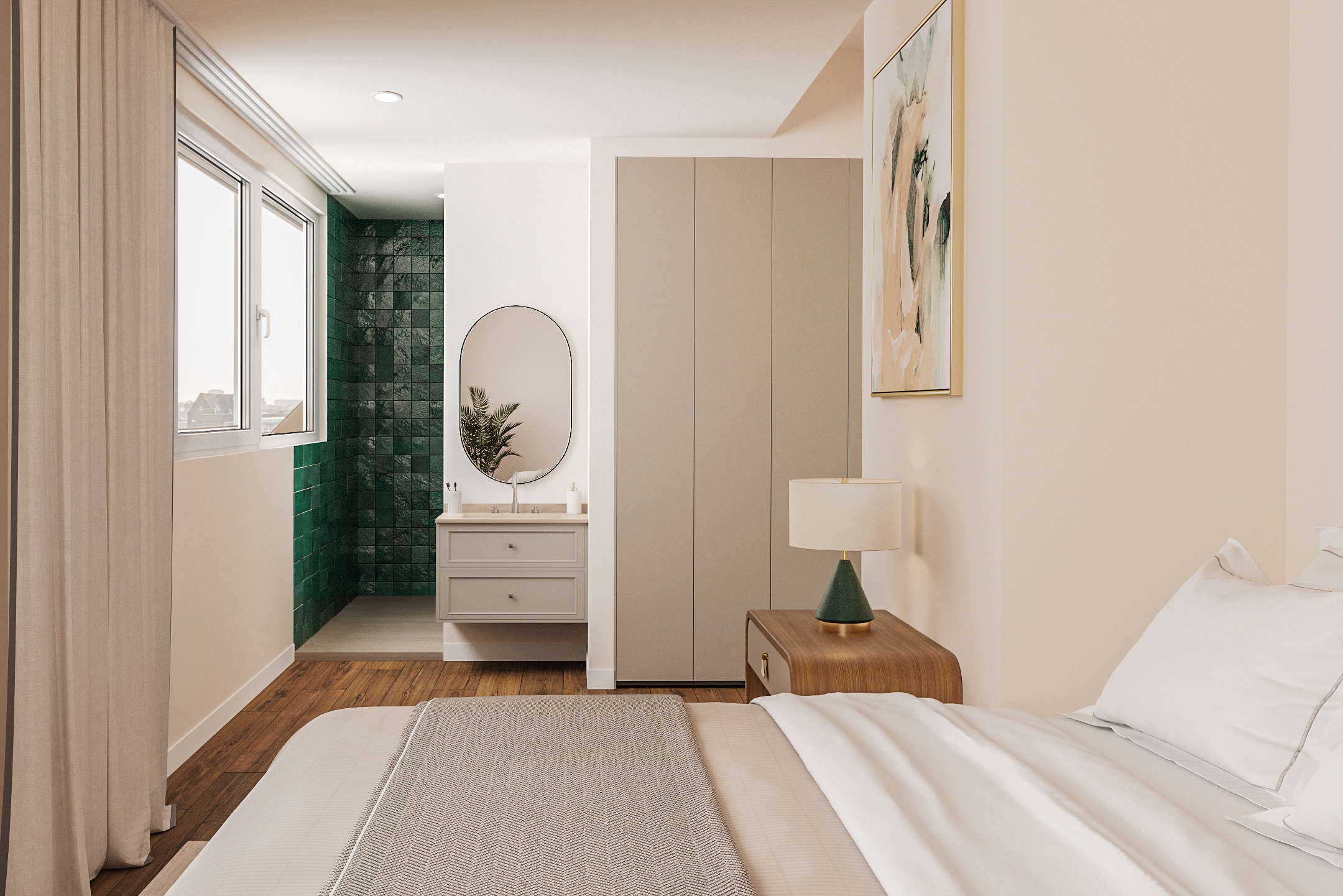 This penthouse comprises three spacious bedrooms, two of which are fitted with custom-built wardrobes and air conditioning. The master bedroom has a private south-facing balcony and an en-suite bathroom, complete with a freestanding bathtub, a walk-in shower, and a double washbasin with a vanity unit. Around the corner, you’ll find an elegant make-up table and a separate toilet with a washbasin.