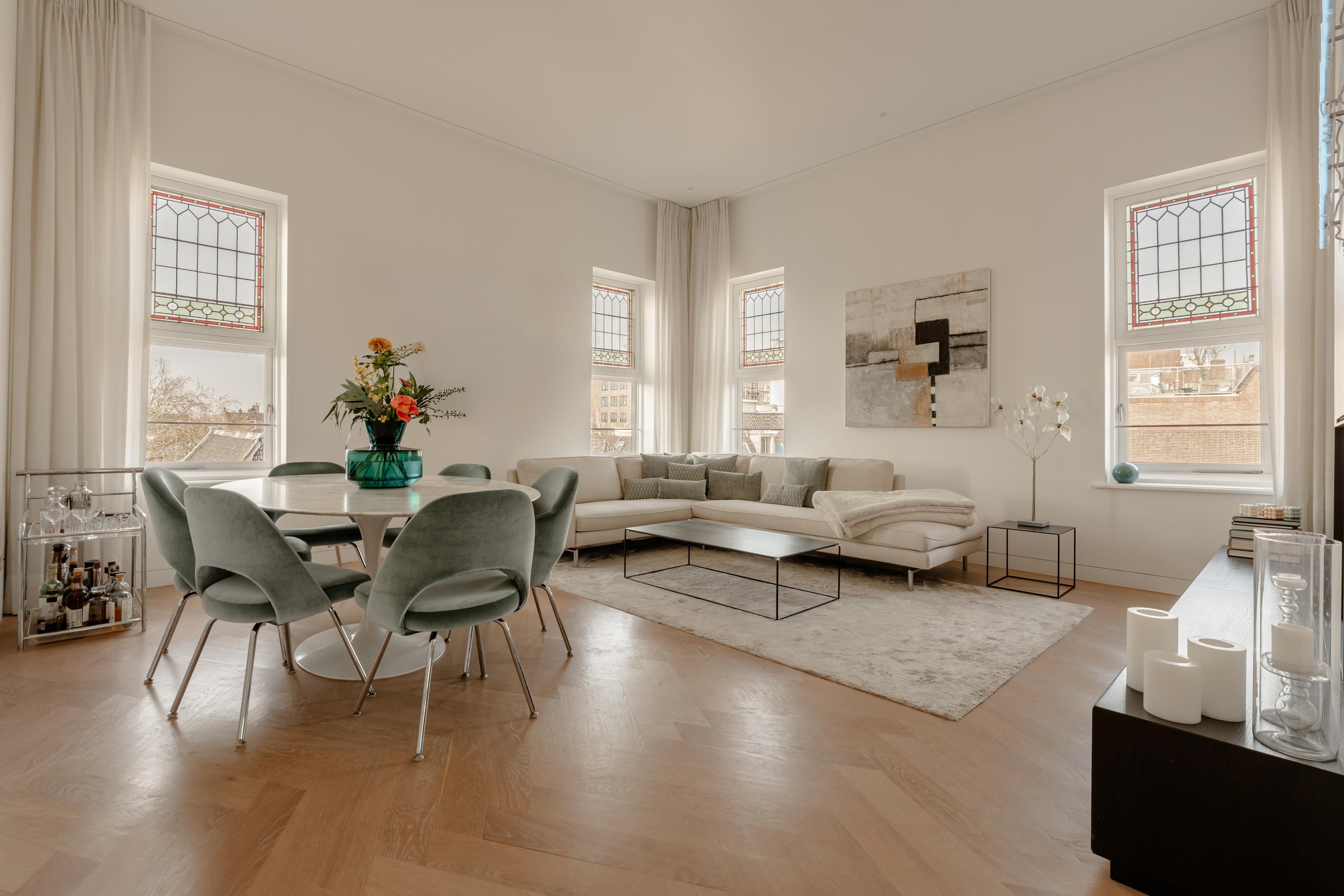Thanks to the large windows, the space is filled with natural light and offers beautiful views over the characteristic rooftops of Oud-West, creating an open and serene living experience. The kitchen is equipped with high-end Siemens built-in appliances, an induction hob, Quooker tap, and a wine climate cabinet. Integrated air conditioning completes the comfort.