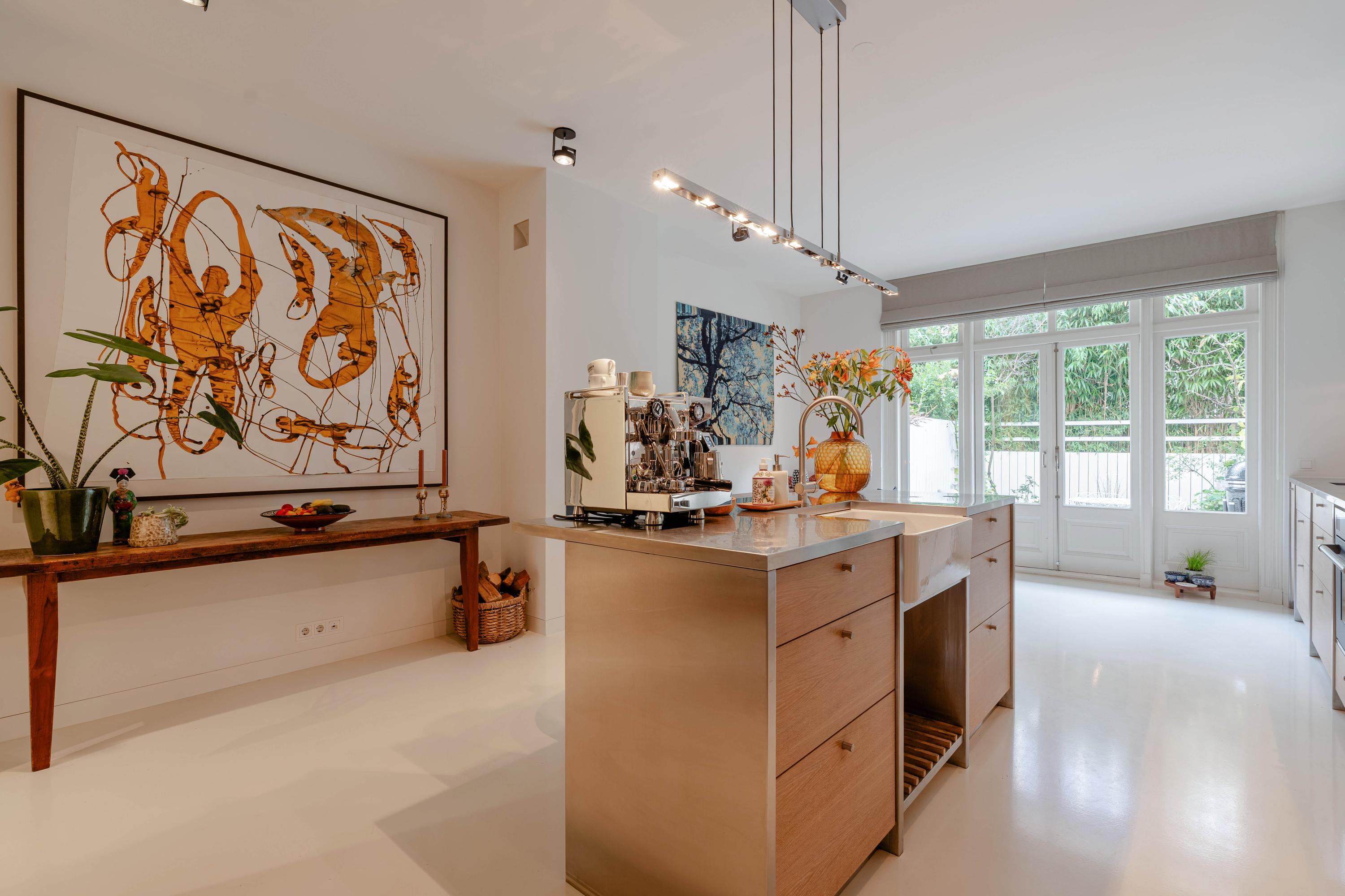 At the centre of the room sits a substantial island with an inviting bar arrangement, perfect for both casual dining and entertaining. Adjacent to the kitchen is a practical pantry suitable for storing provisions and kitchen equipment. French doors open onto the covered terrace and the sunny south-facing garden. The garden acts as a natural extension of the kitchen, effectively doubling the living space during warmer months. Built-in cabinets and a guest toilet are also present on this floor. The contemporary finish of the kitchen contrasts elegantly with the more classical elements found on the upper levels.