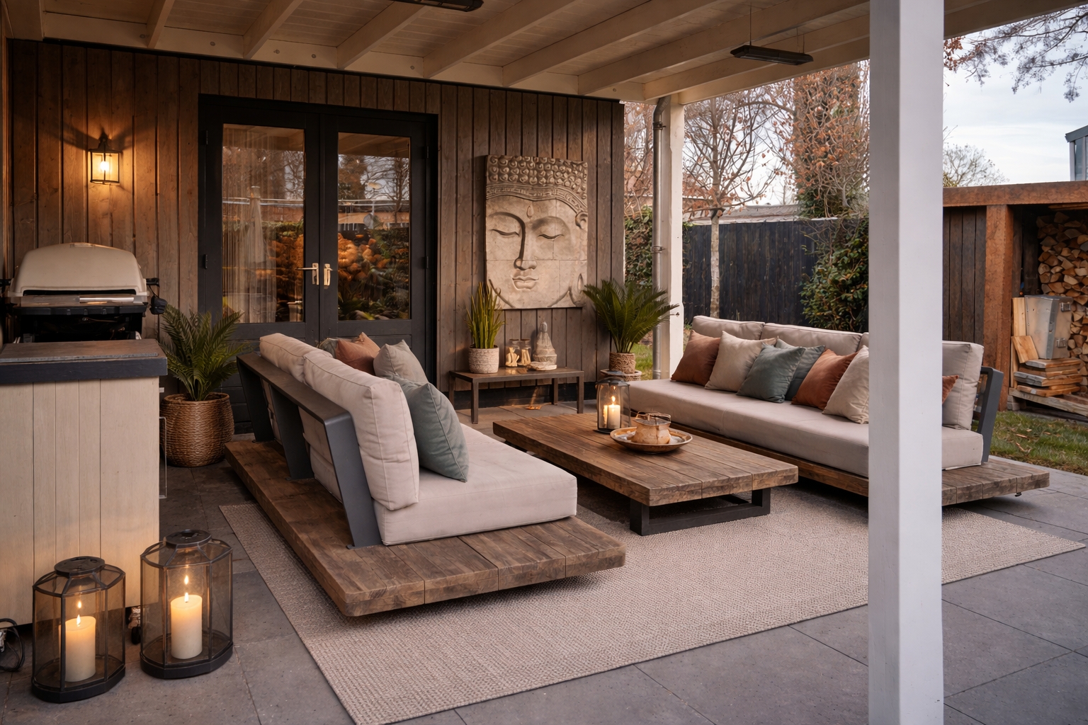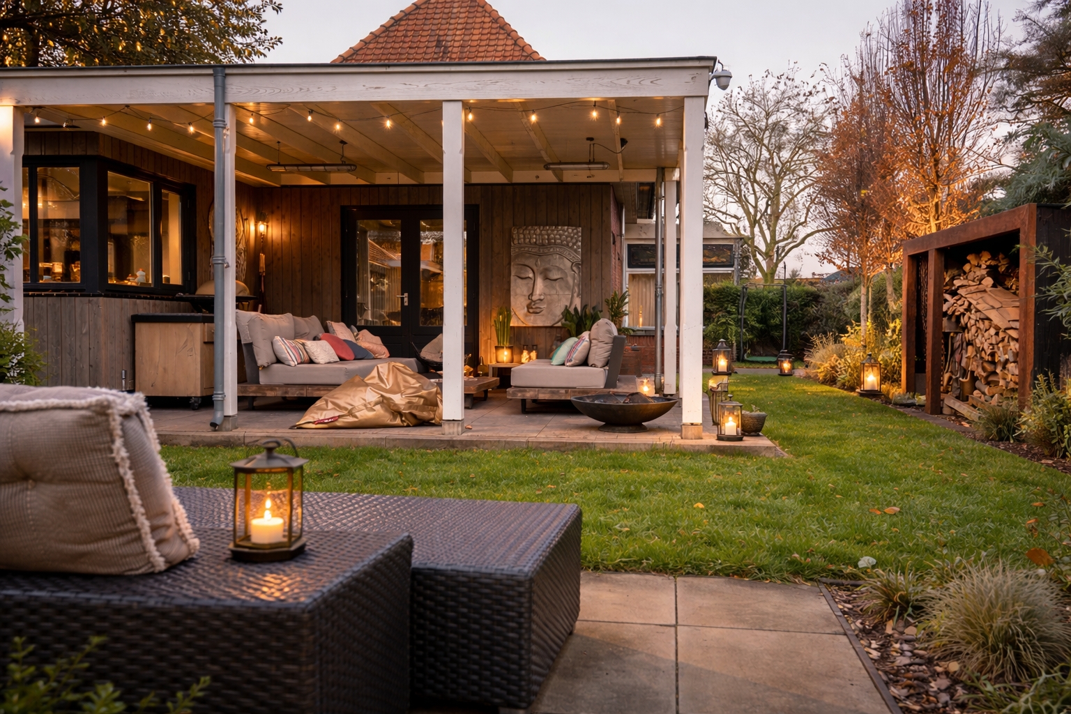 The outdoor space is equally appealing. The deep garden has been professionally landscaped and offers a high level of privacy, attractive sightlines and several options for creating terraces. The covered veranda at the rear forms a charming extension of the living space, making outdoor living an integral part of daily life throughout much of the year. To the front of the property there is a large carport with an integrated steel storage unit, while the driveway provides ample parking for multiple vehicles. The garden features planted borders and several mature trees, as well as a firewood store and refuse area finished in Corten steel. Behind the outbuilding, an additional wooden shed has been installed for garden equipment and storage.