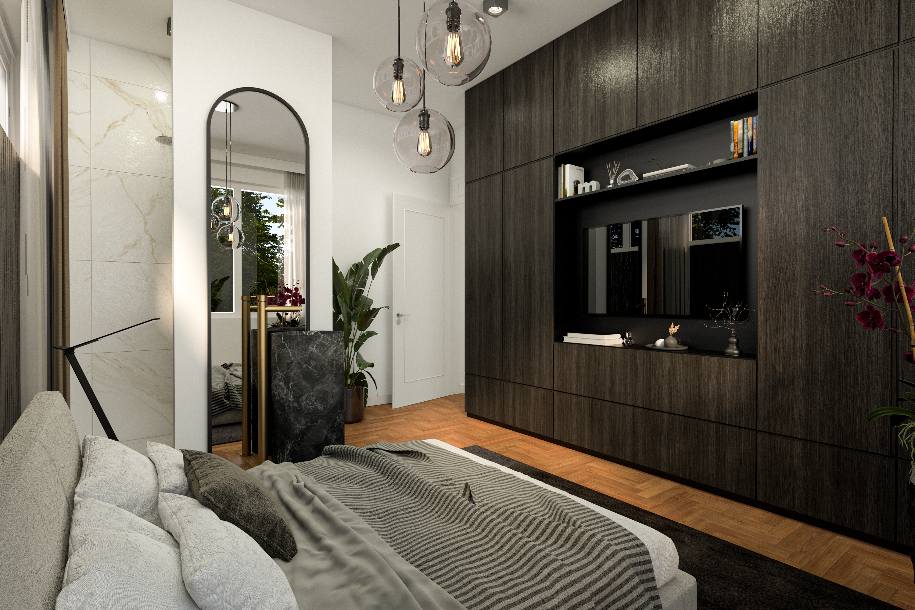 Binnen de huidige opzet kunnen drie volwaardige slaapkamers worden gerealiseerd, waaronder een ruime hoofdslaapkamer. De reeds uitgezette wanden maken de indelingsmogelijkheden direct inzichtelijk en bieden flexibiliteit om een comfortabele master bedroom, extra slaapkamers of een werkruimte te creëren.