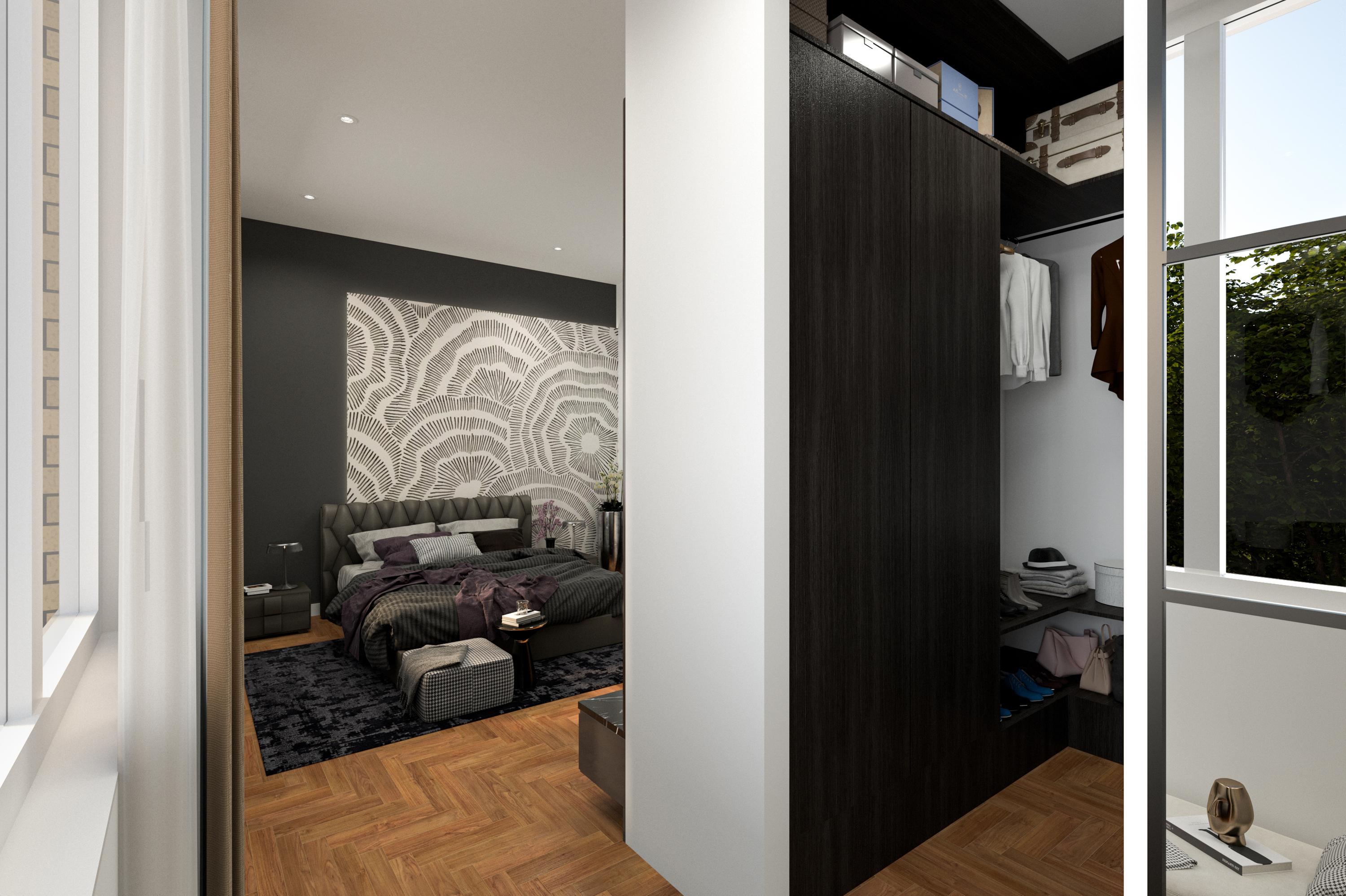 Bij de hoofdslaapkamer is reeds ruimte gereserveerd voor een inloopkast. De opzet hiervoor is al zichtbaar, waardoor eenvoudig een stijlvolle garderoberuimte kan worden gerealiseerd die naadloos aansluit op de master bedroom.