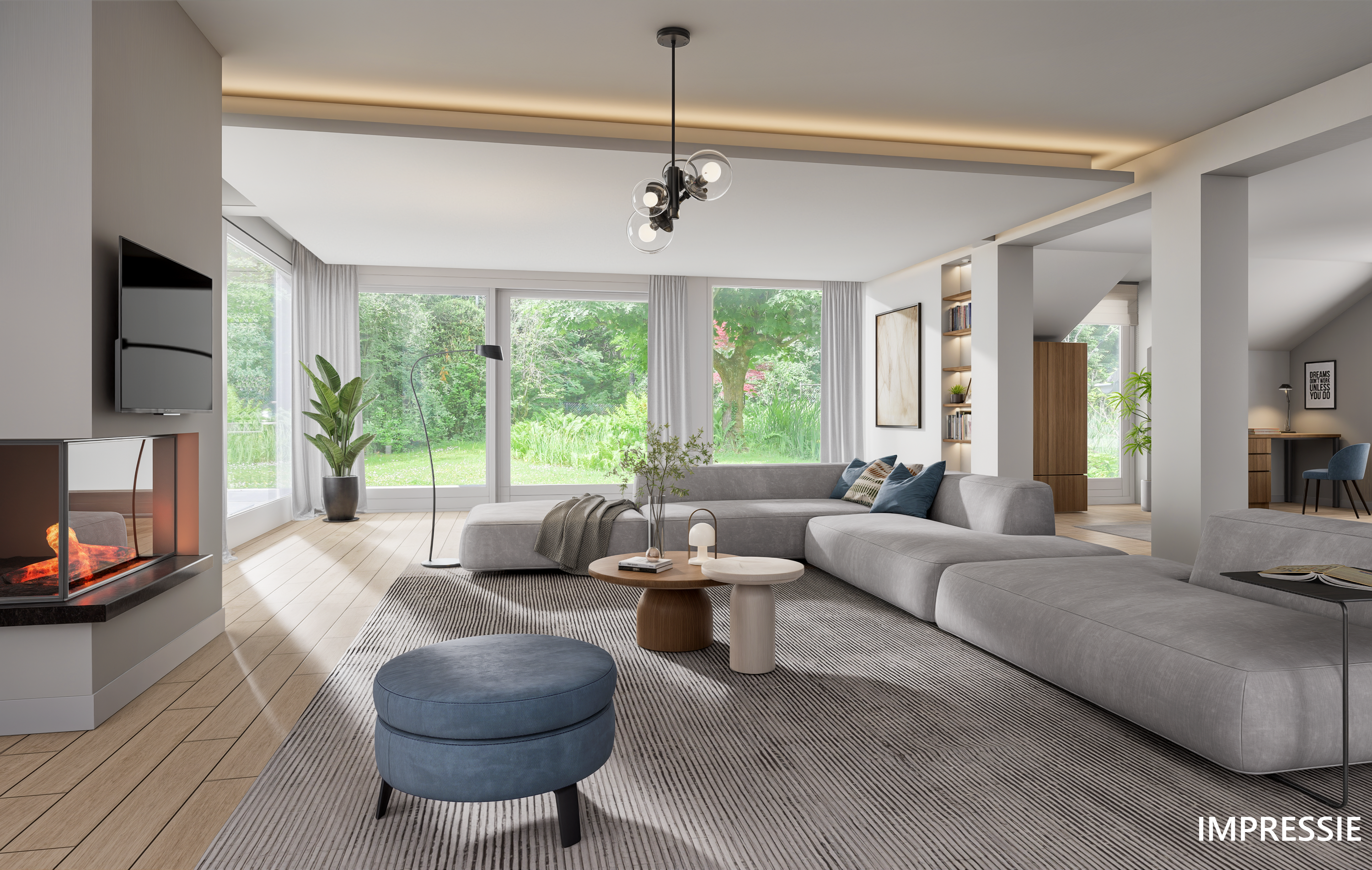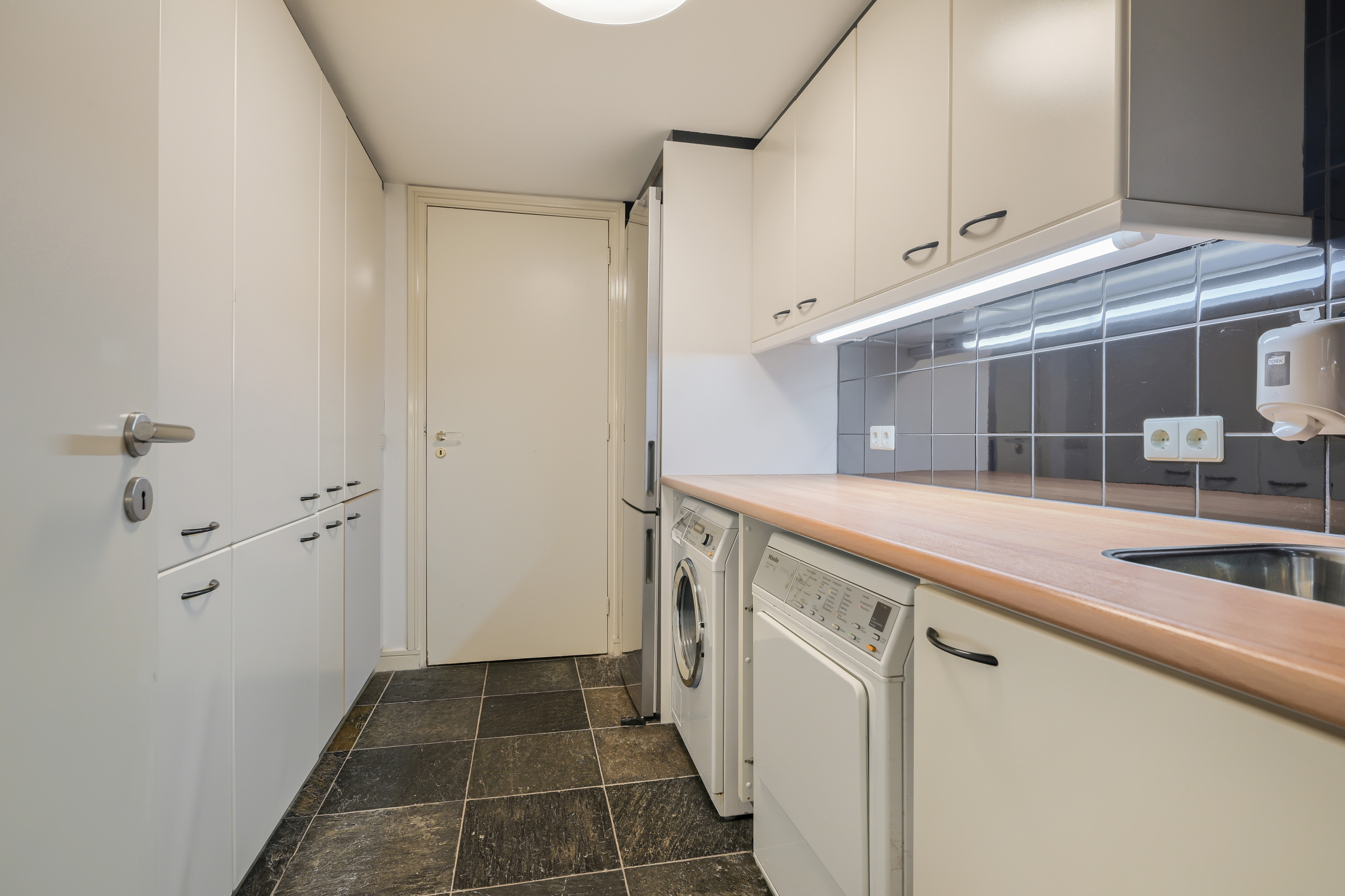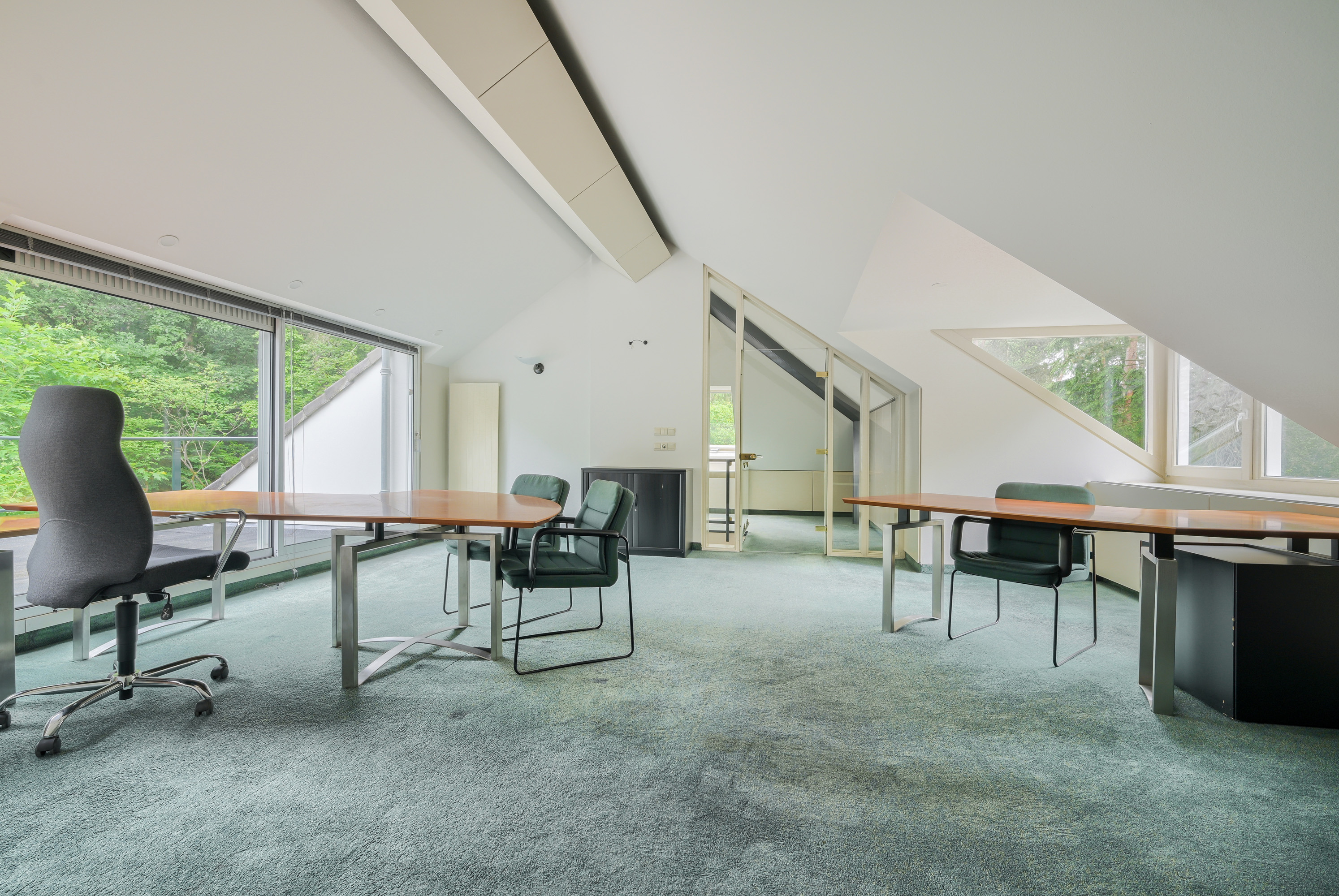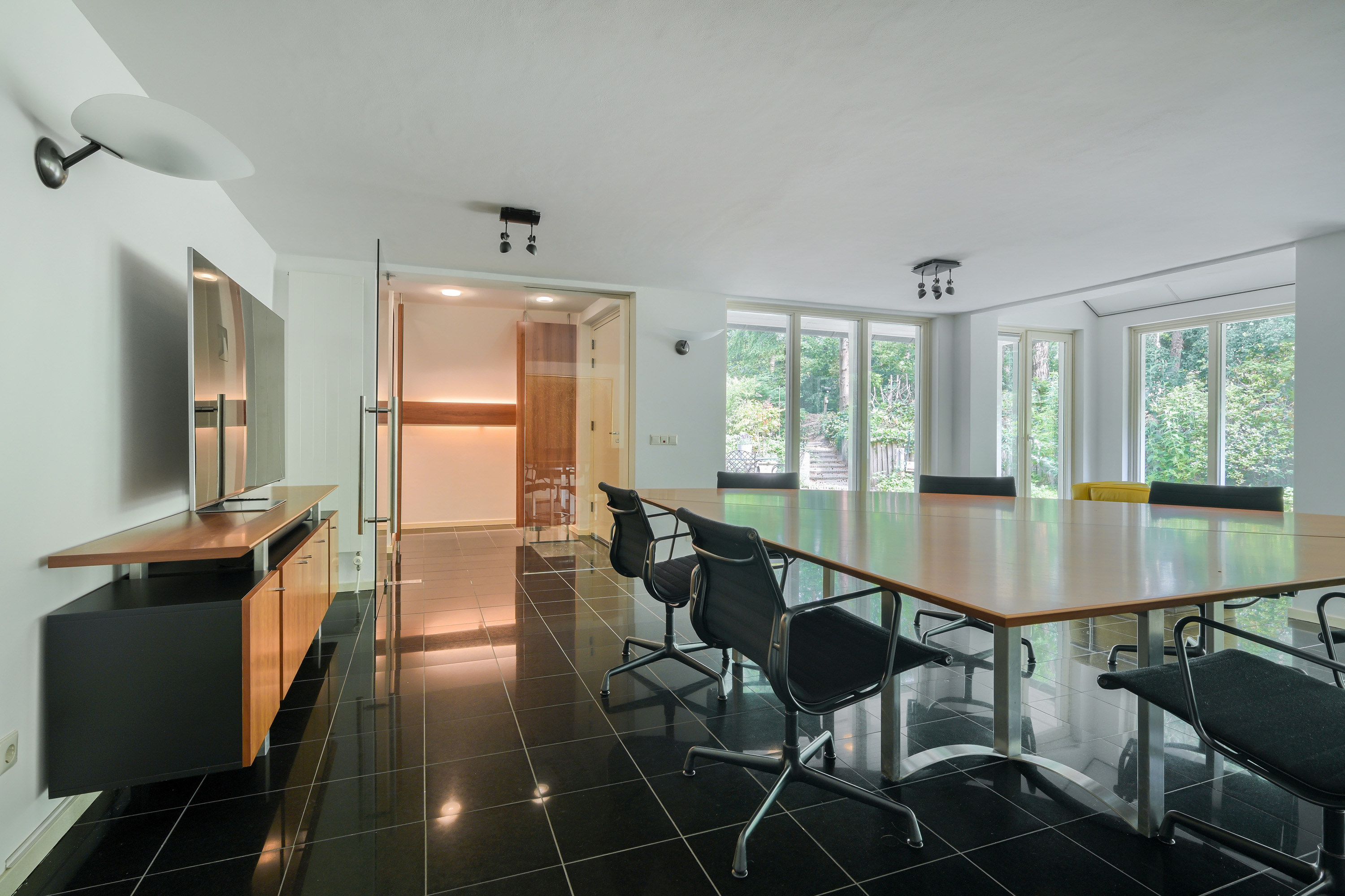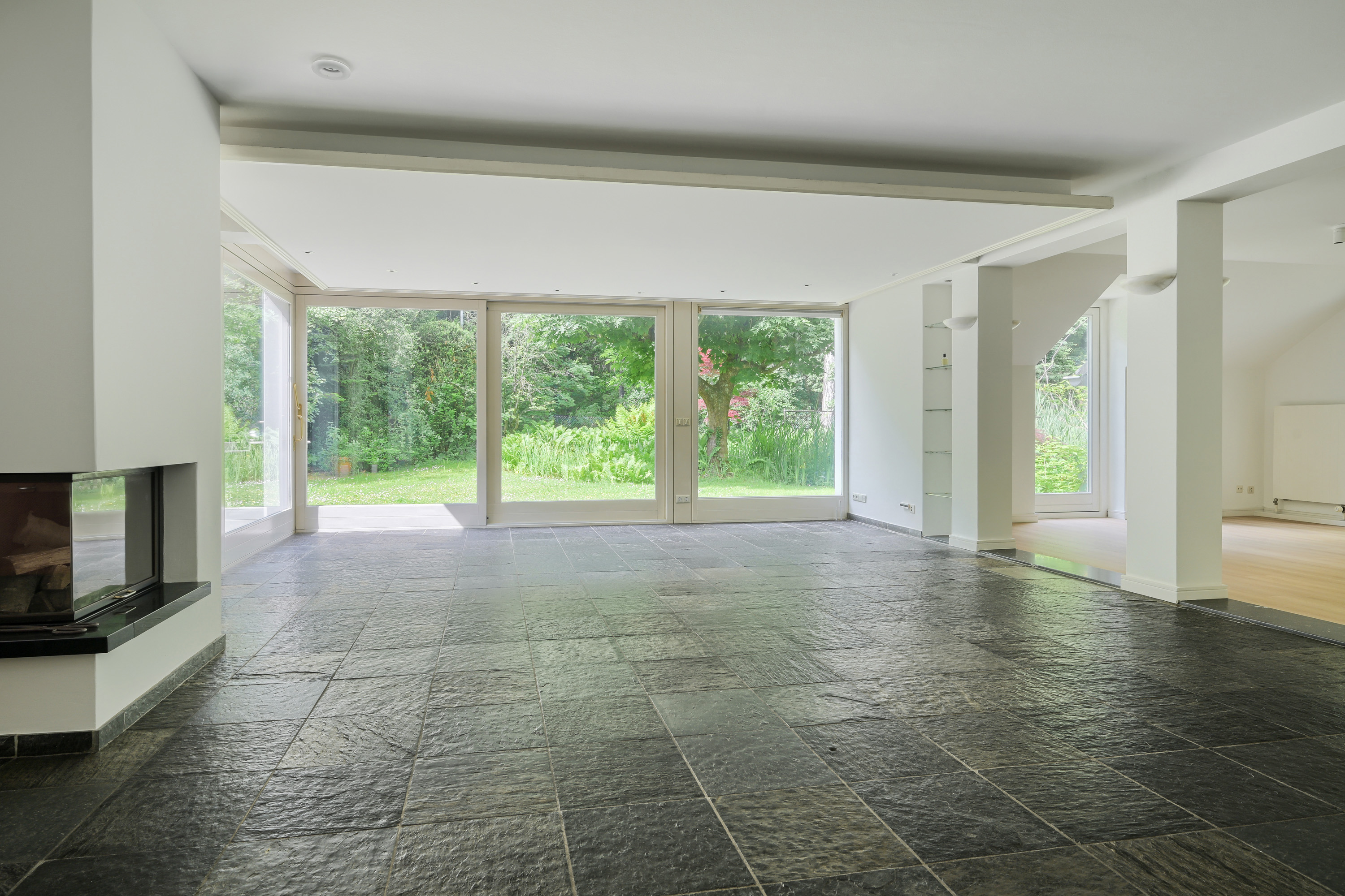 Beautiful living or working space with garden and terrace views. This bright room features large windows and is situated at the front of the house. A built-in cupboard contains the floor heating distribution unit.