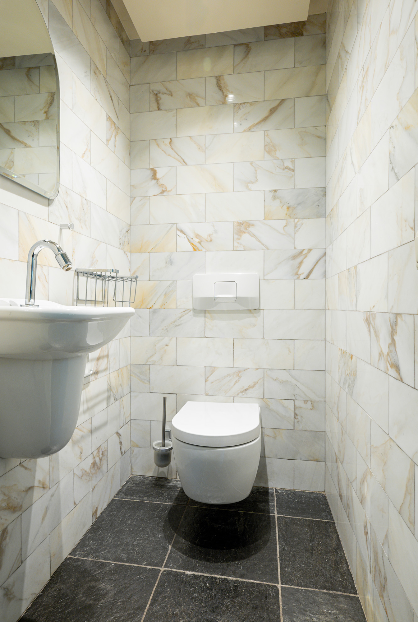The guest toilet is stylishly finished with natural stone tiles and features a wall-hung toilet with built-in reservoir, as well as a small washbasin.