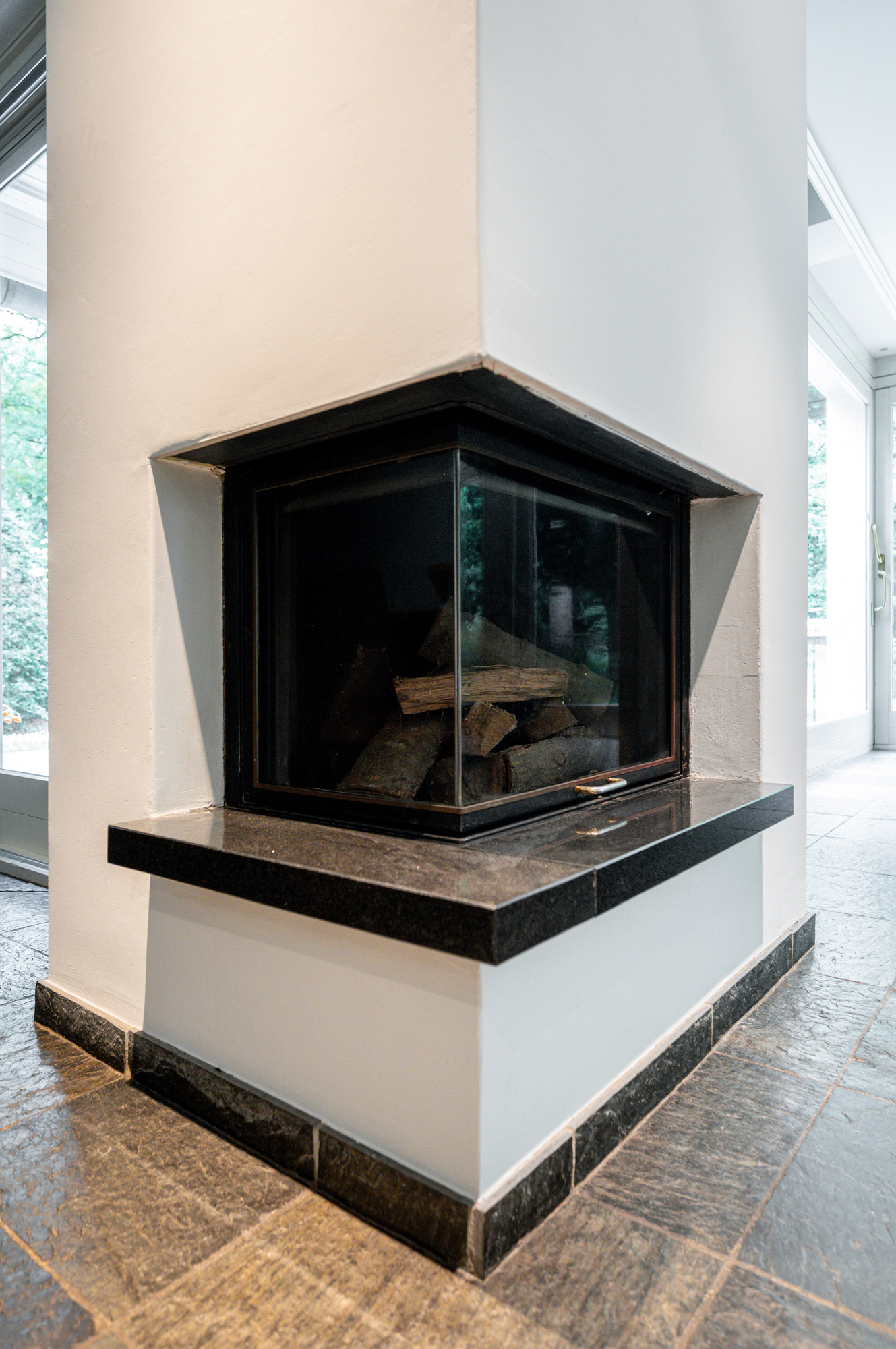 The fireplace is a so-called "lift-door fireplace" with a passive system that draws in cold air from below and releases warm air at the top.