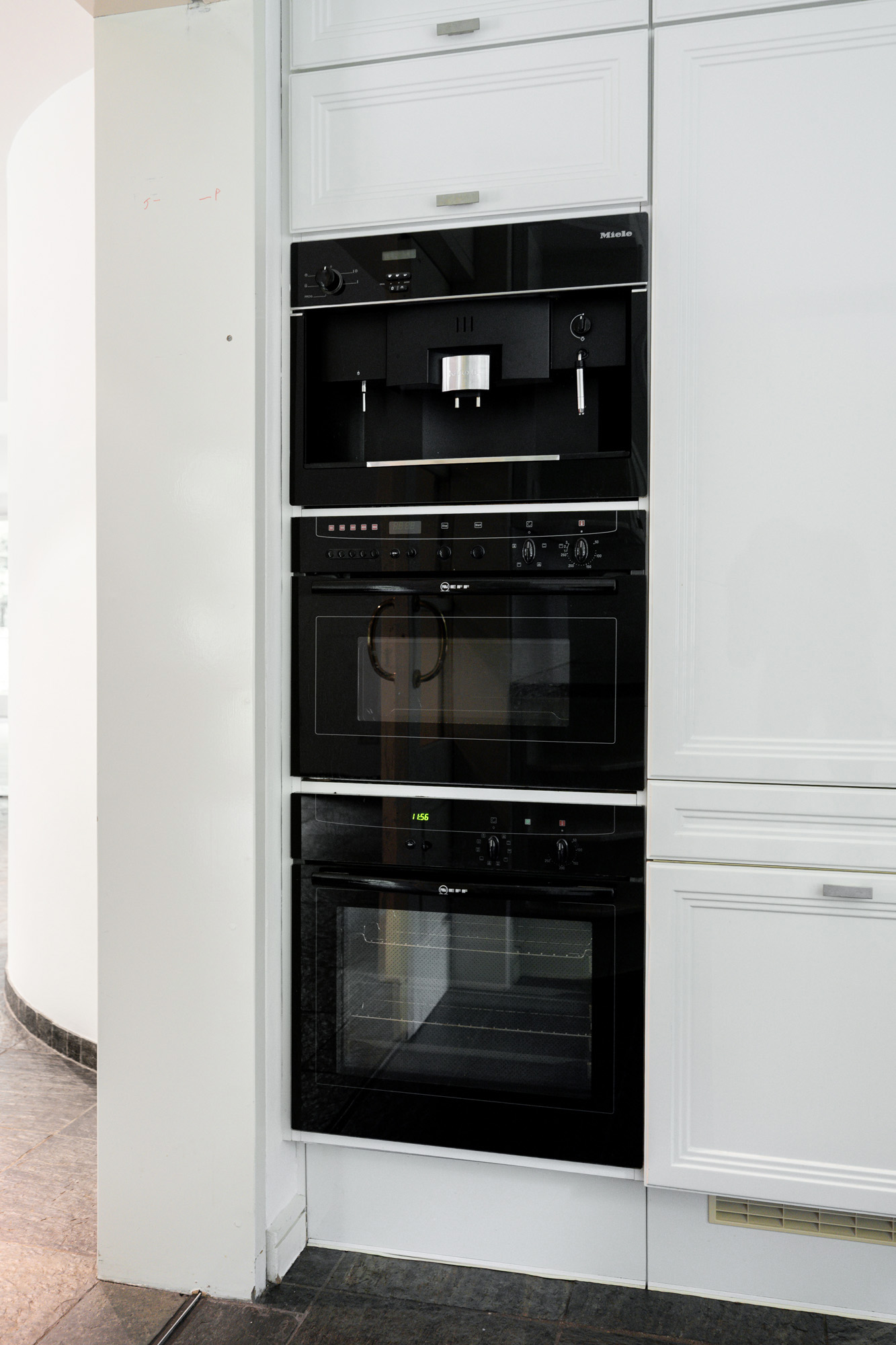 Features include a granite countertop with 1½ stainless steel sink and Quooker tap. Appliances include a dishwasher, induction hob, stainless steel extractor, refrigerator, two ovens, and a built-in espresso machine. The kitchen also features a dining area and a wall unit with countertop and ample cabinet space.