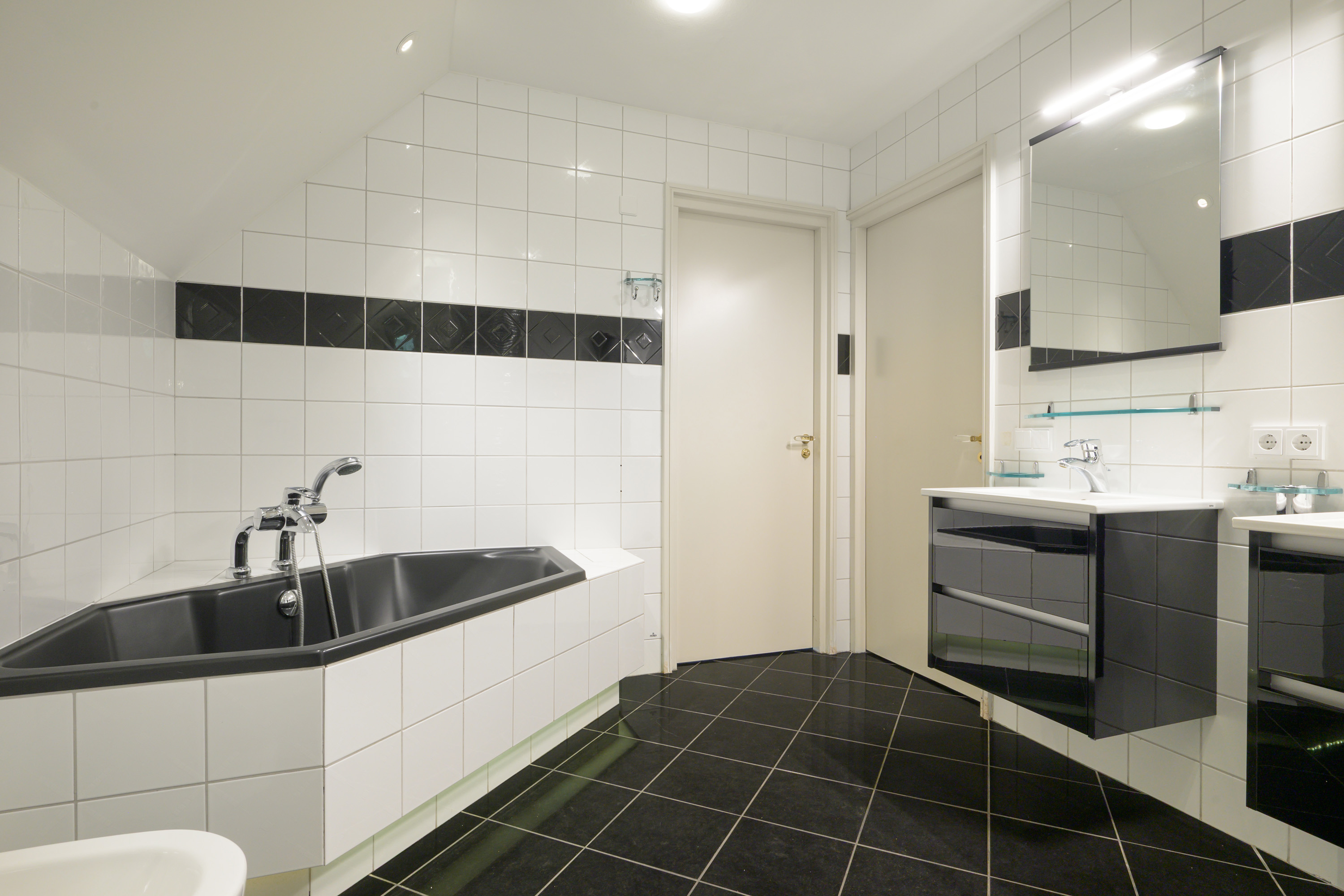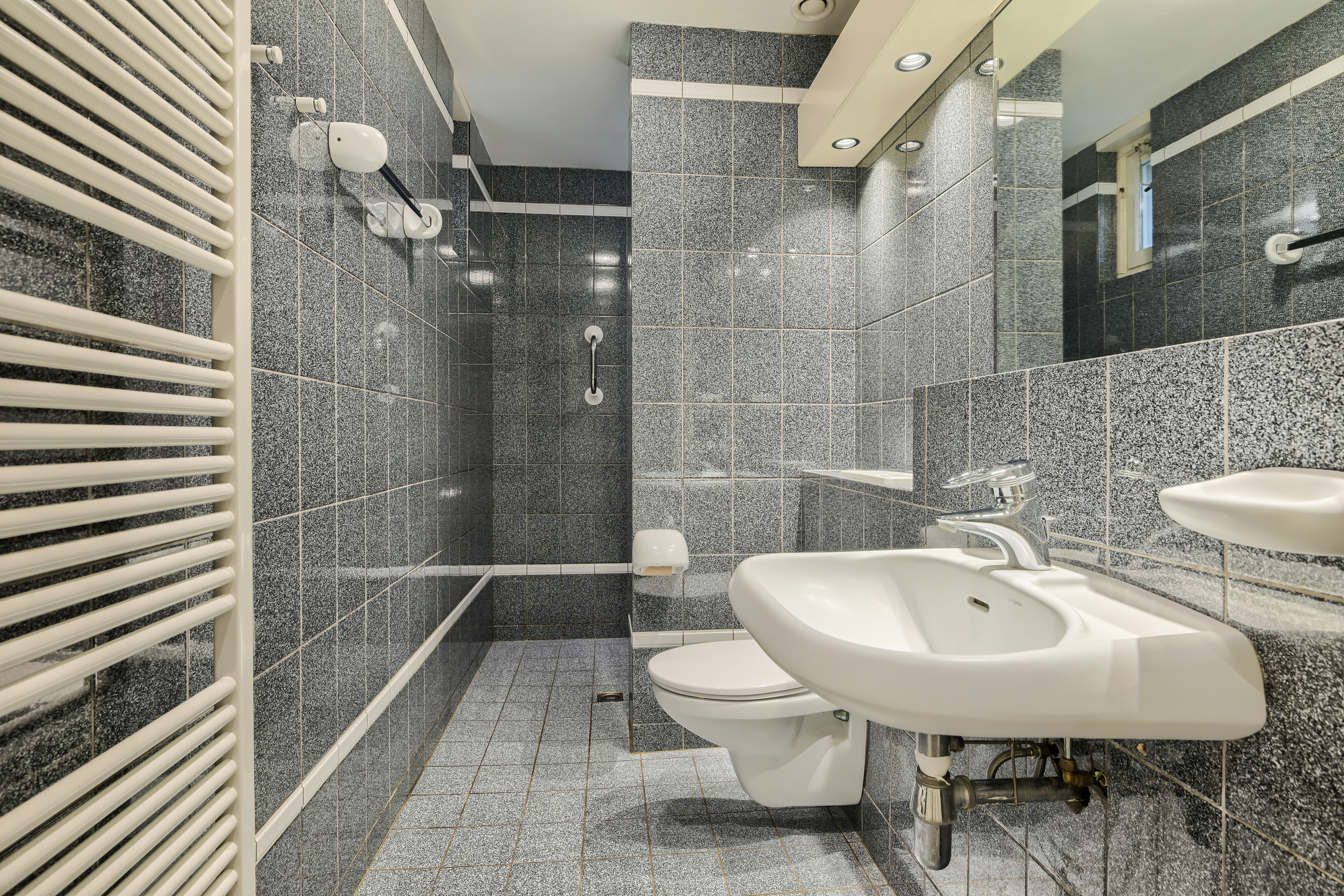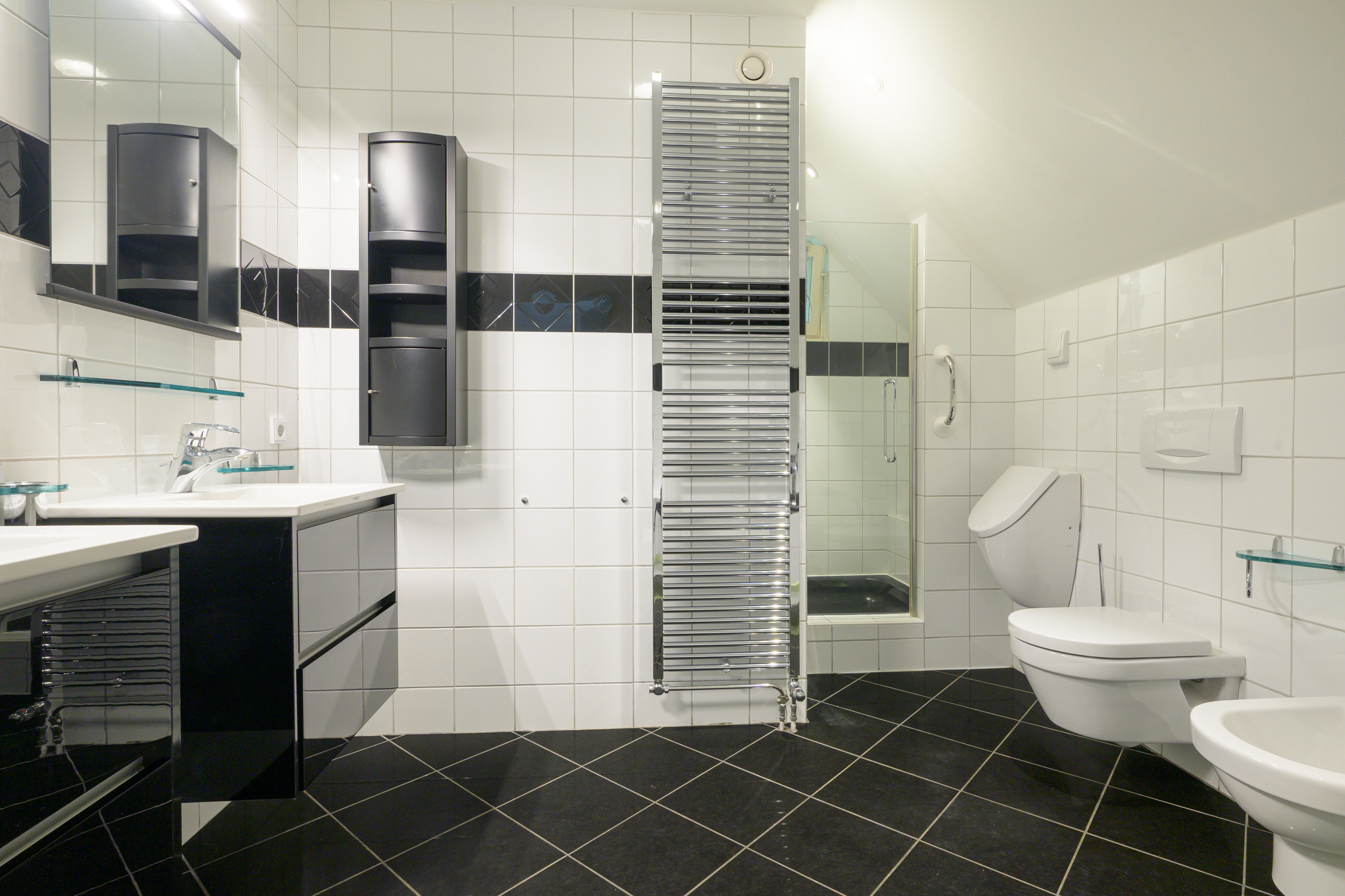 The bathroom is fitted with a bathtub, wall-hung toilet with built-in reservoir, urinal, bidet, walk-in shower, designer radiator, and a double washbasin integrated into a vanity unit. This bathroom can also be accessed directly from the corridor.