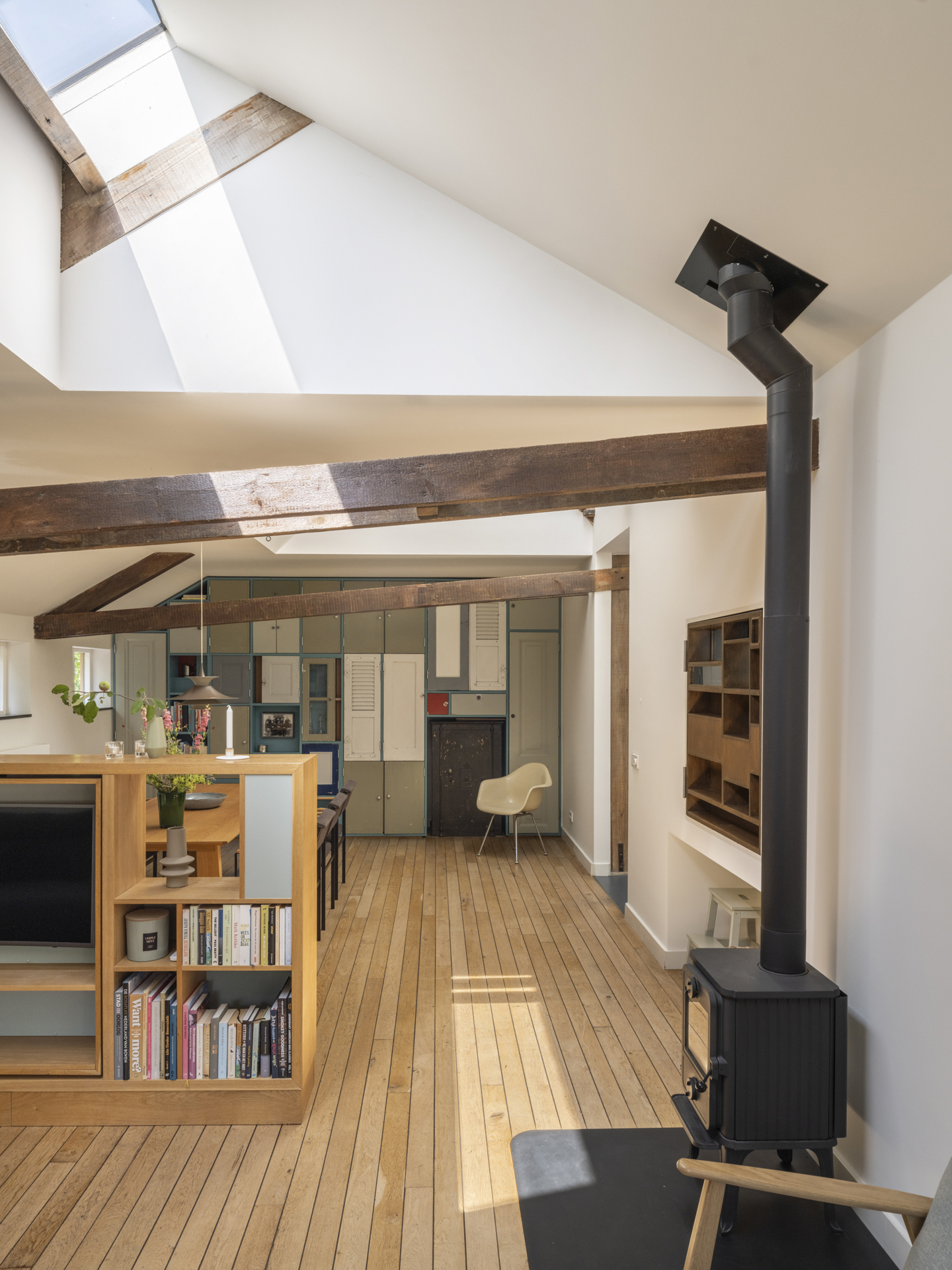 ), the conversion into a modern residence has been executed with exceptional attention to detail and natural light. The original character of the barn has been preserved, while it has simultaneously been transformed into a comfortable, contemporary home. Tapered light shafts connect the ground floor spaces with the roof, positioned in such a way that the existing structural framework and beams remain a visible and integral part of the house.