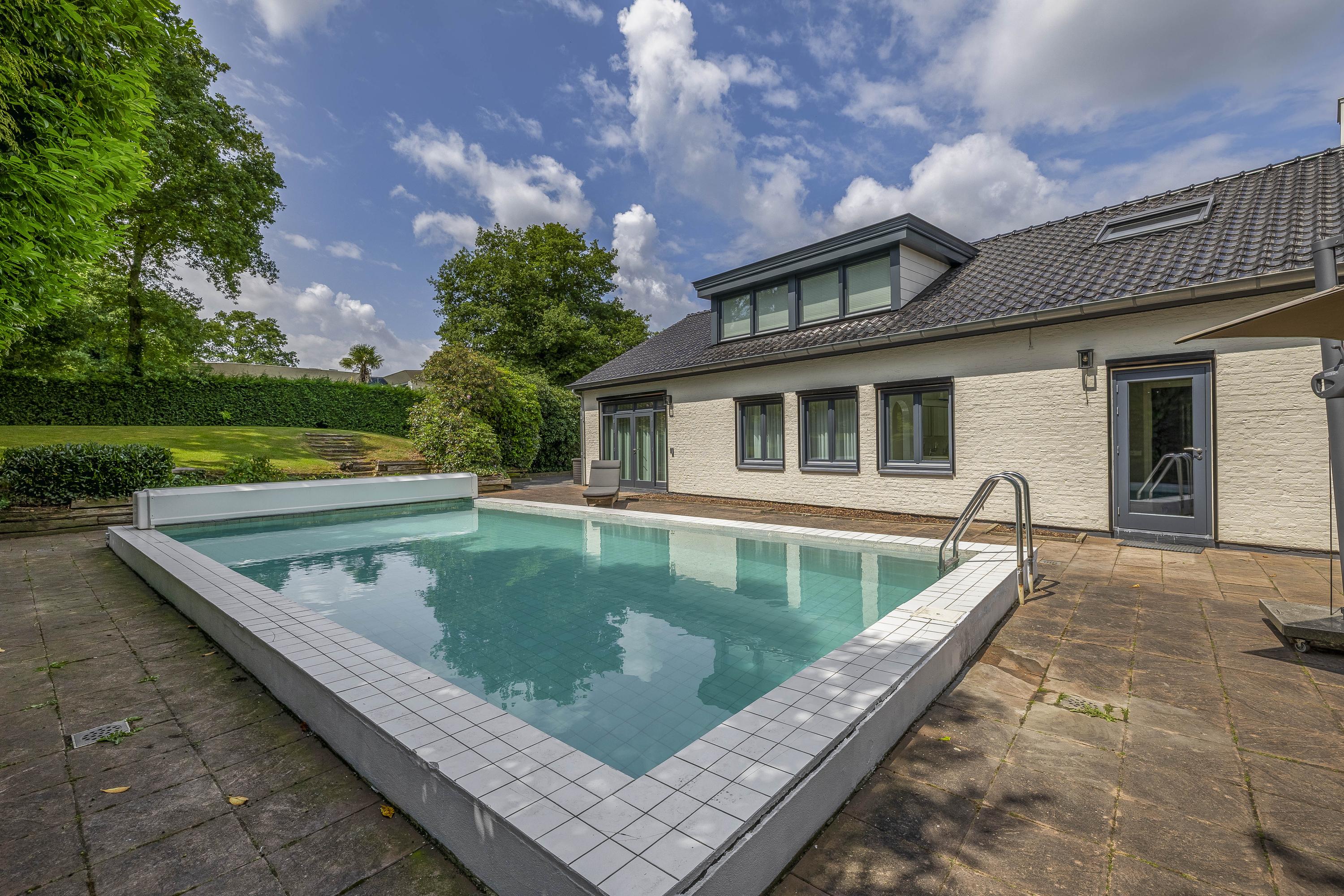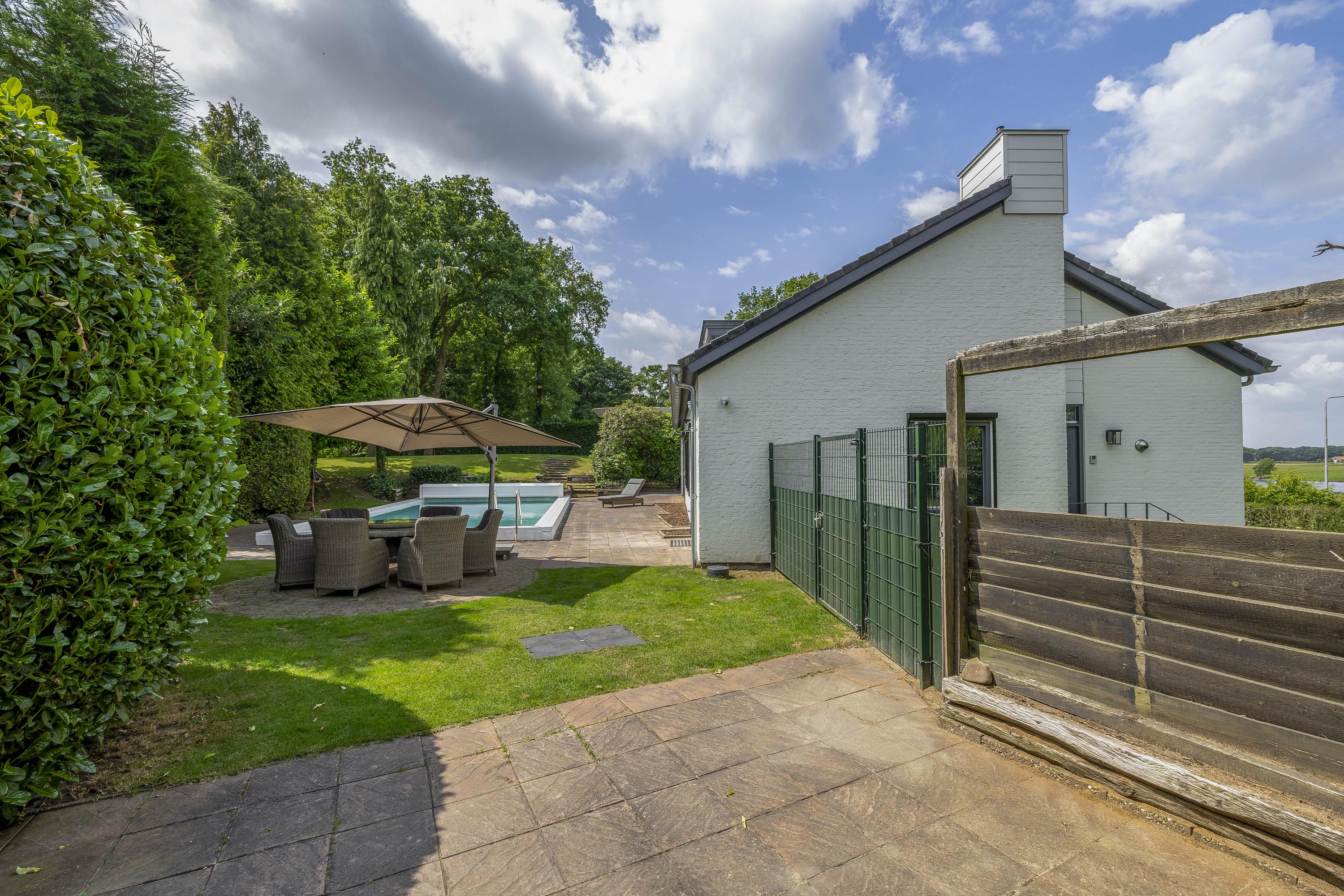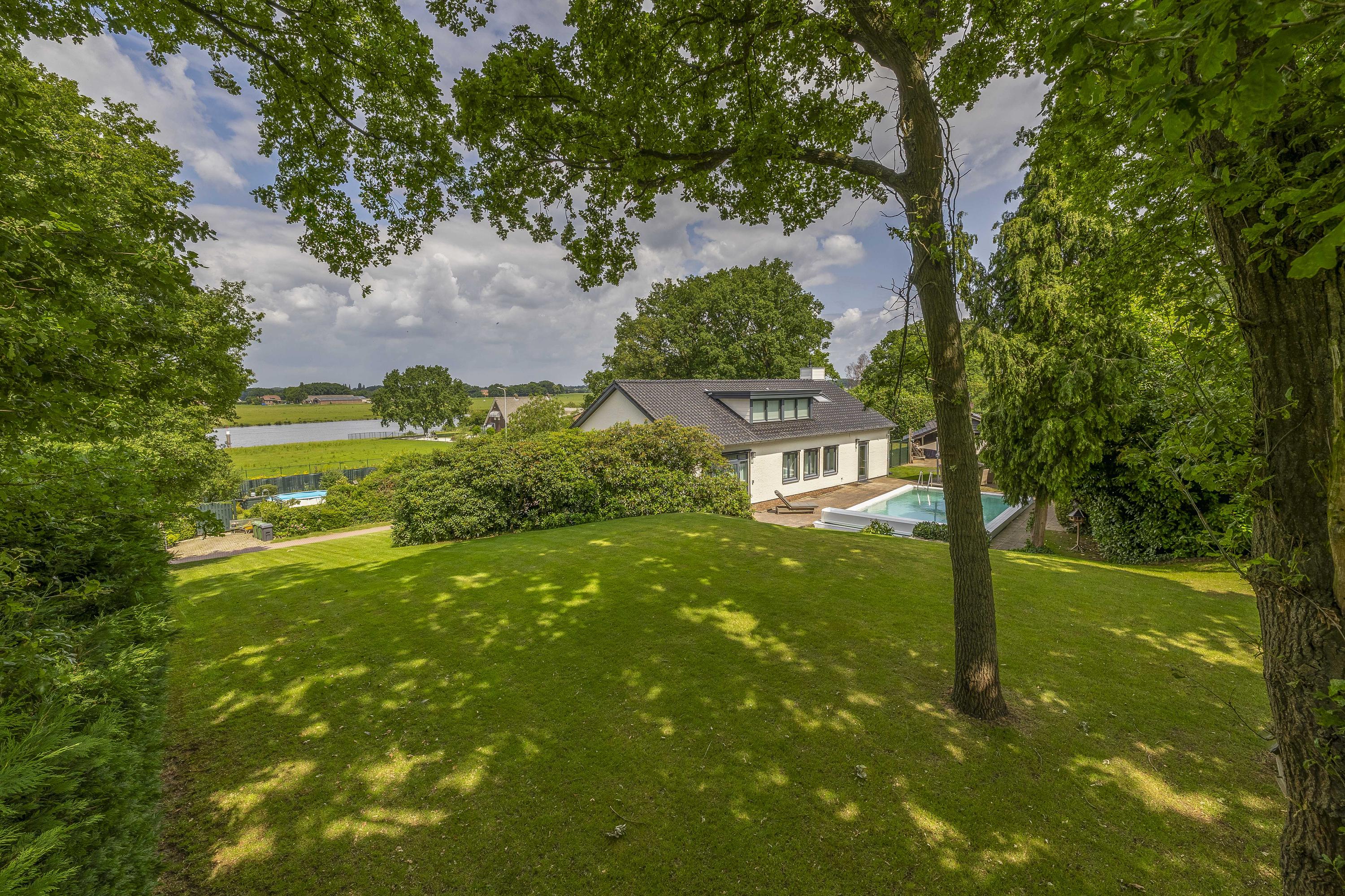 The garden surrounds the entire property. On the left side, a terrace offers a beautiful view of the River Maas. The garden is lush and green. The swimming pool measures approximately 10 x 5 meters. The private driveway provides parking space for multiple cars.
