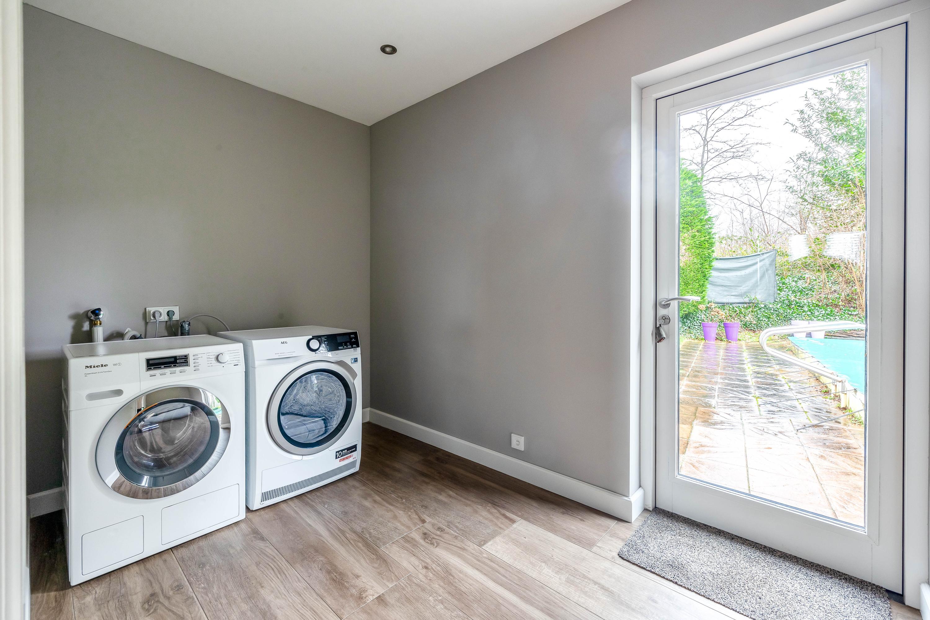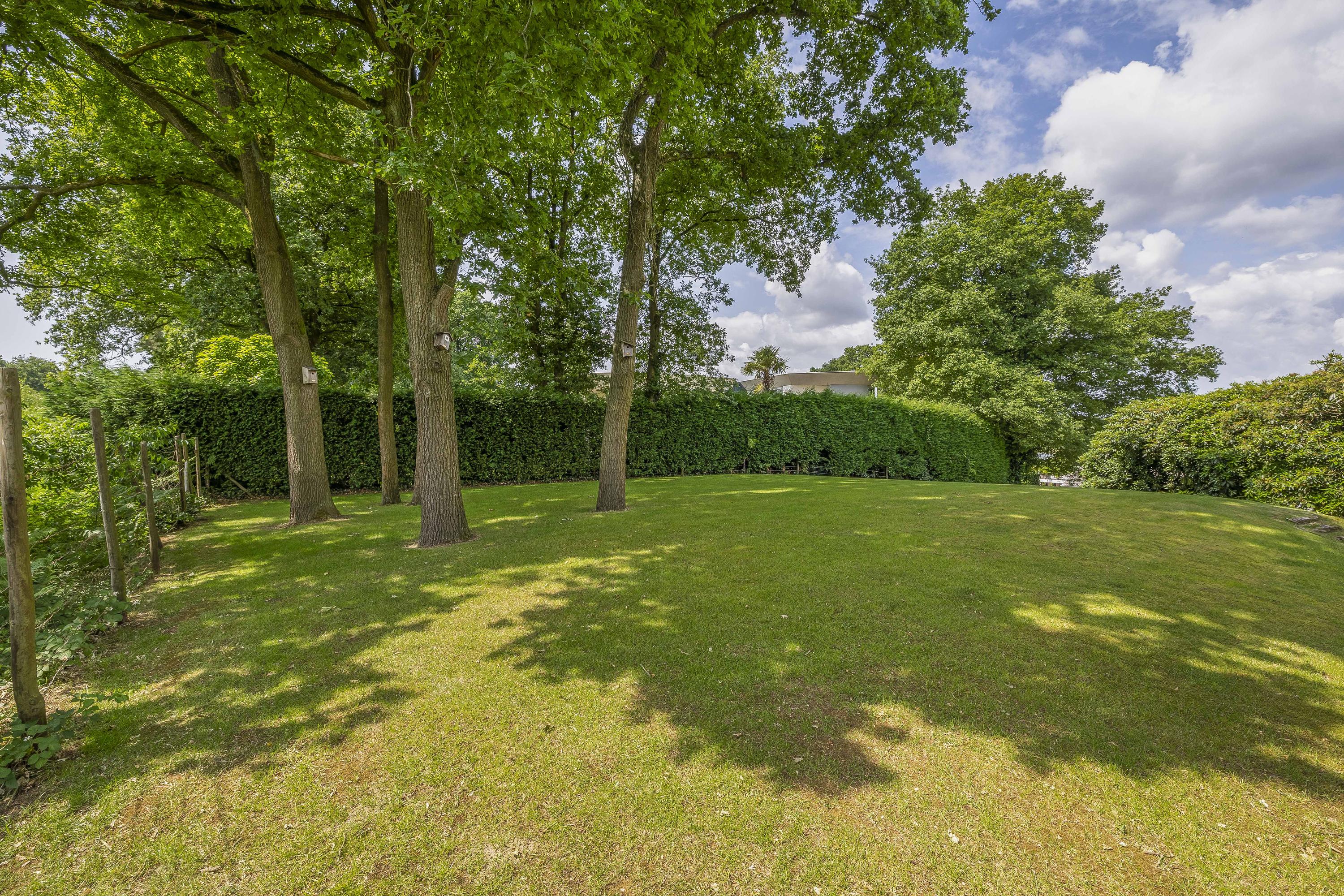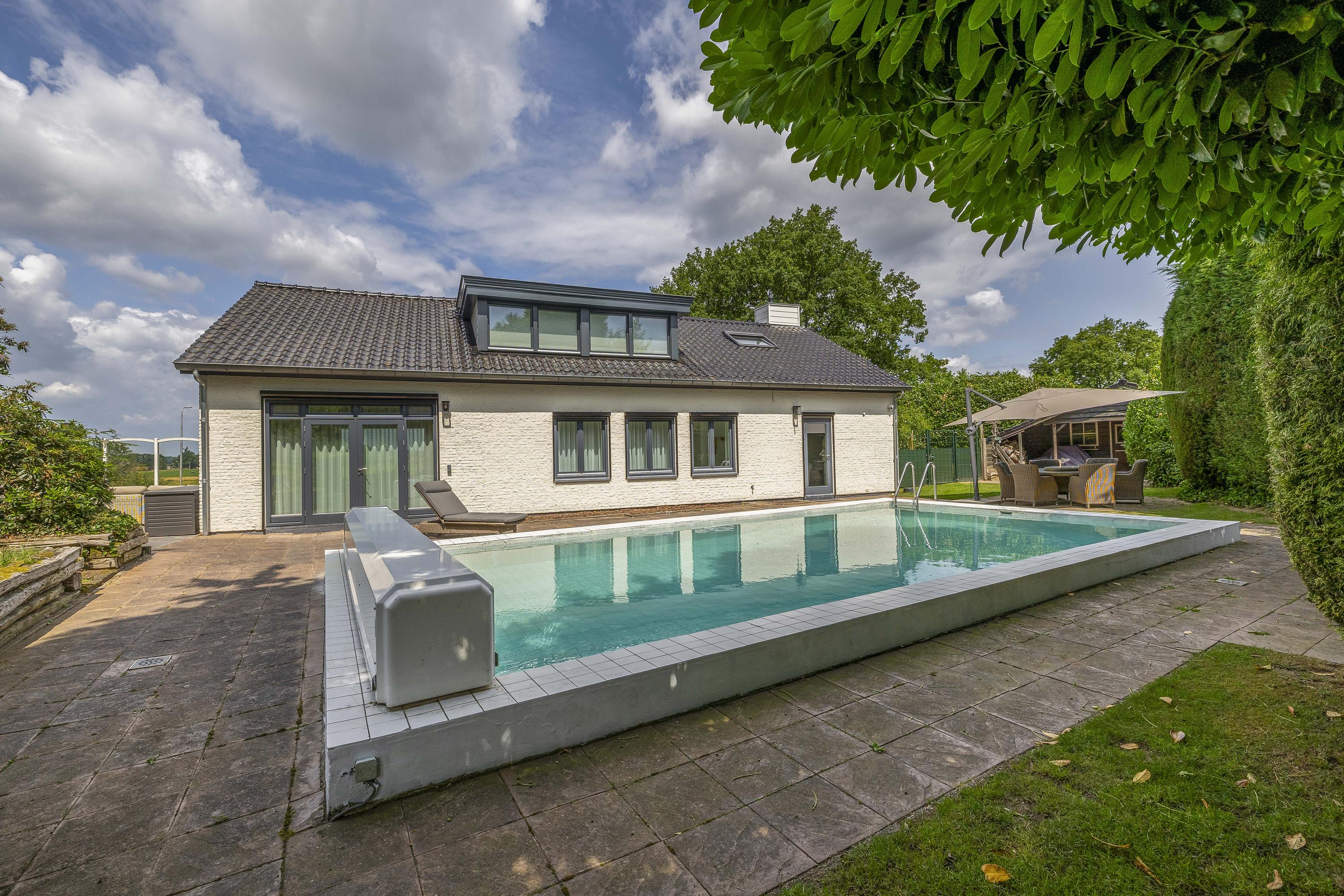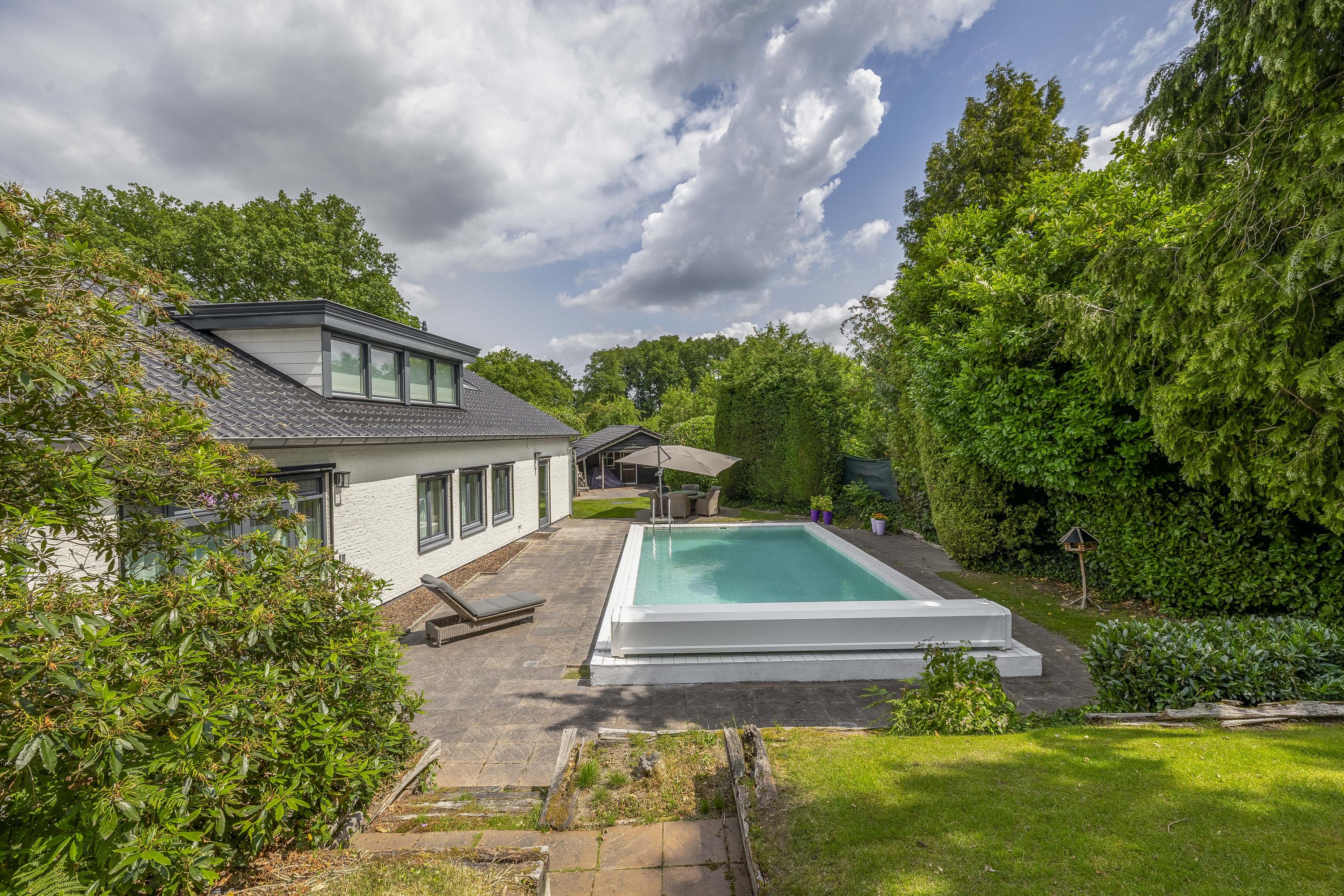 The garden surrounds the entire property. On the left side, a terrace offers a beautiful view of the River Maas. The garden is lush and green. The swimming pool measures approximately 10 x 5 meters. The private driveway provides parking space for multiple cars.