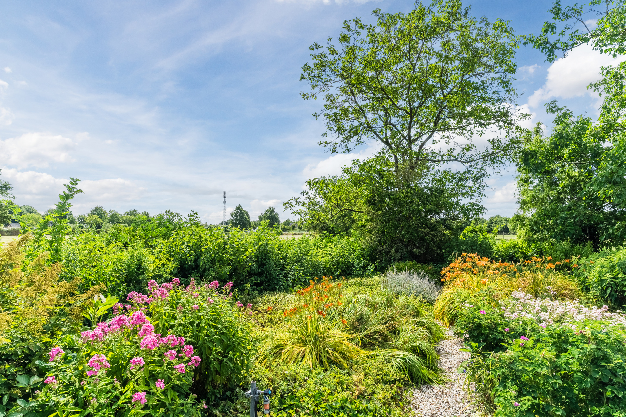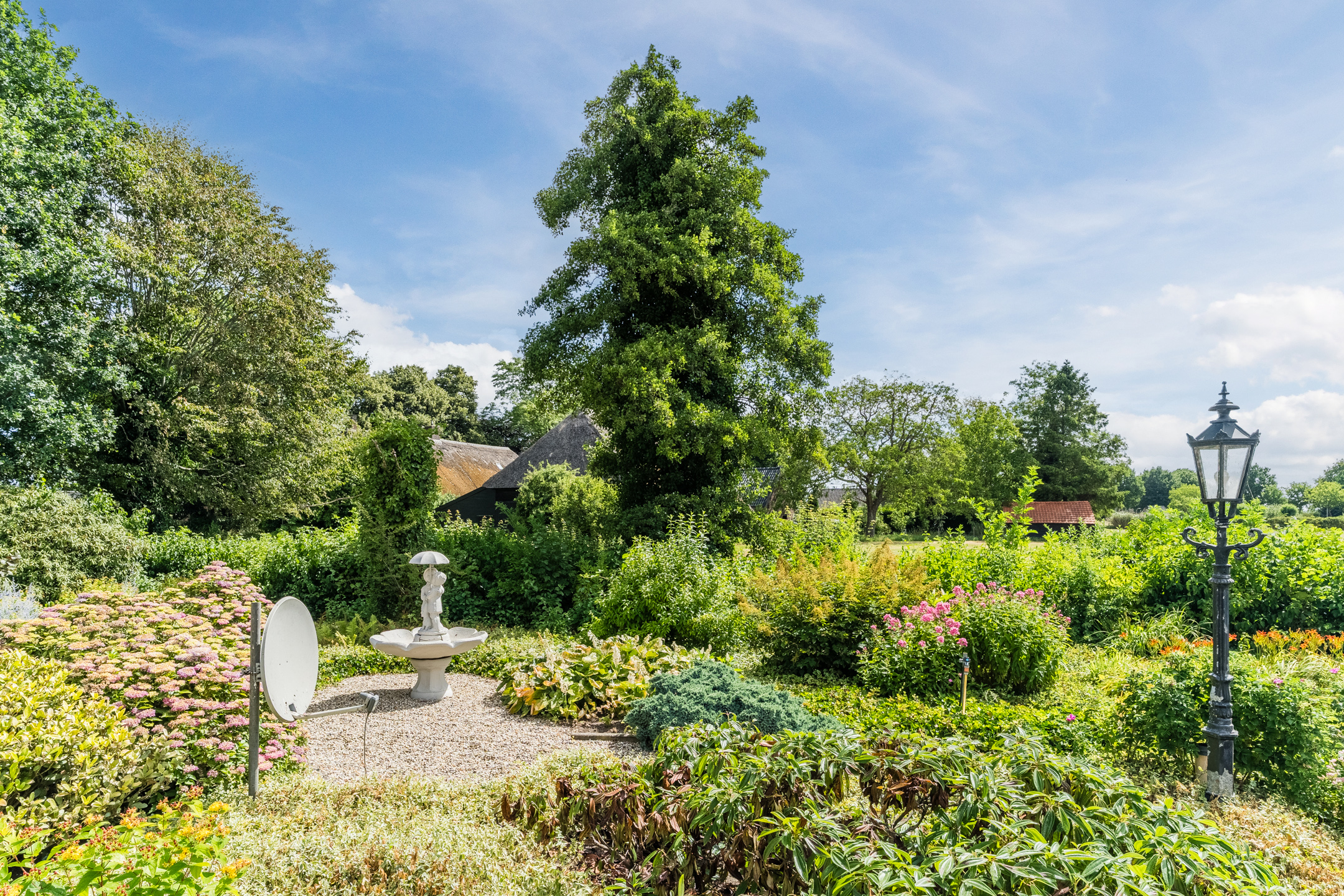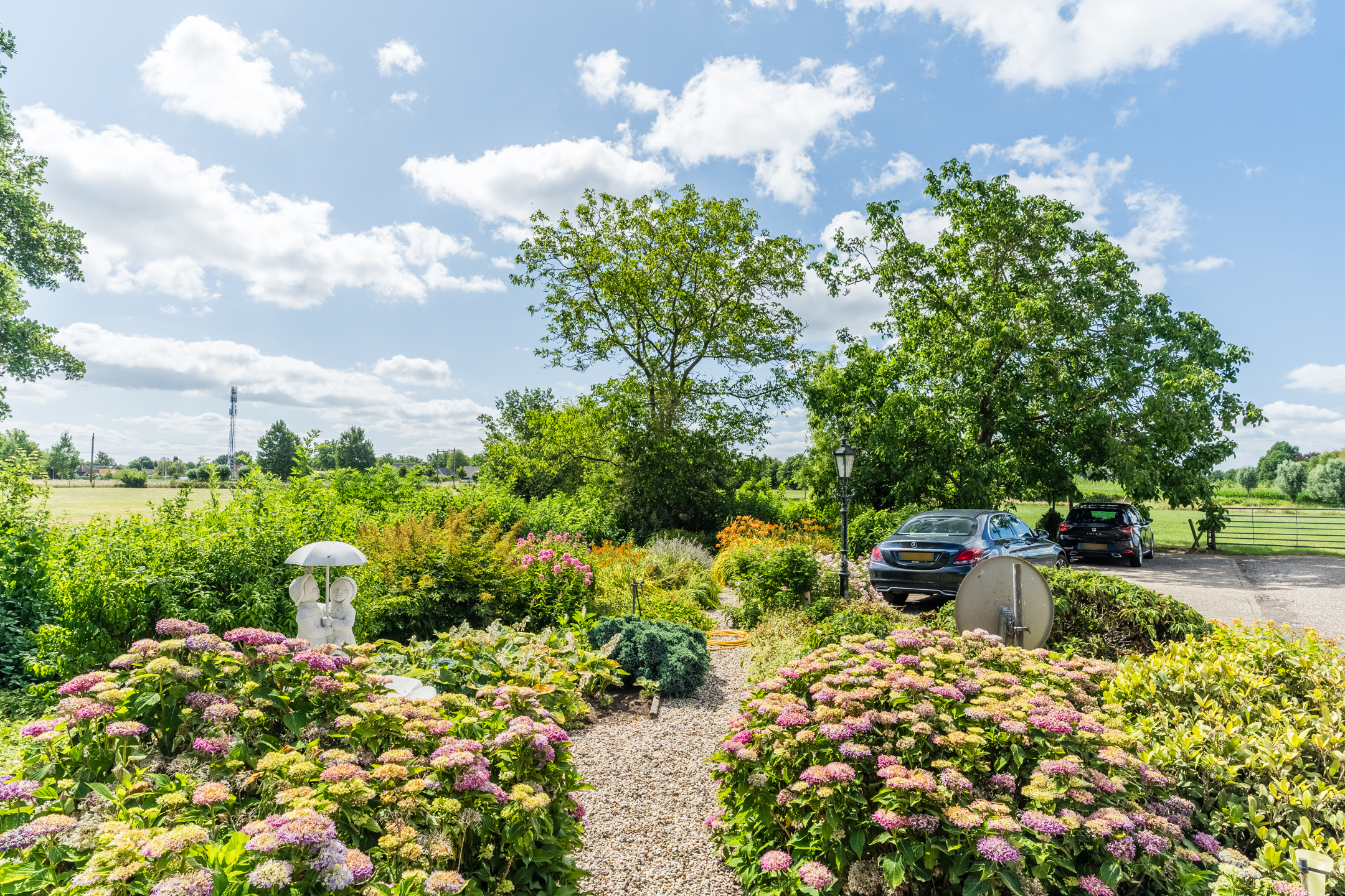 The garden is mature, beautifully maintained and offers total privacy. It features garden lighting, a private water well, and a large driveway with parking for multiple vehicles.