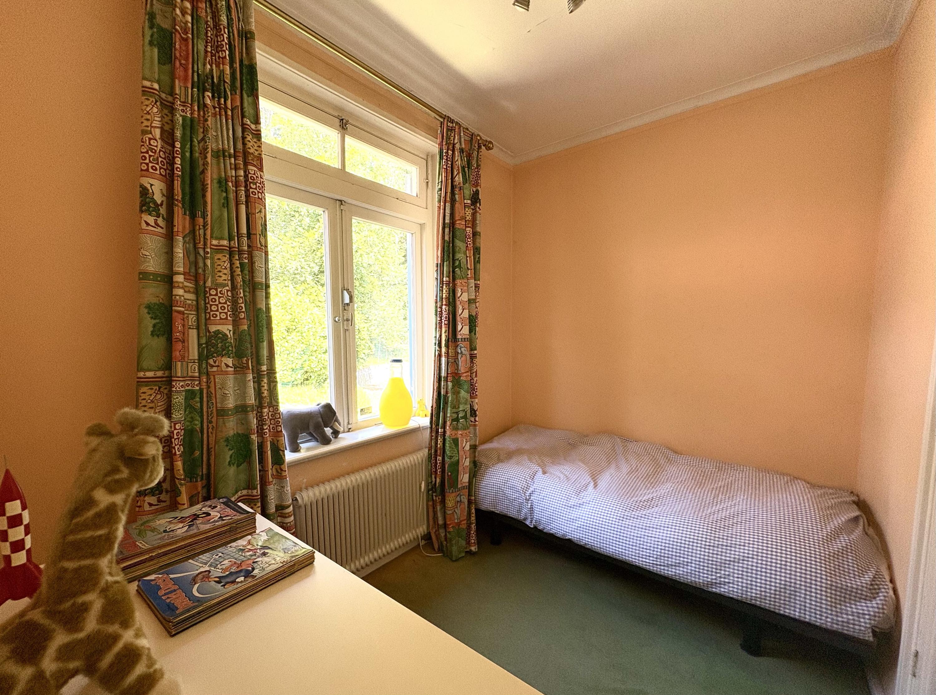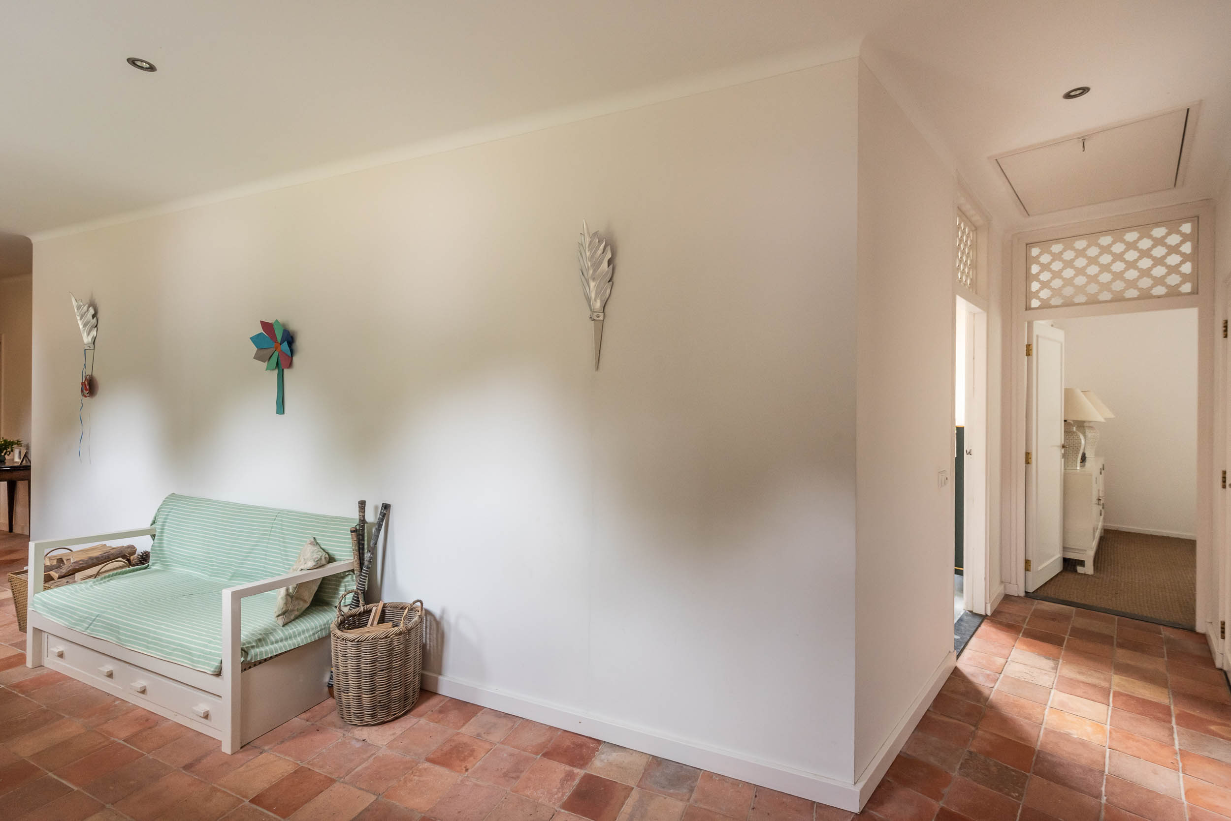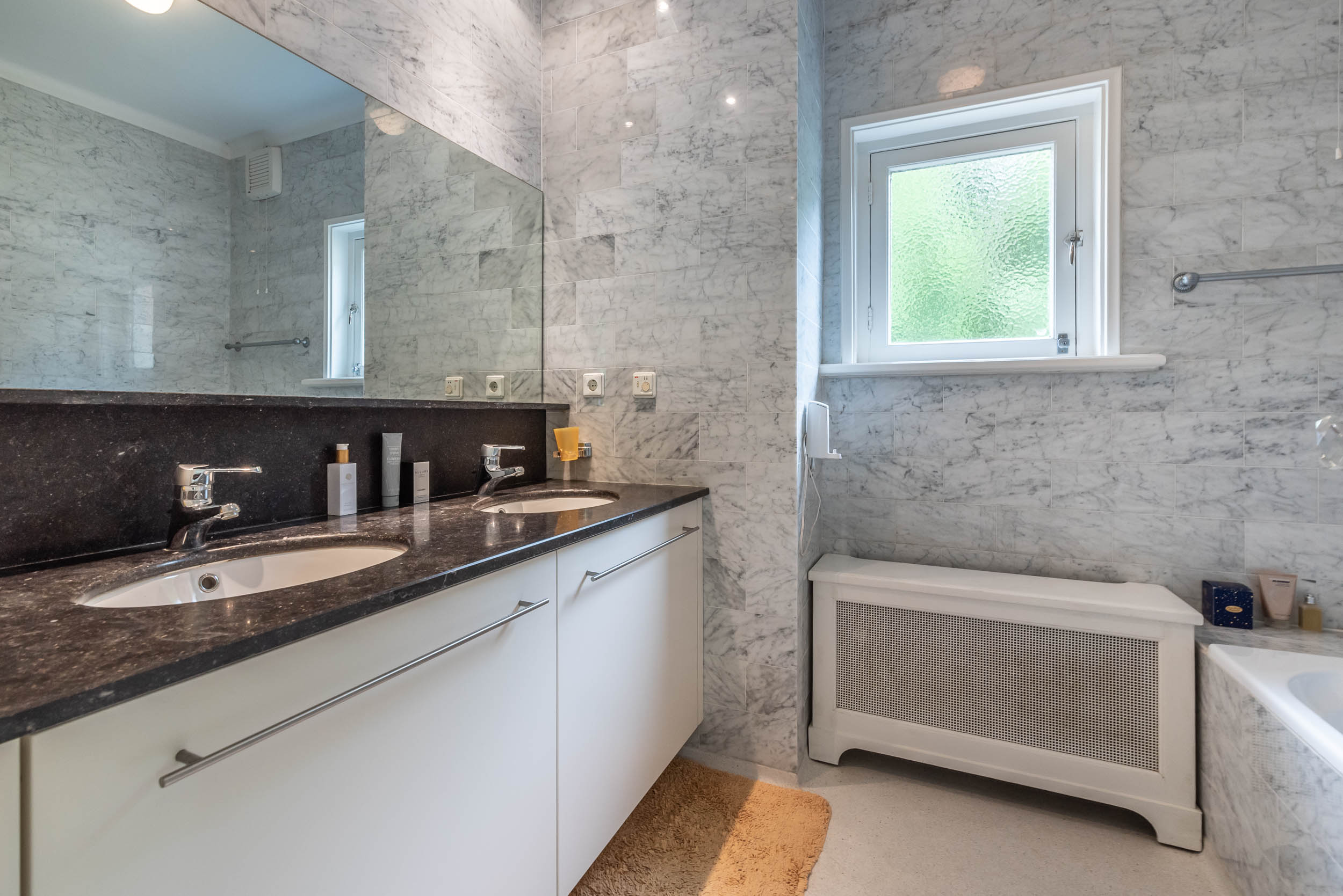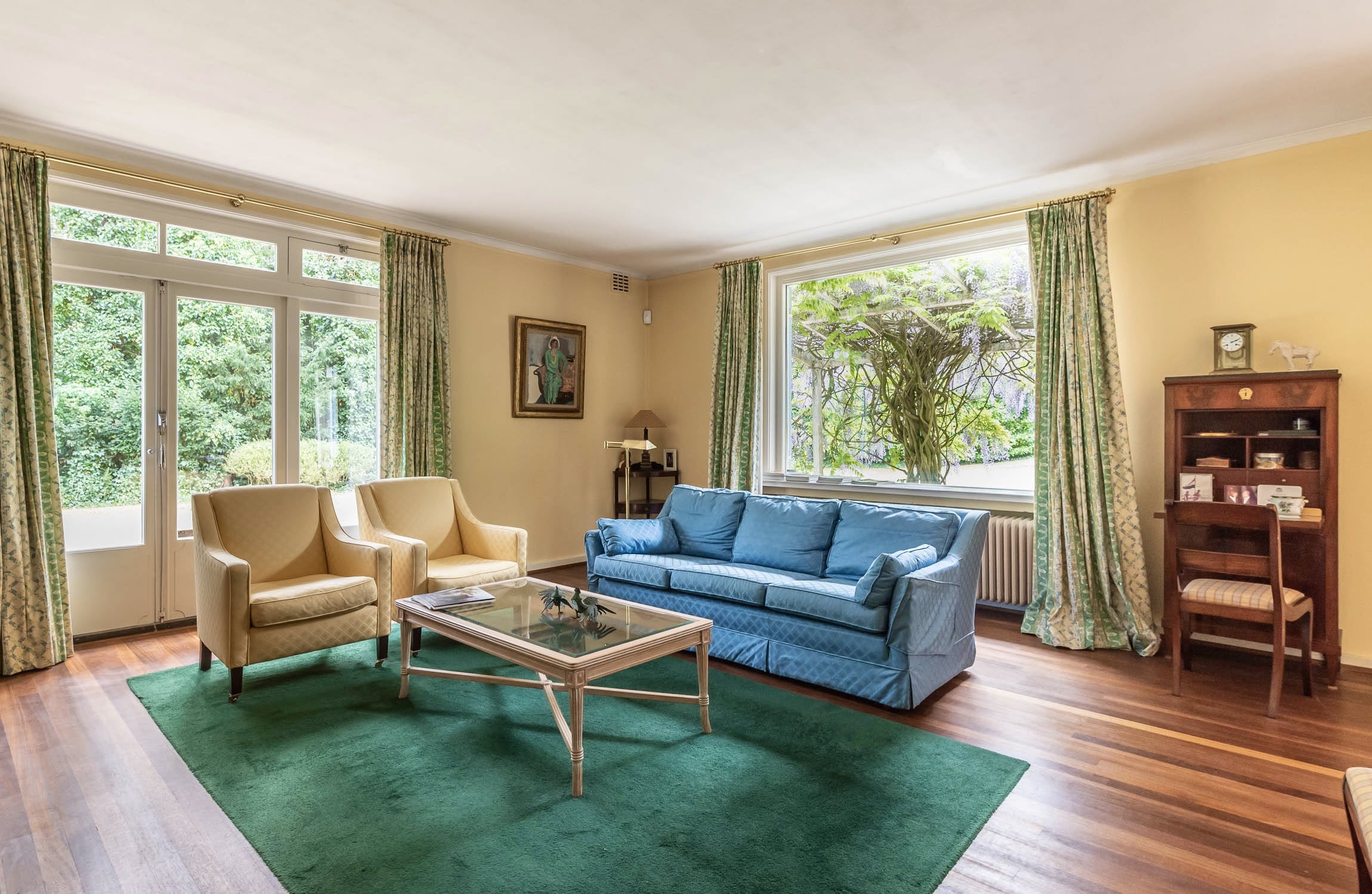 Original part: entrance, welcoming hallway with Piet Jonker tiled floor, passageway to separate cloakroom and WC with hand basin. Light and airy living room overlooking the beautiful garden fitted with a fireplace, parquet floor, custom-made bookcase and French doors to the garden. The living room has an open-plan connection to the dining room with a study that adjoins it. The hallway leads to the basement and garage, as well as three bedrooms and a second bathroom. The master bedroom comes with an en suite bathroom with a bathtub, a double vanity unit and underfloor heating, plus walk-in wardrobe and French doors that open onto a balcony and garden.