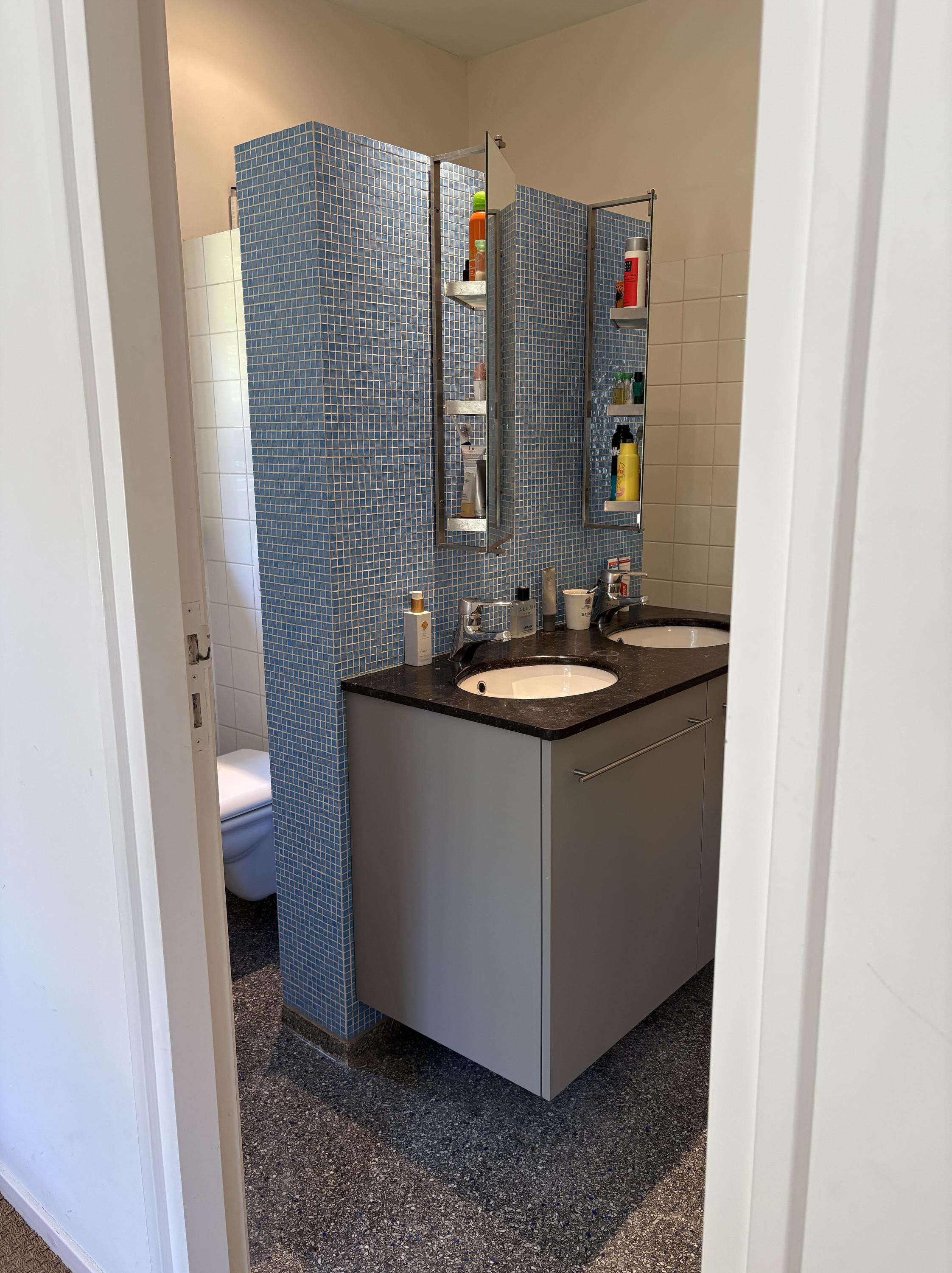 Extension from 2001: a lovely, spacious kitchen with high ceilings, a fireplace, a terrazzo floor with underfloor heating, and French doors that open onto a sunny terrace. The Bulthaup kitchen comes with a kitchen island and a range of appliances, including a Gaggenau steam oven. Deep pantry/utility room with utility sink. Two bedrooms, both of which join a bathroom with WC, bathtub, walk-in shower, double vanity unit and underfloor heating.