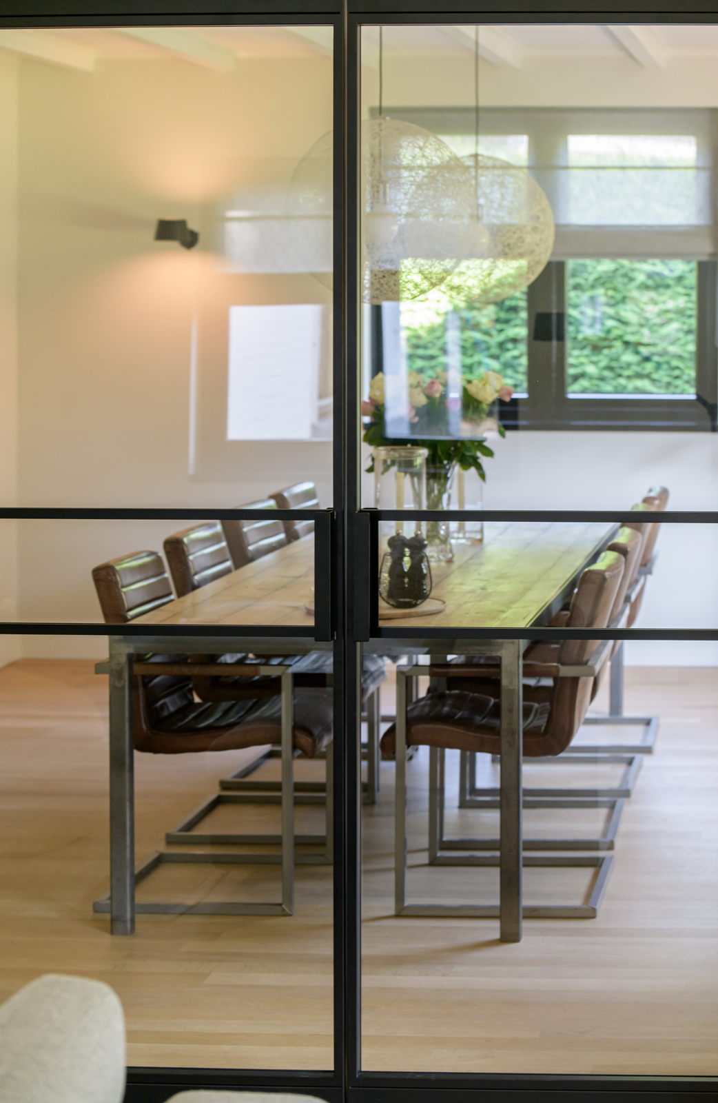 From the sitting room, you also have access to the dining room via glass doors. From the dining room, you can access the kitchen.