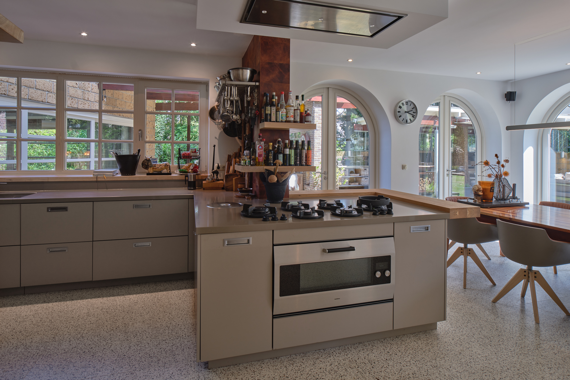 The kitchen has a gas fireplace, spacious dining area and double doors to the garden. This gives a nice connection with the garden and the outdoor kitchen. Here you bring the outside in.