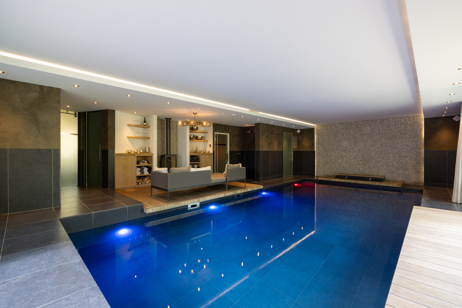 This space is equipped with two large sliding doors that can be opened, giving you the feeling of an outdoor swimming pool. This also creates a beautiful integration with the terrace, the great outdoor space and the garden.