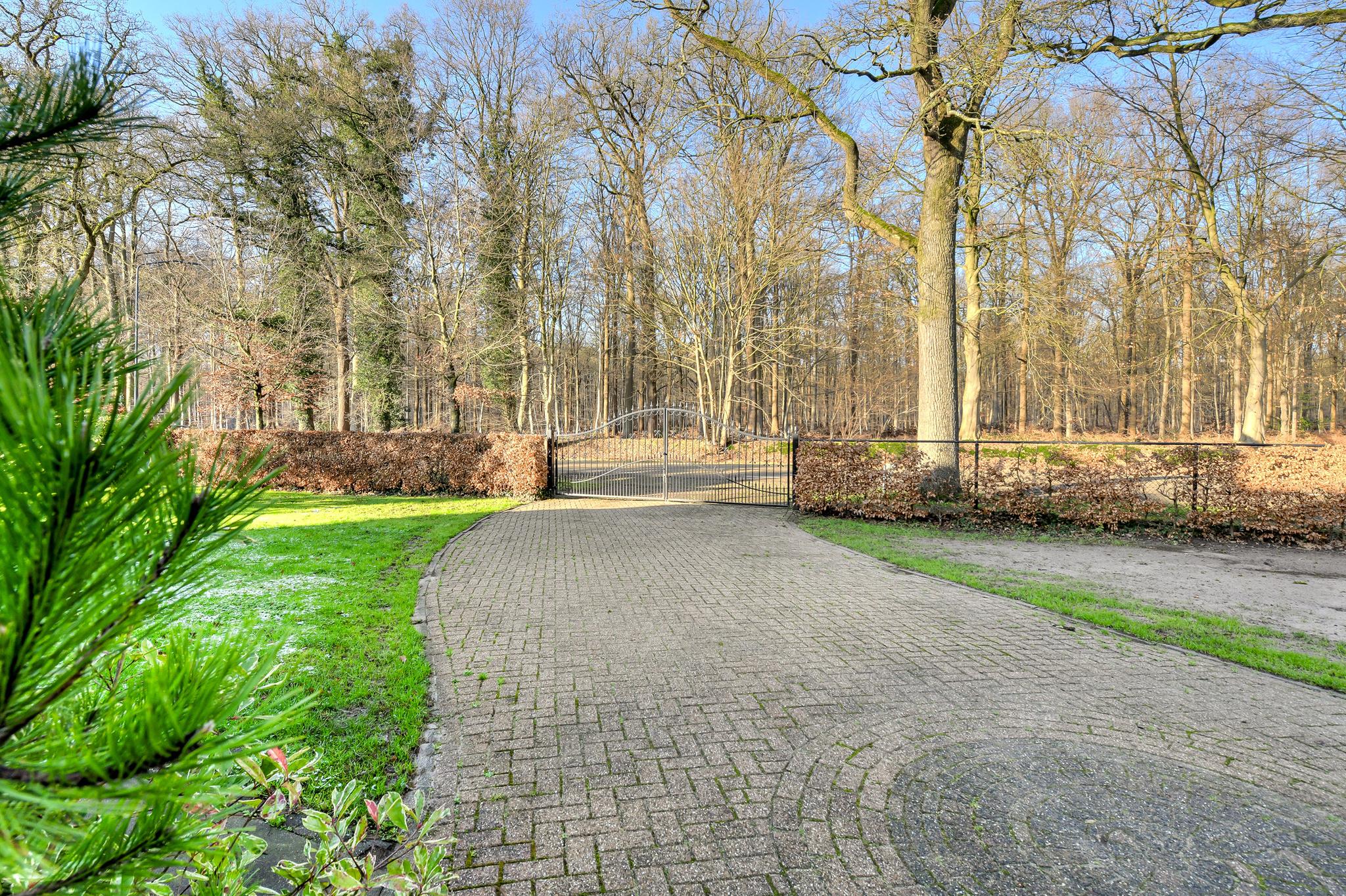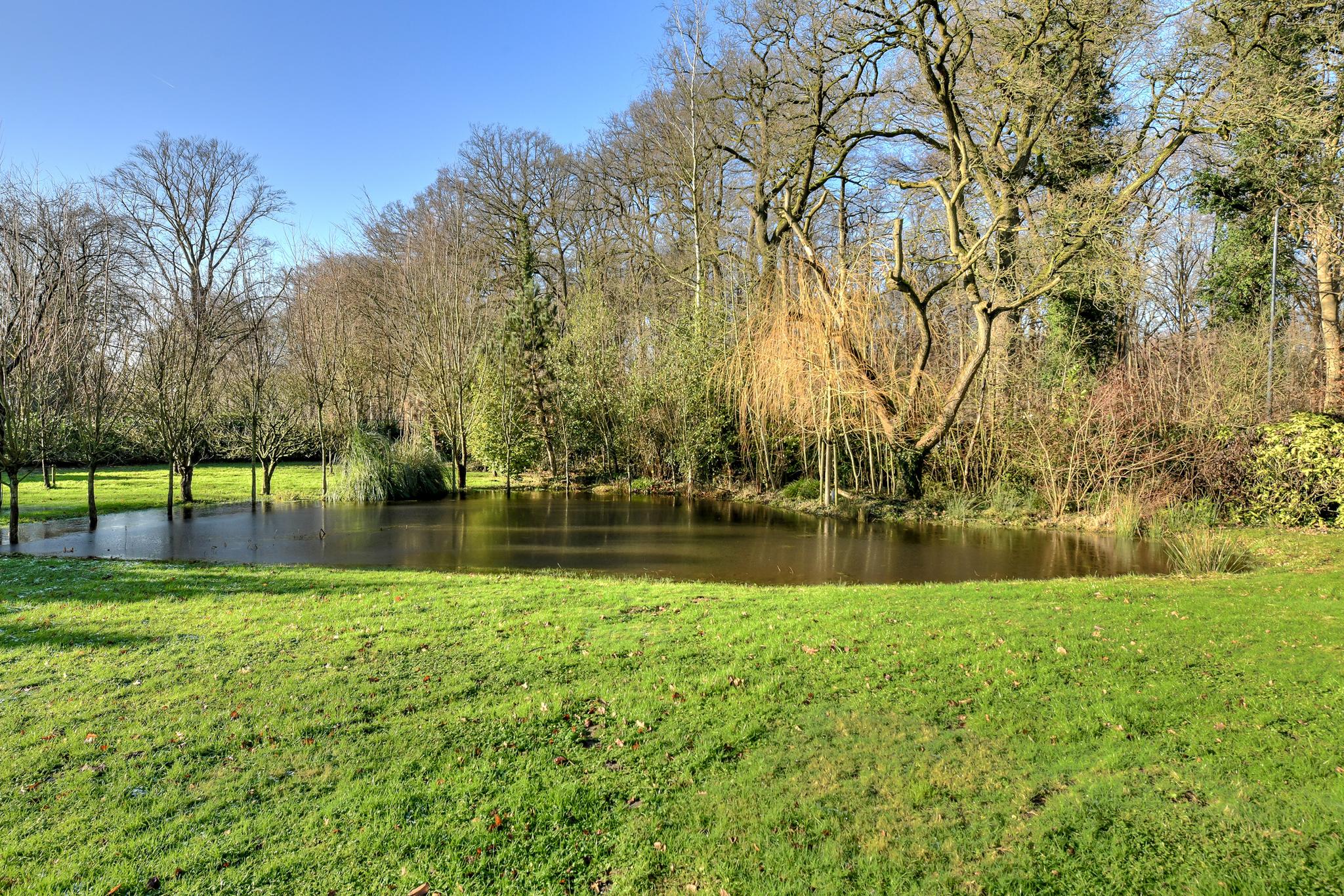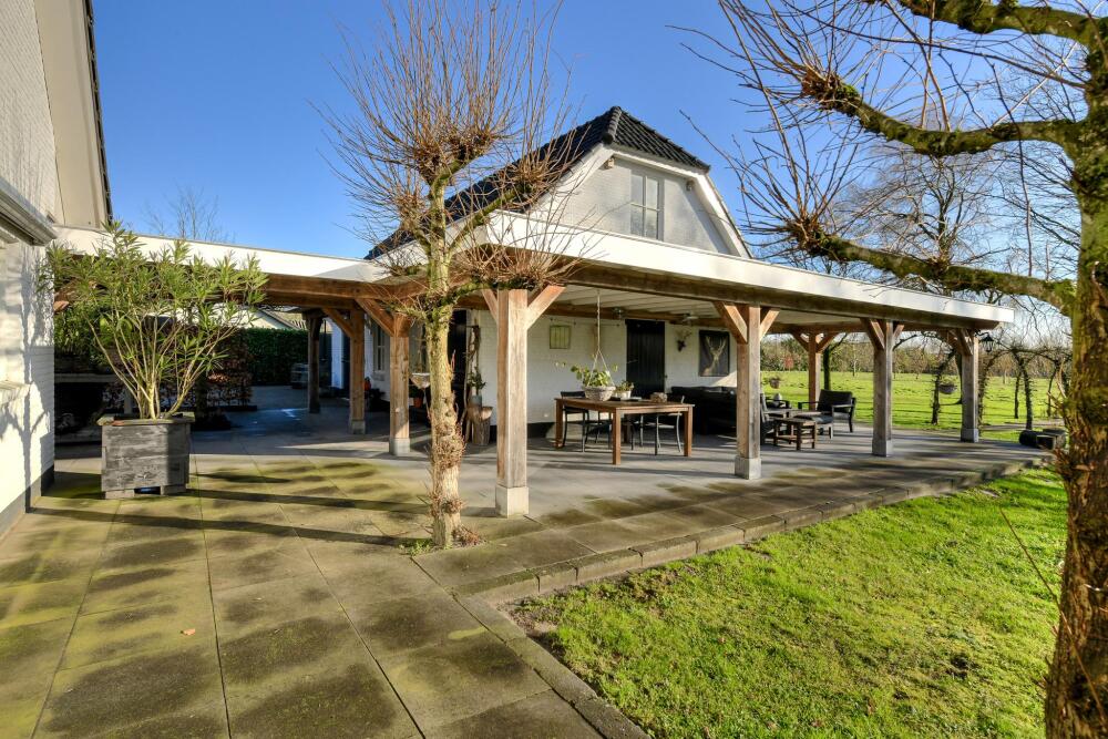 The beautiful, fully enclosed garden surrounds the home, offering maximum privacy and blending seamlessly into the natural surroundings. Several terraces have been laid out around the house with clean-lined concrete tiles. A veranda is situated between the house and the outbuilding and continues alongside and behind the outbuilding, offering wonderful views of the garden. Part of the veranda is equipped with patio heating. The garden includes a large lawn, a fruit orchard, and various trees and hedges. A lovely pond is located next to the house. The driveway, finished with decorative paving, leads to both the carport (space for two vehicles) and the large barn.