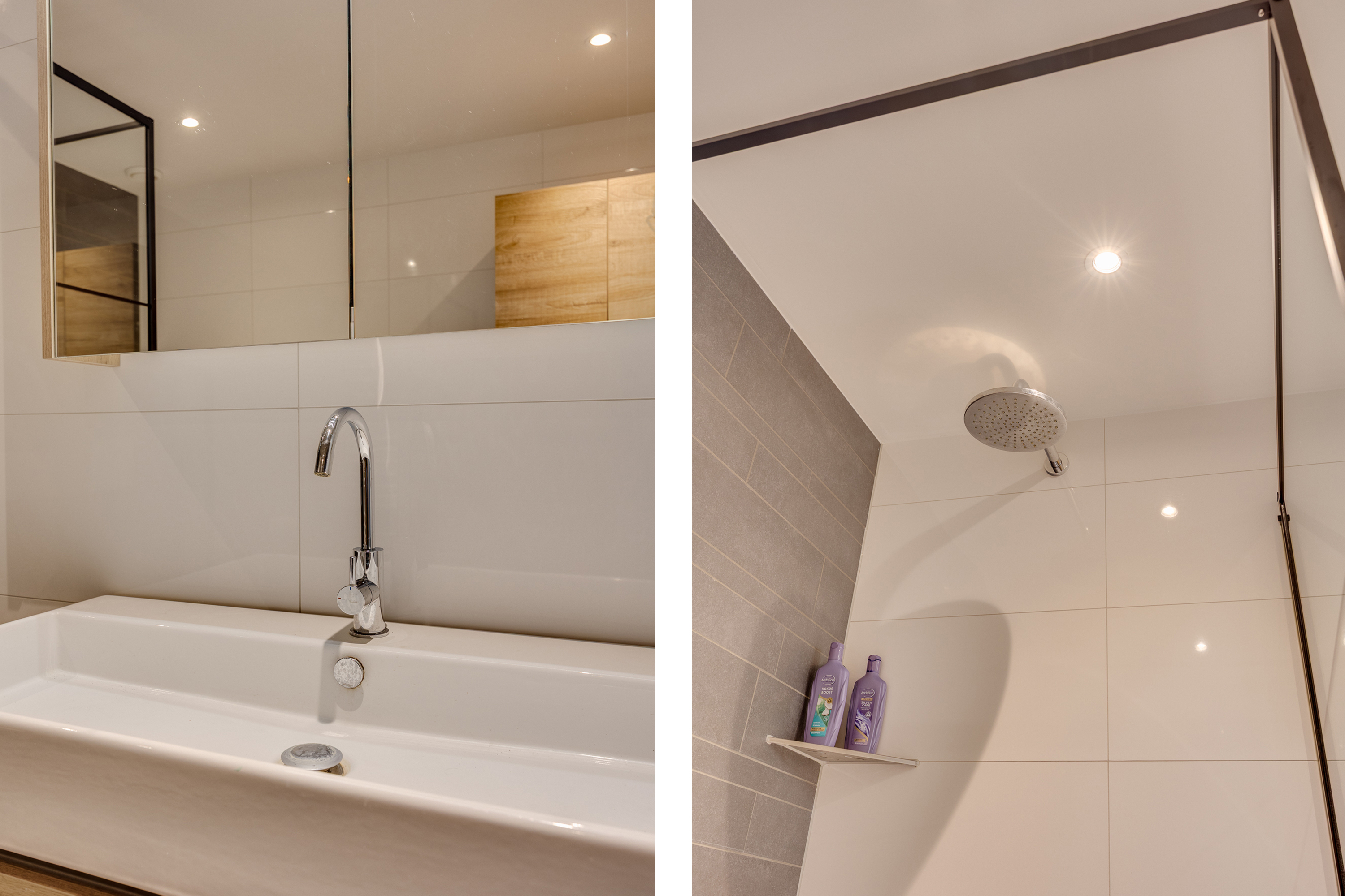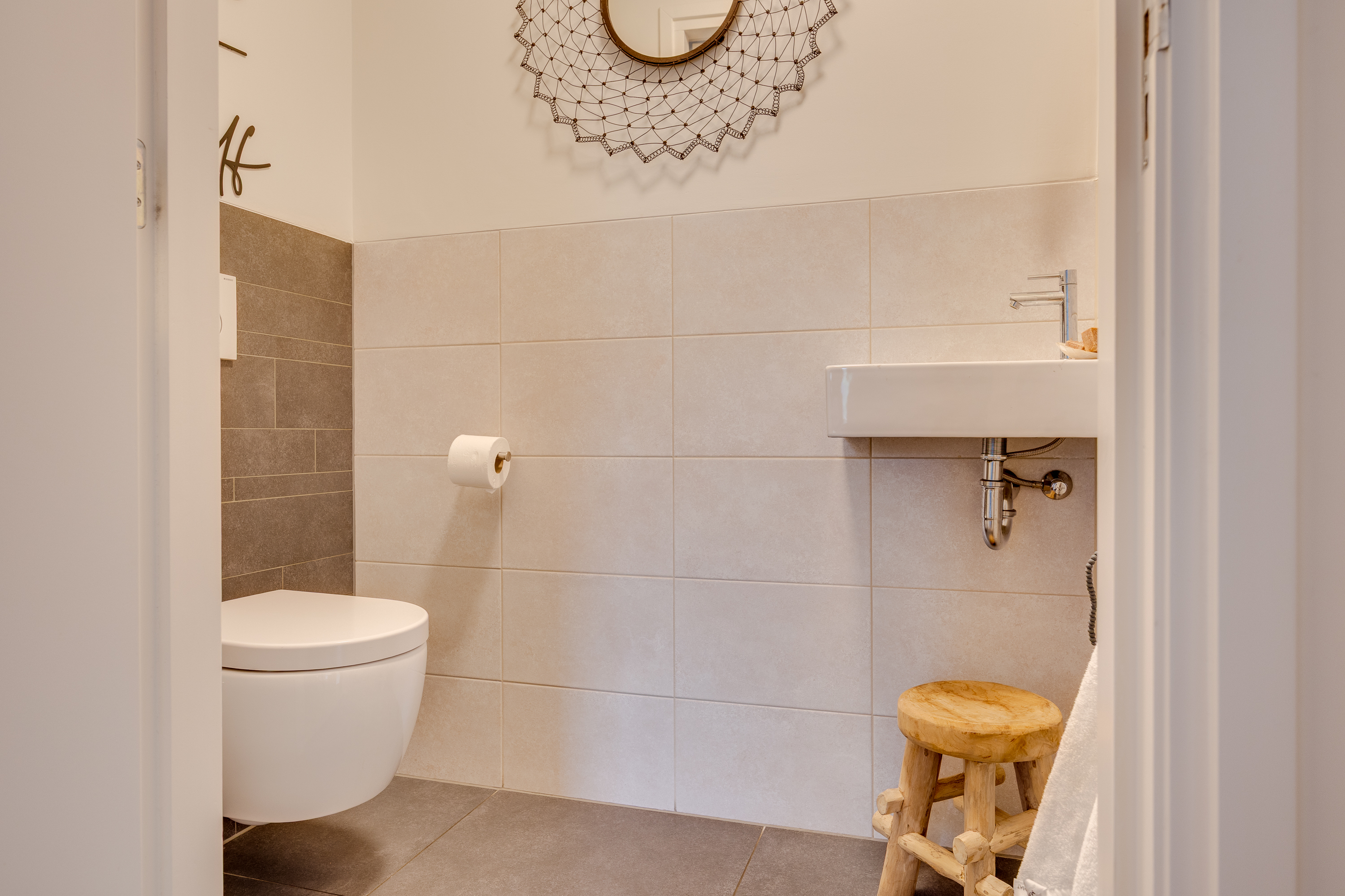 Through a hallway with built-in cupboards and space for an extra refrigerator, you step right onto the roof terrace. This spacious, sunny terrace is fully tiled and equipped with an attractive canopy, a fixed bench, and a custom-made table. Here you will experience complete peace and privacy, right in the center of town. A wonderful outdoor retreat, perfect for dinners, drinks, or a cup of coffee in the morning sun.