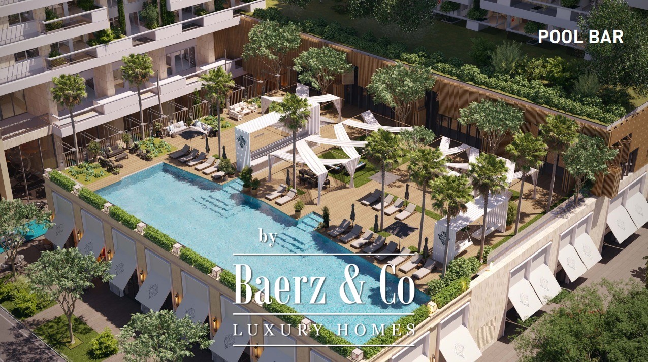 Within the project, residents access an elevated amenity suite: an infinity pool with bar, rooftop venues, private beach and beach bar, wellness centre, gym, concierge, and secure indoor parking. The on-site shopping mall and curated dining complement daily life with subtle luxury.