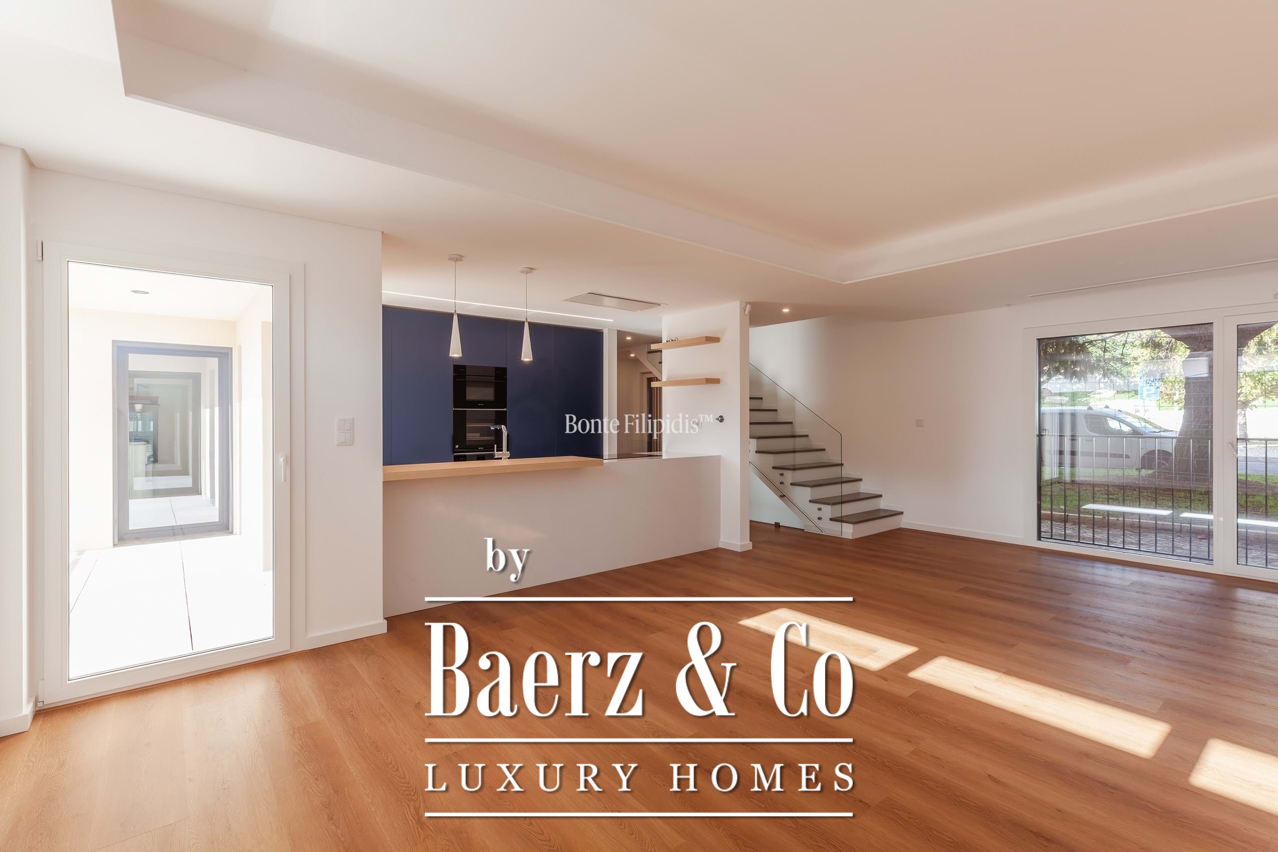 This townhouse Carcavelos e Parede draws on contemporary architecture to create a quietly distinguished living environment, spanning 217 m² across three well-considered floors. The open-plan kitchen, equipped with high-end appliances, connects seamlessly with the living room, inviting natural light while linking interiors to outdoor spaces and the landscaped terrace. An additional suite on the entrance level lends versatility and privacy, suitable for guests or adaptable living.