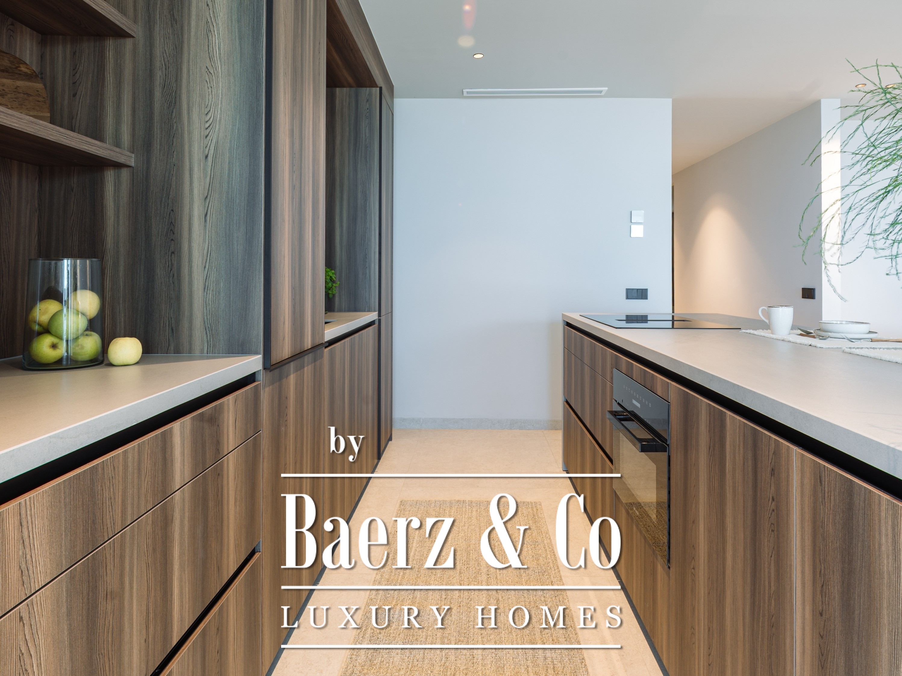 The equipped kitchen showcases top brand appliances, complemented by energy-efficient climate systems and sustainable charging points for vehicles and bicycles. A private garage accommodates two cars and a spacious storage room provides day-to-day ease.