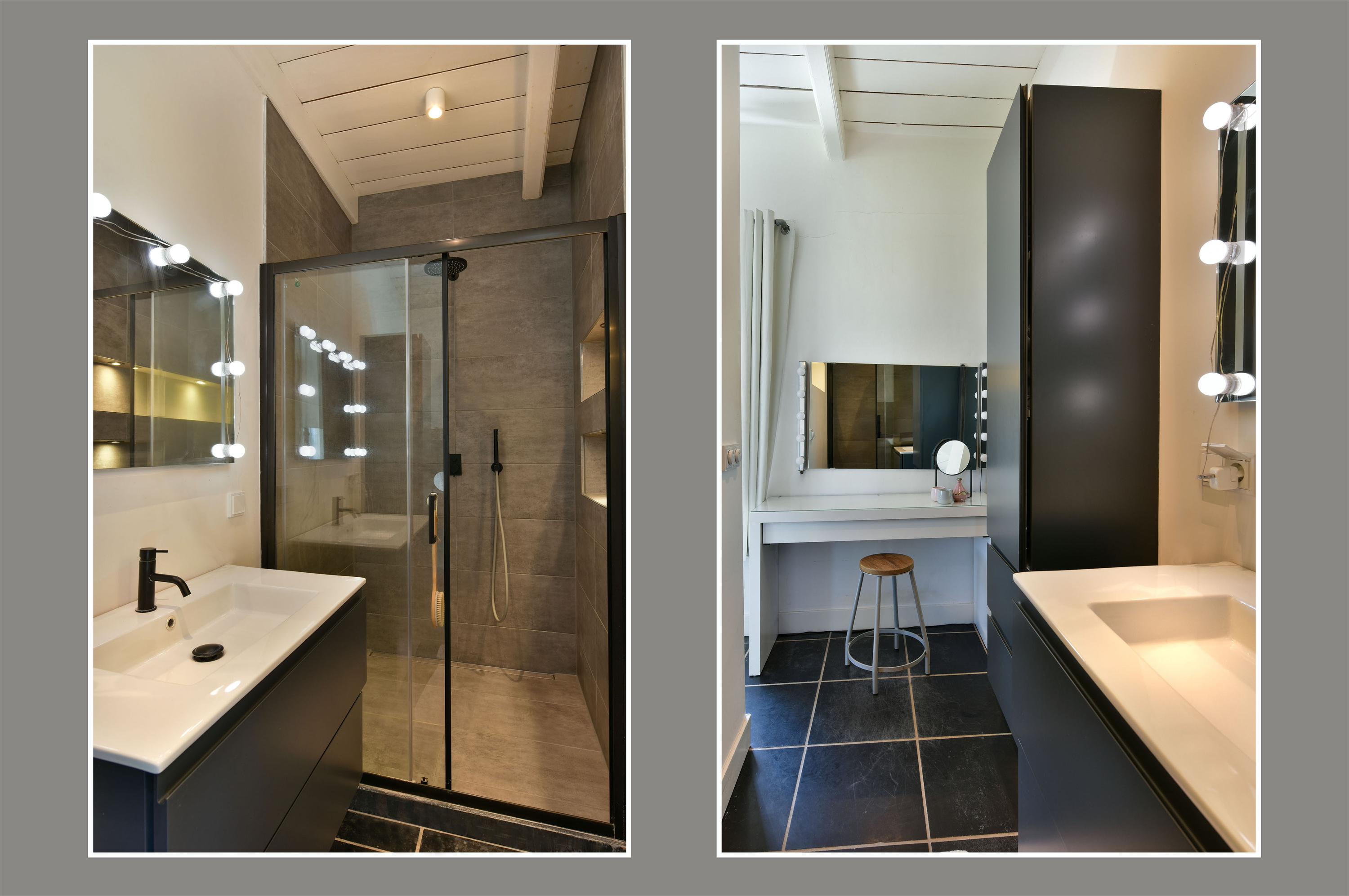 You enter this remarkable farmhouse via the side façade into a spacious hallway with a stunning light-filled mezzanine that immediately emphasizes the home’s height and openness. The hall features a large coat area and a luxurious toilet, with a striking stone washbasin. Behind one of the cabinets, you’ll find the central heating system, along with the meter cupboard. A stylish staircase leads to the upper floor. From the hall, you can access all the main rooms on the ground floor.
