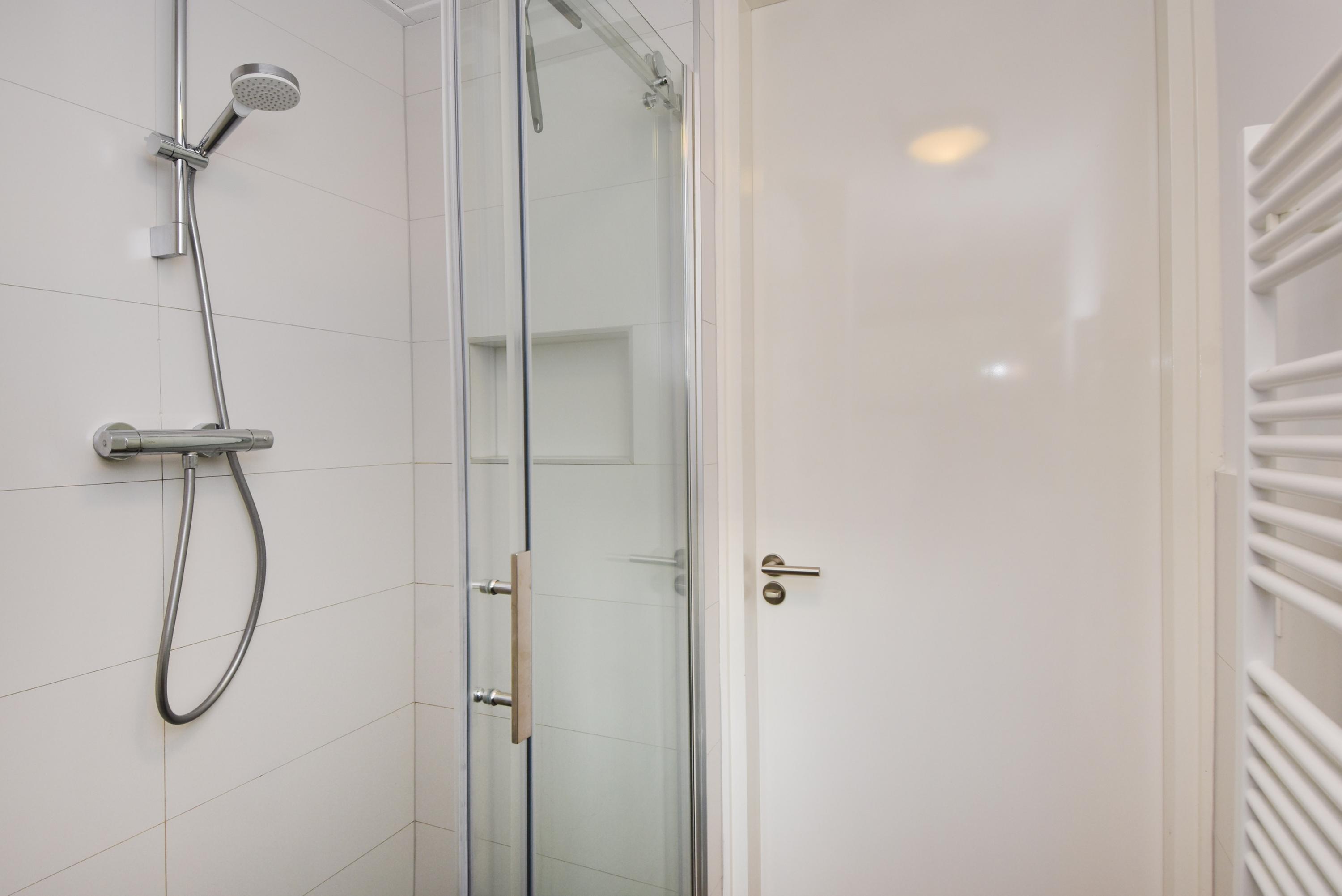 The hallway provides access to a utility room with space for a washing machine, dryer, freezer, etc., and to a luxurious toilet (wall-mounted) with washbasin. From here you also enter the master bedroom with an ensuite bathroom featuring a beautiful walk-in shower, bathtub and double washbasin with cabinet.