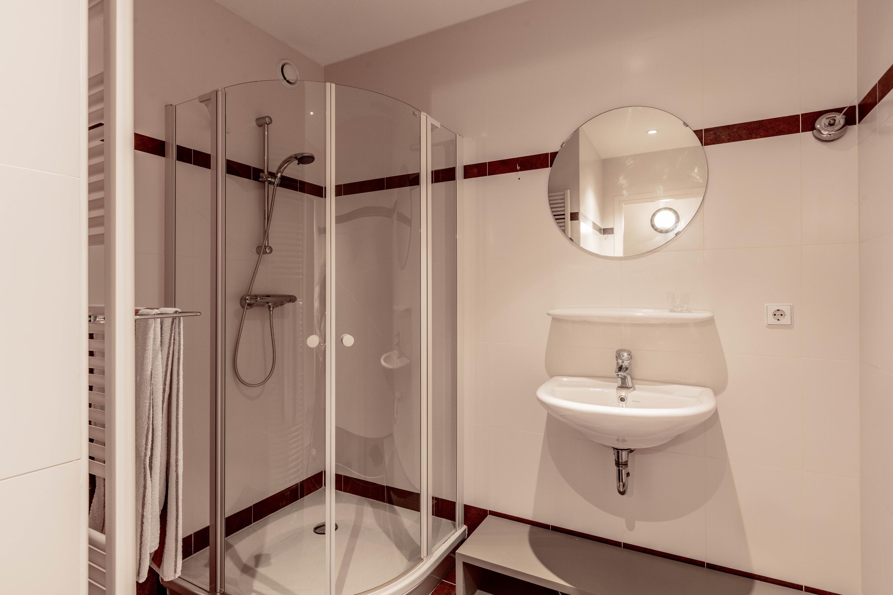 De tweede slaapkamer is ook voorzien van dakvensters en heeft eveneens een eigen badkamer met douche en wastafel.