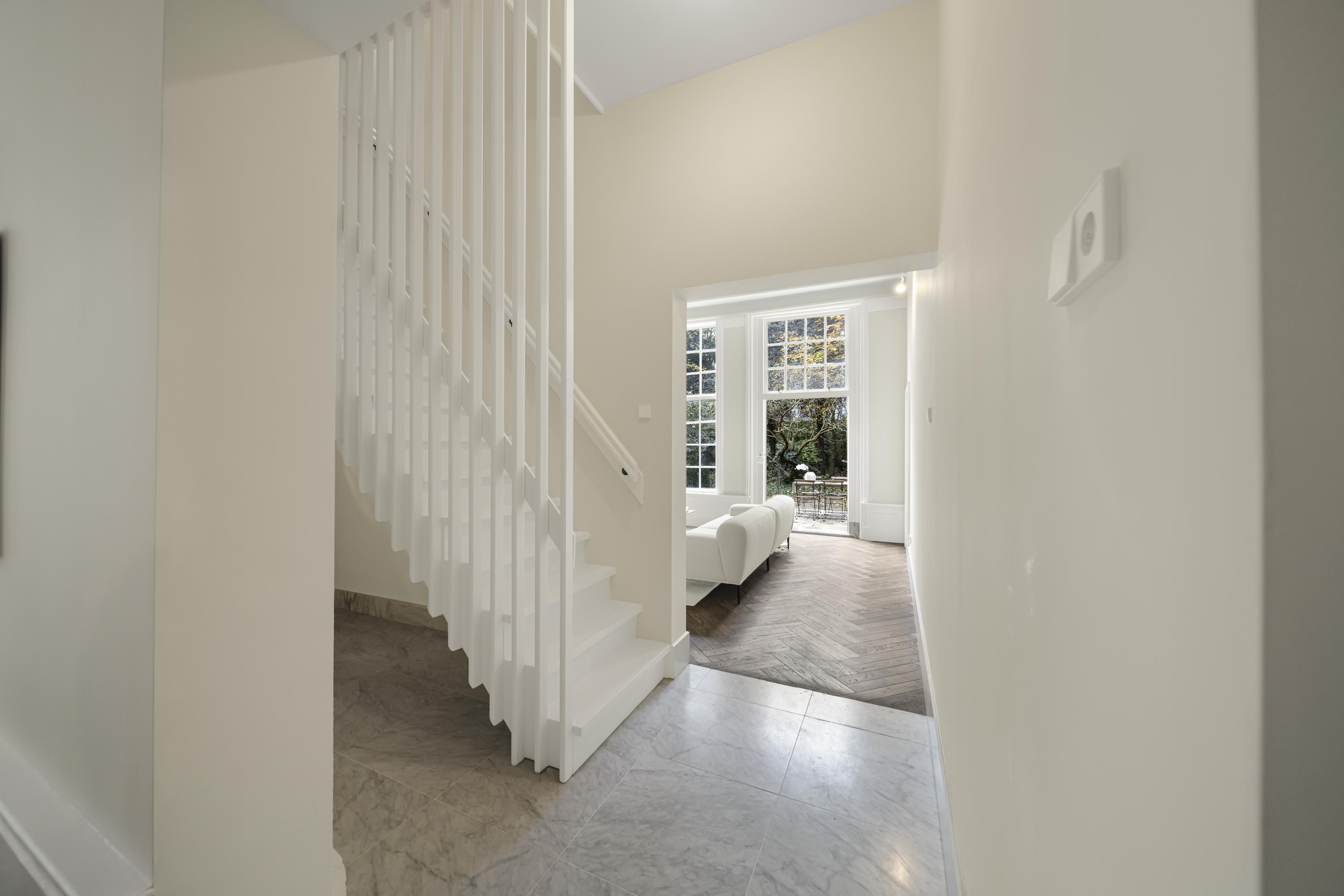 Entrance, long hallway, and impressive main hall featuring a classic black-and-white marble floor and monumental oak staircase. At the front are two rooms with original fireplaces—ideal as offices or consulting rooms. Adjacent is a spacious intermediate room that flows into the sunny, garden-facing living room with monumental fireplace.