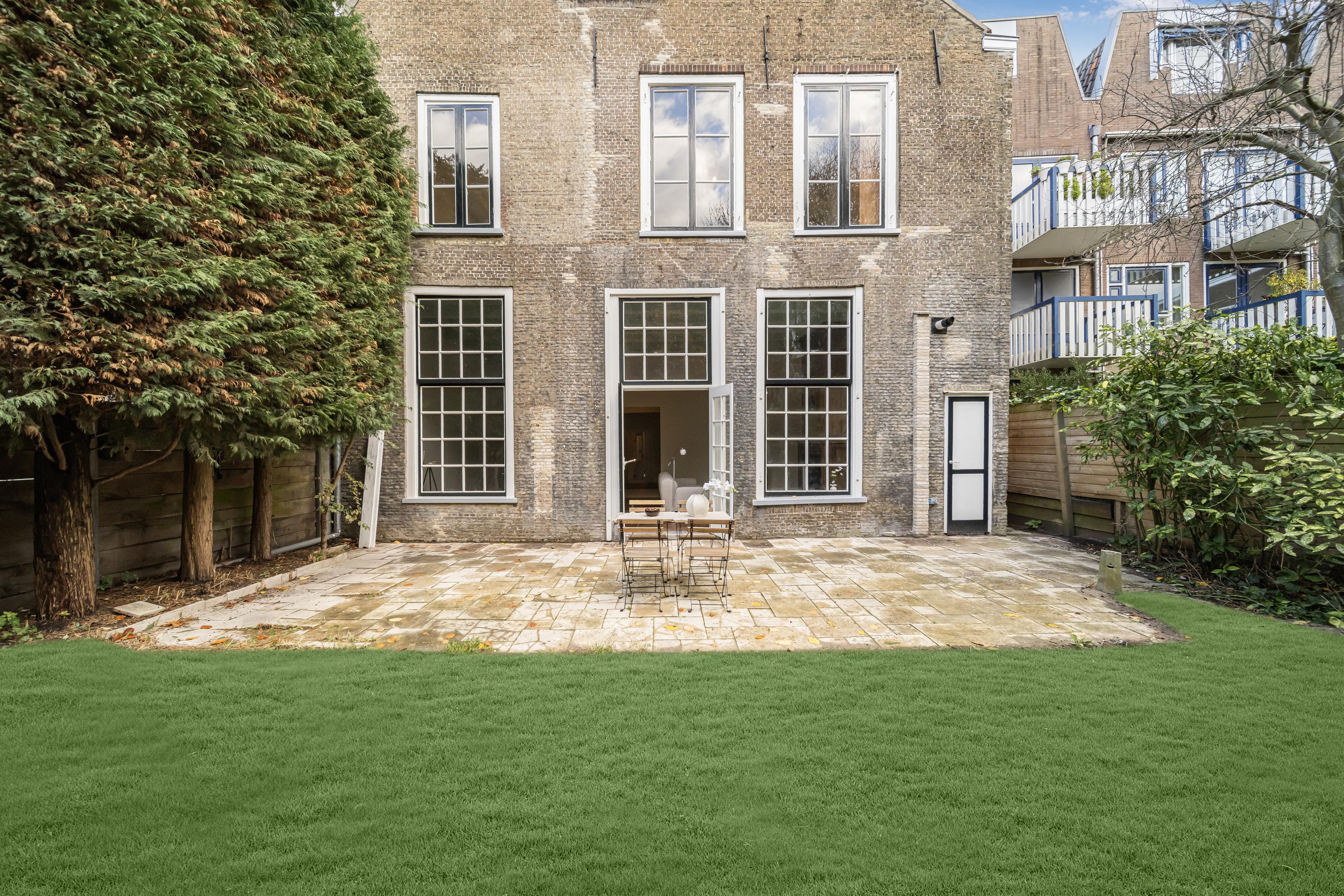 The L-shaped city garden facing southwest is an oasis of peace and privacy. With a full-width terrace, lawn, mature trees, and a storage shed, it offers a unique green retreat in the heart of the city centre.